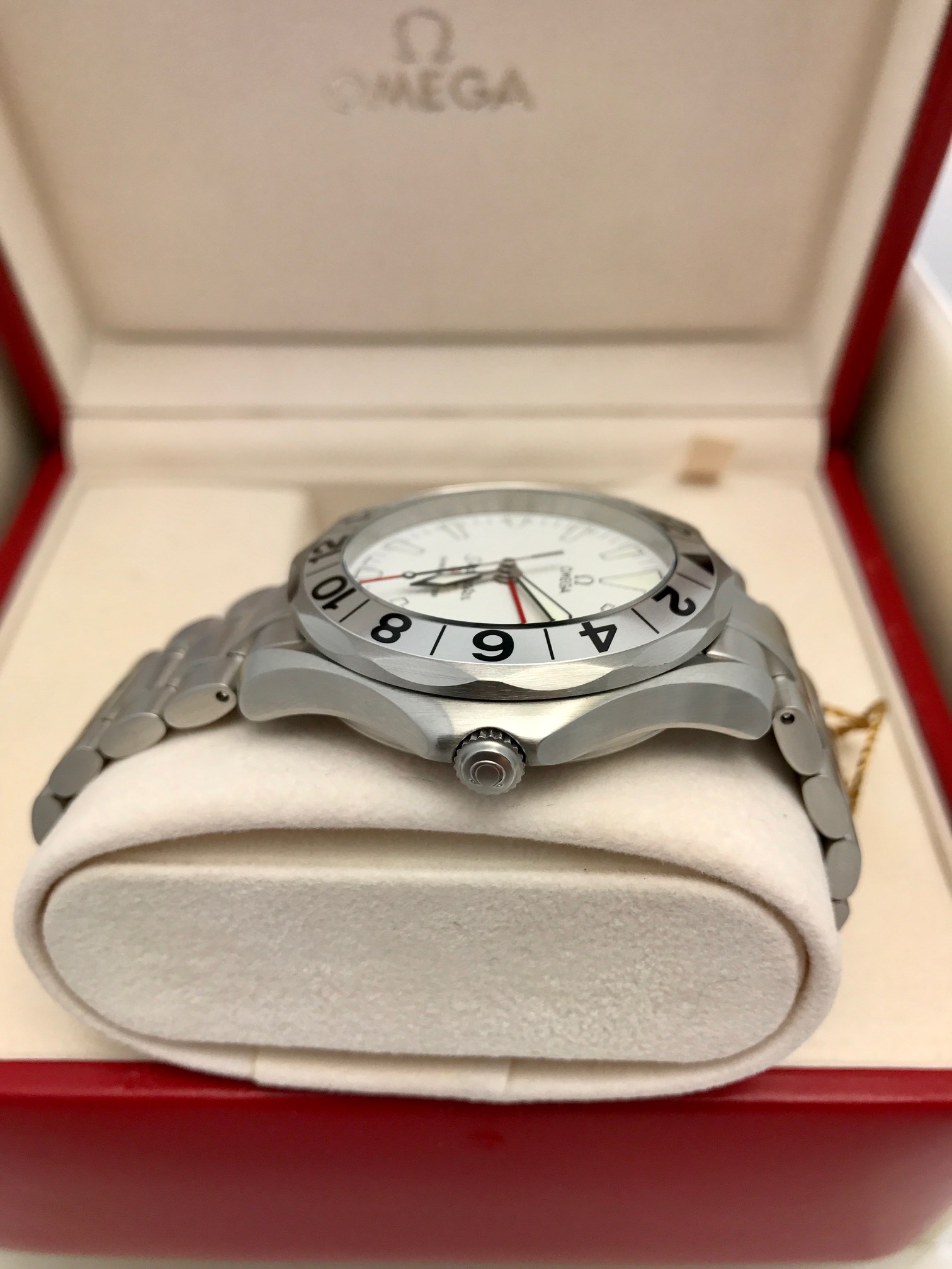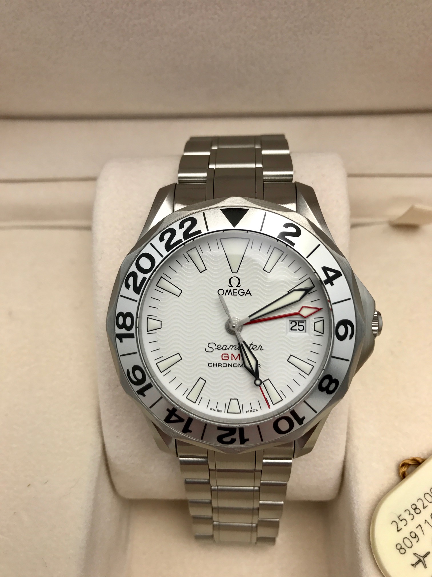 I have an Omega Seamaster Professional 2538.20 for sale. This is the white GMT version of the popular sword hand series. Also known as the “Great White”. Runs great and all functions tested. See pictures for condition (click on them for higher quality). Watch is unpolished and mint!