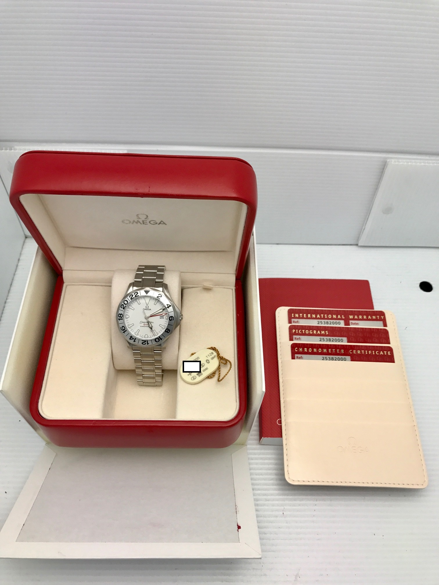 Accessories: Both Omega Boxes, Manuals, Card Holder, Chronometer card, Pictogram, Warranty Card, Serial Tag