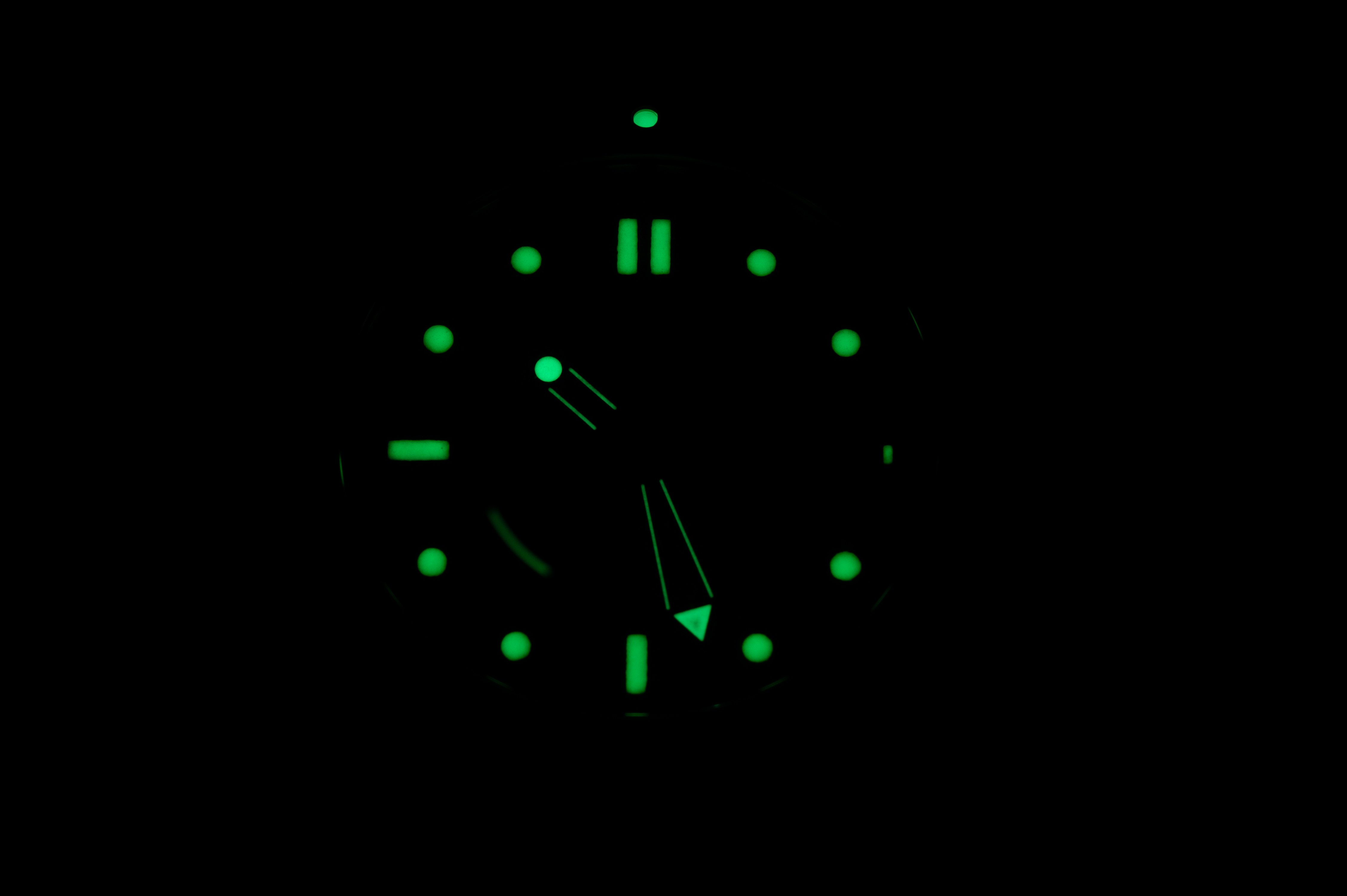 For the lume shot below I did a 5 seconds exposure under complete darkness, so the seconds hand moved 5 seconds during that time. That's why it shows as a streak of blur from 35 to 40 seconds.