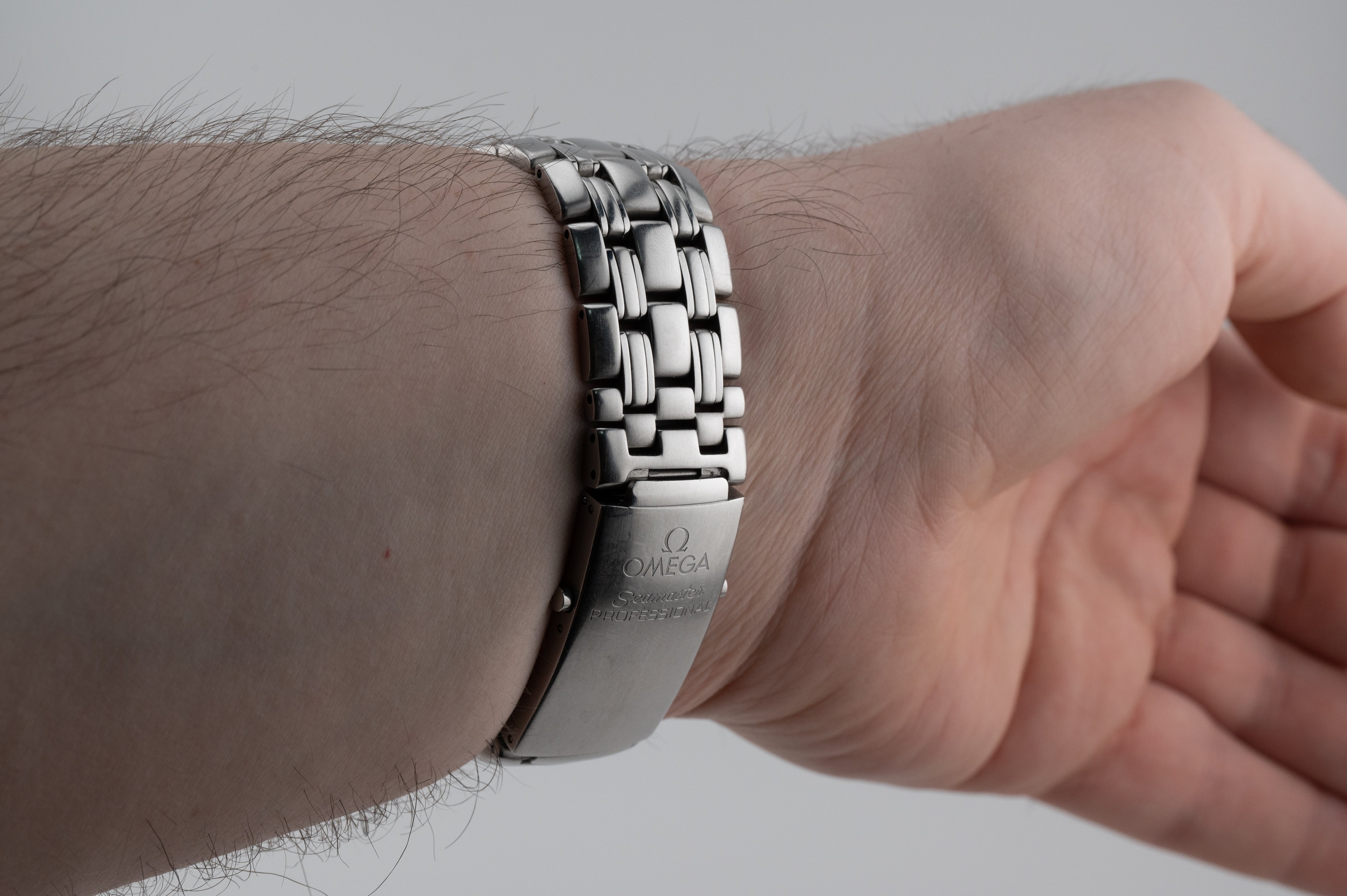 It fits perfectly on my 19 cm (7.5") wrist. If you have a bigger wrist, you'll need extra links which I believe are available from Omega, or sold plentiful online. It measures 16.8 cm (6.6") in circumference from lug to lug.