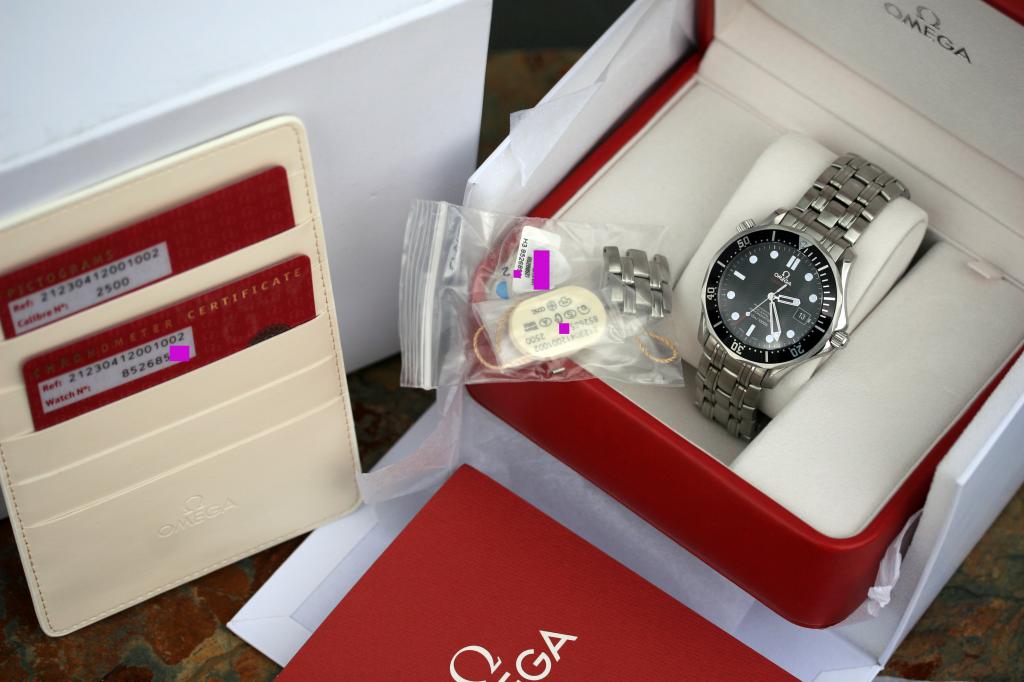 Watch comes with Omega boxes, manual book, all cards except for warranty card, hang tag, and original caseback sticker with serial number.