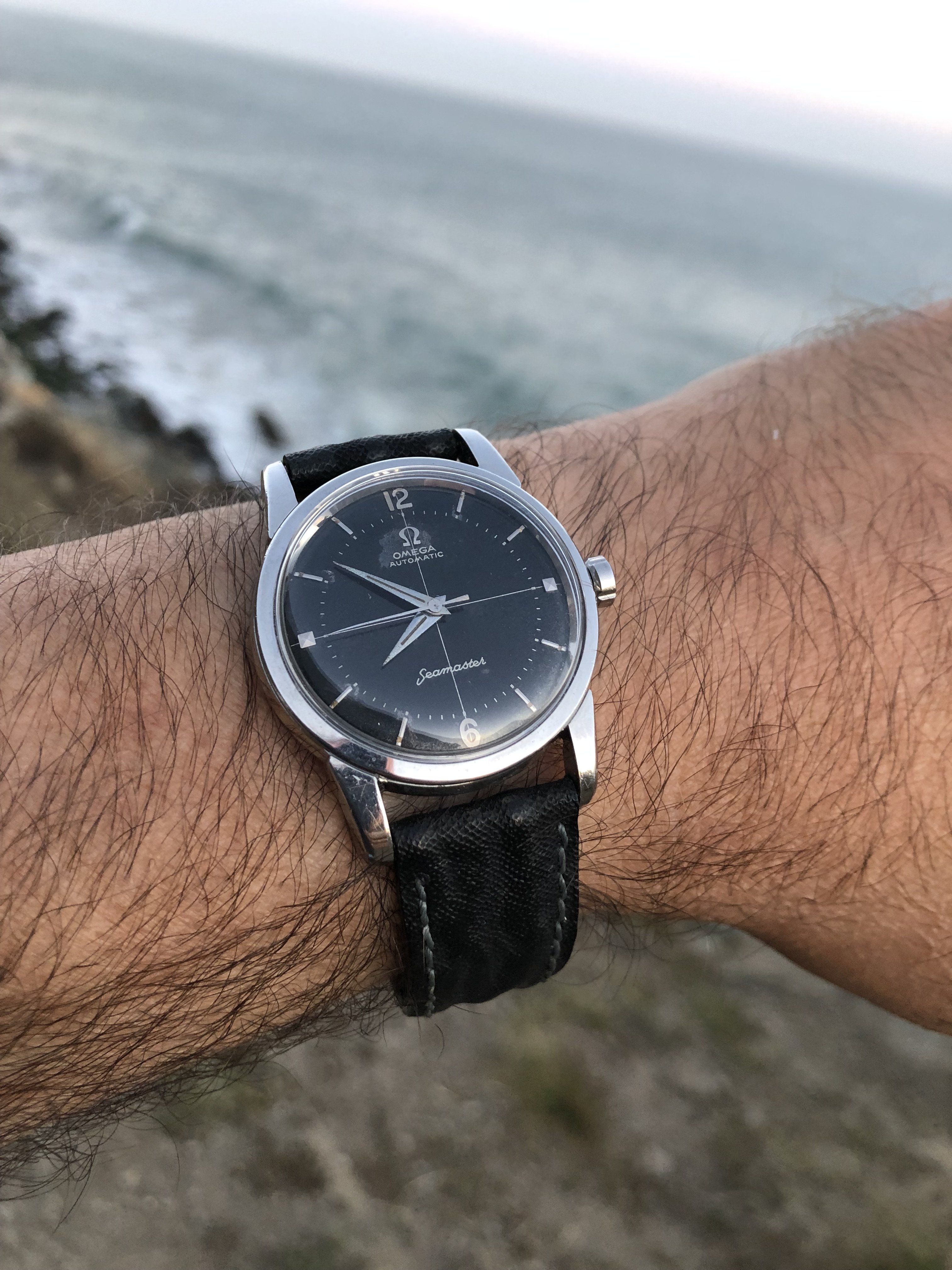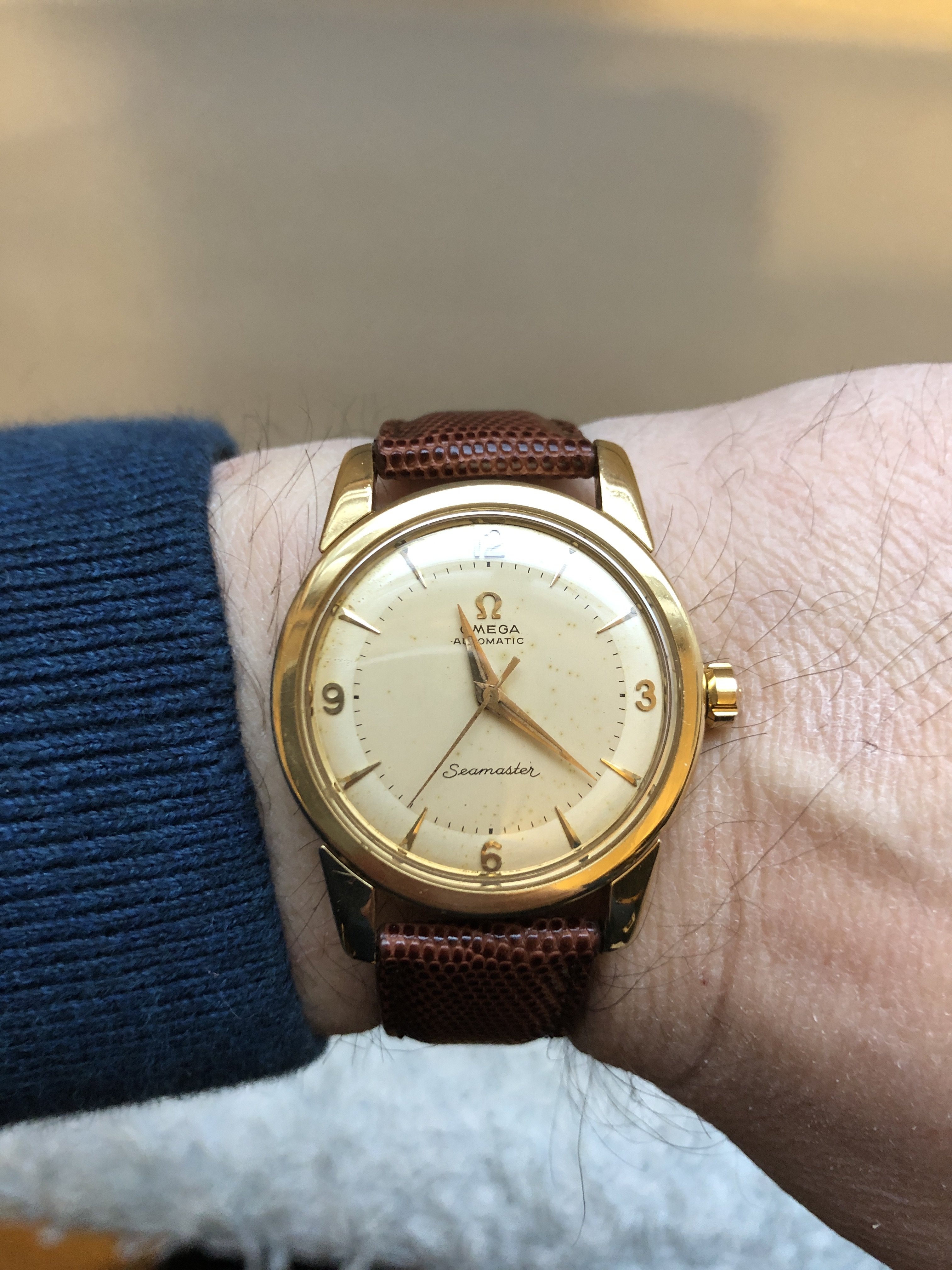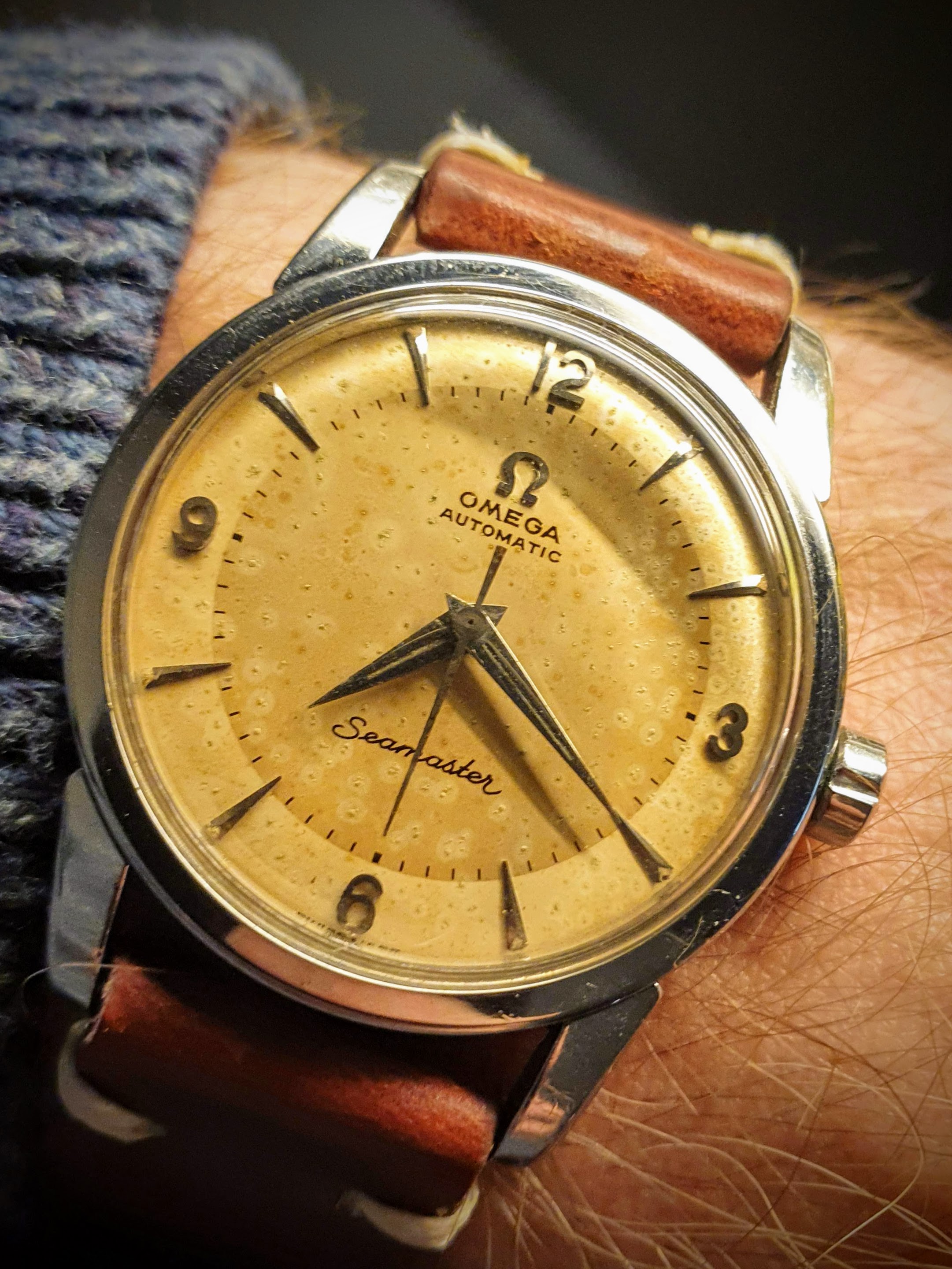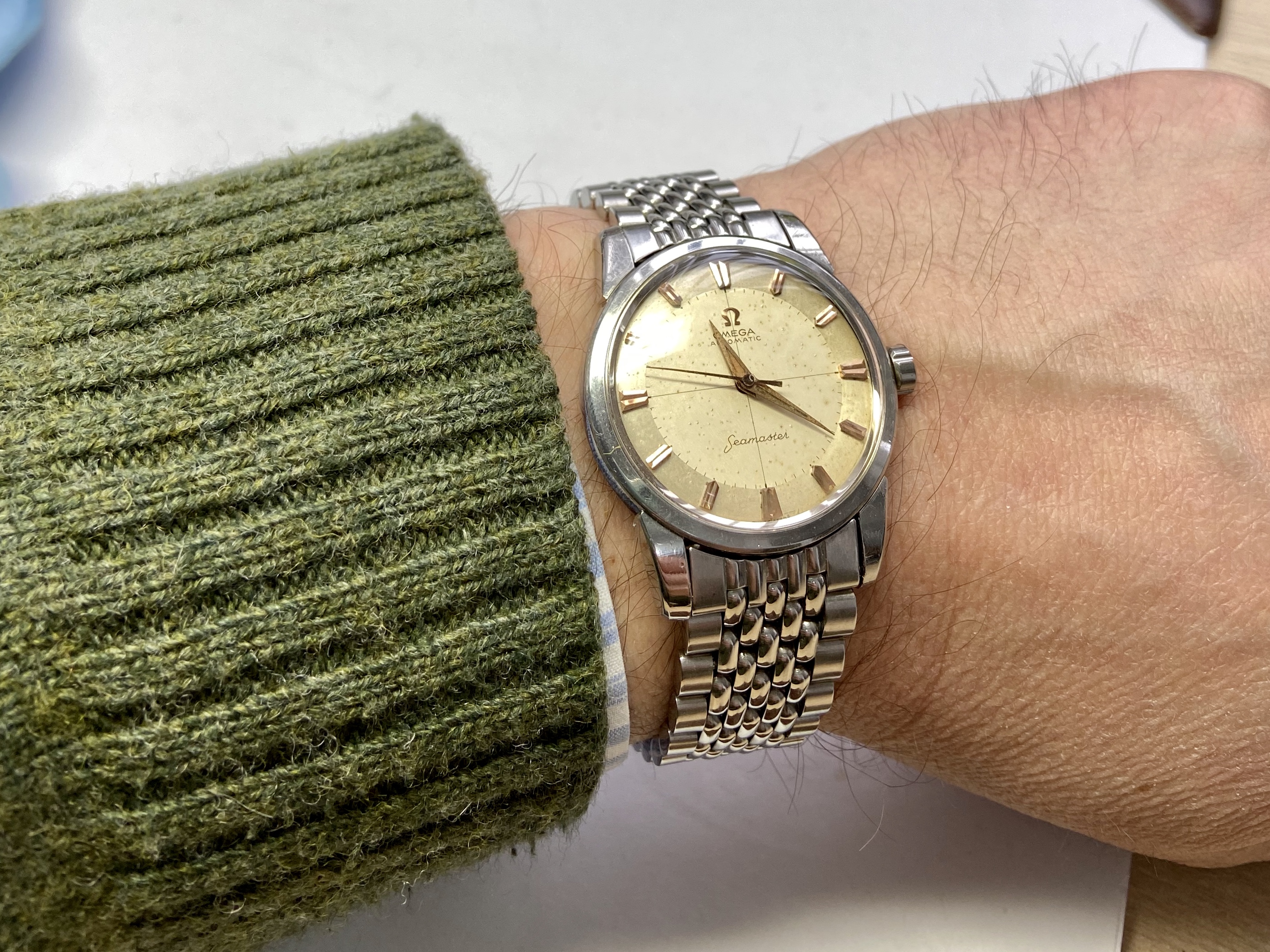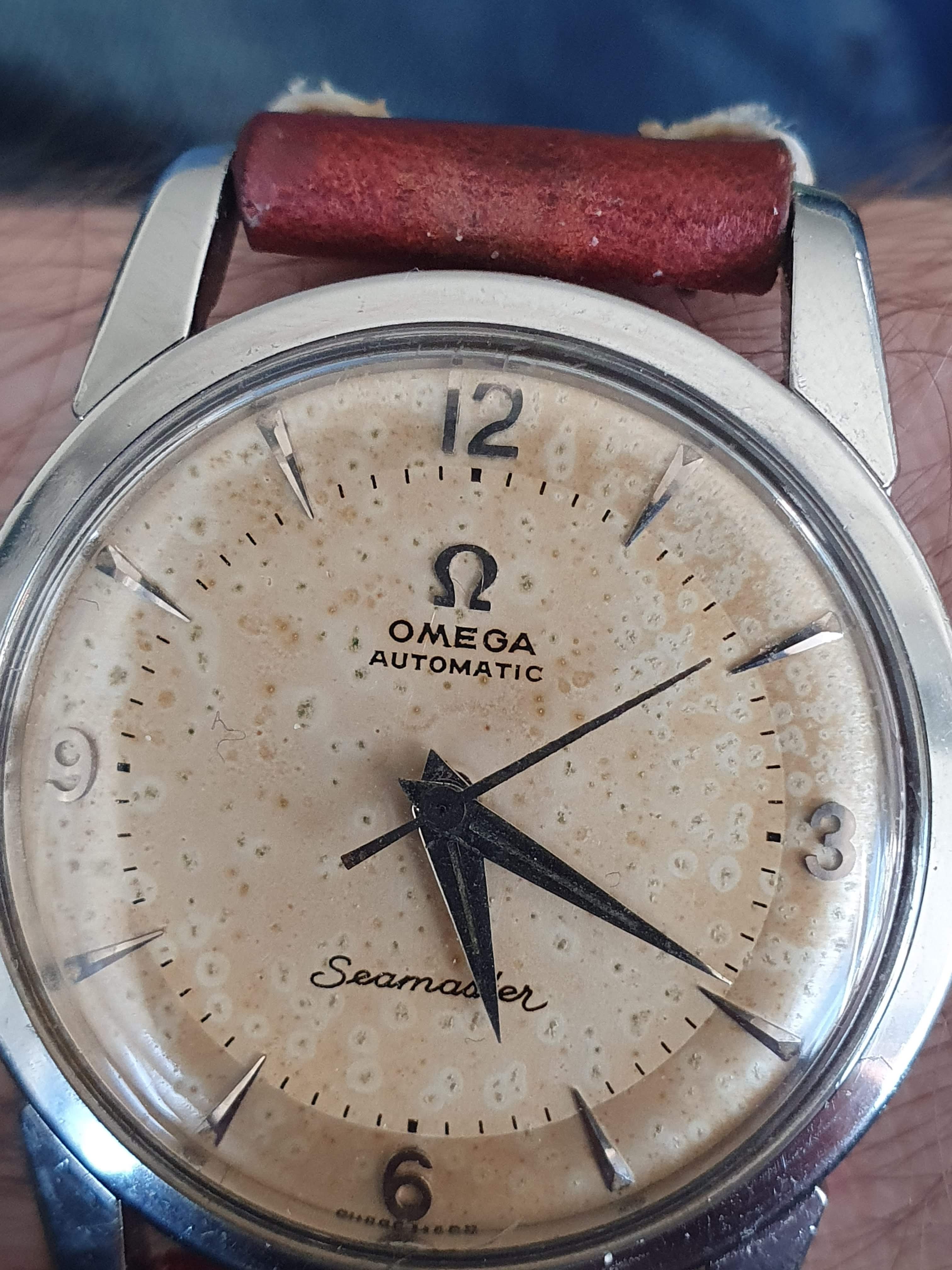 Here is my Seamaster 2846 from 1956 (according to its movement serial number). Dial is quite damaged (spots) and the case was polished at some point leading to not so sharp edges but I can live with that. It is powered by an automatic cal. 501 with 20 jewels. The signed crown should be correct. I quite like the two tone dial and the applied numbers and indices.