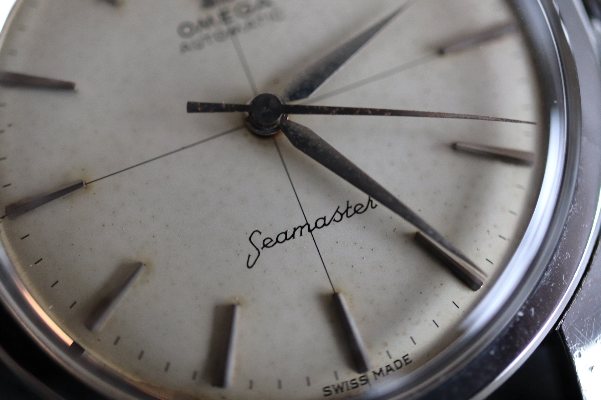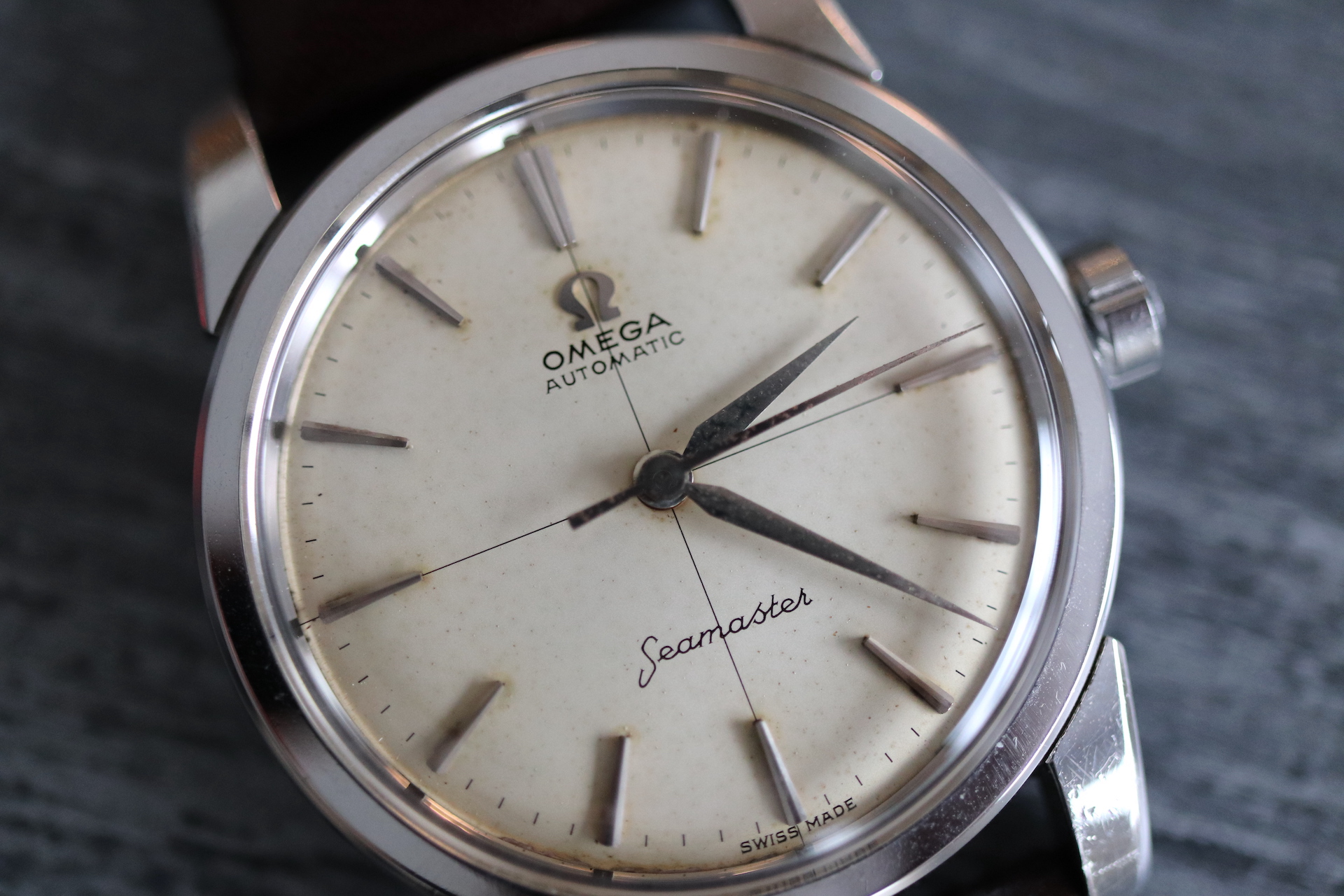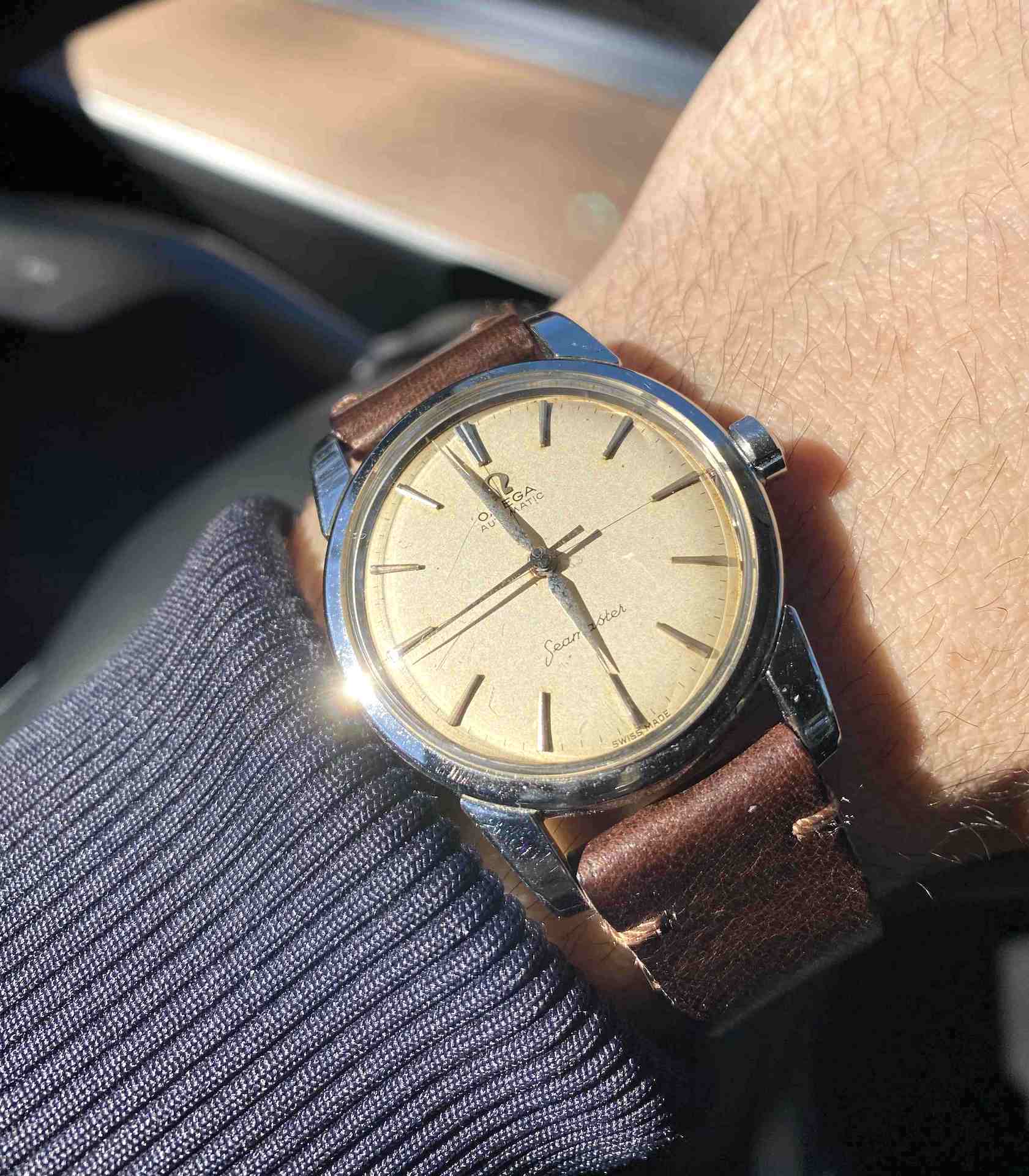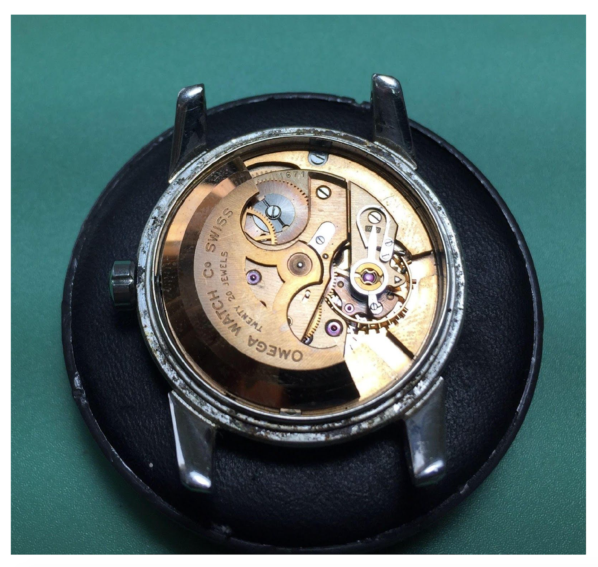 ·For sale, I have an Omega Seamaster Ref # 2856 15 SC. It has the Caliber 501 which is an automatic movement. Serial number would suggest the watch is from 1958 to 1959. Case measures 34 mm. Watch was serviced in June 2019 and comes with documentation including pictures of the work that was done. Mainspring and crystal been replaced and a crack on the bezel been laser welded. Watch will come with a new brown leather strap. The movement photo provided is Pre service.