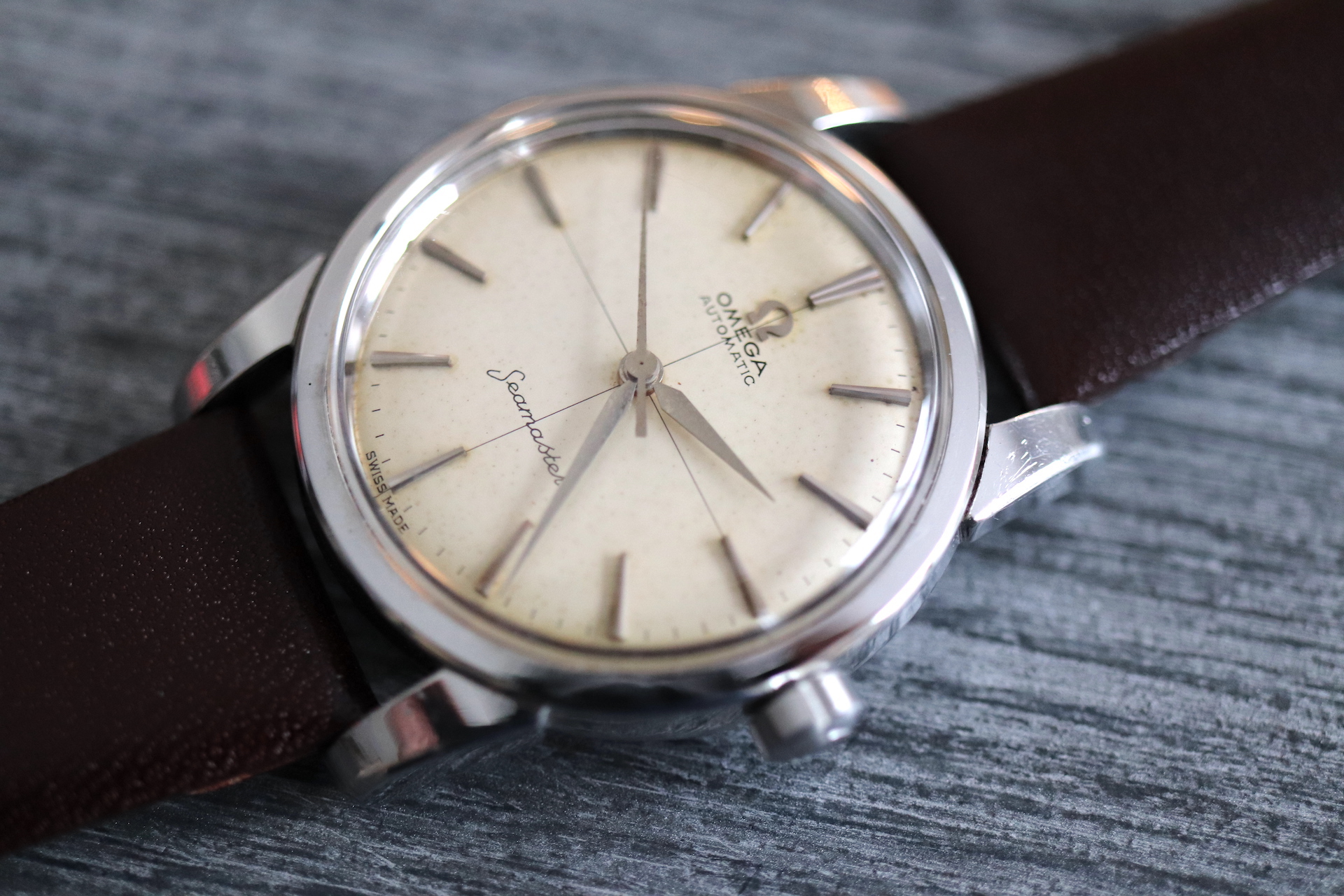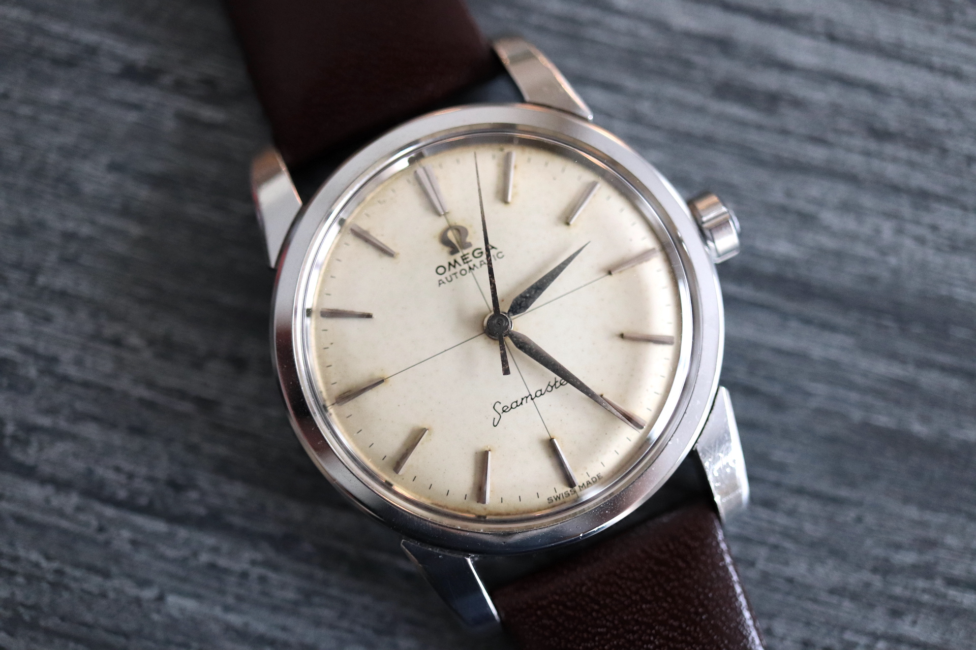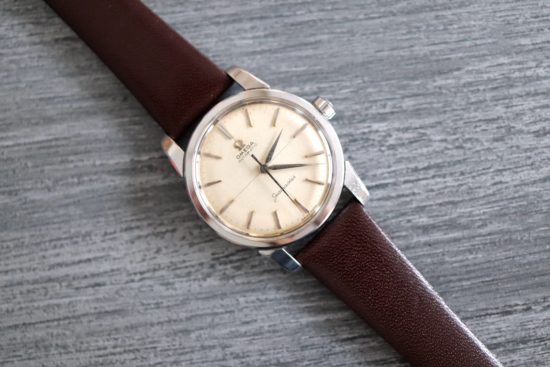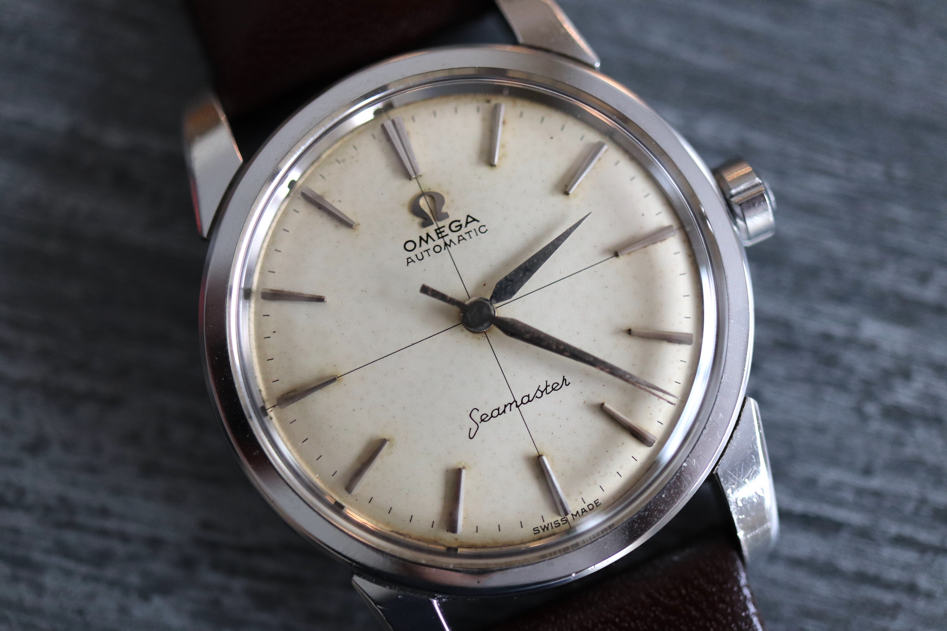 ·For sale, I have an Omega Seamaster Ref # 2856 15 SC. It has the Caliber 501 which is an automatic movement. Serial number would suggest the watch is from 1958 to 1959. Case measures 34 mm. Watch was serviced in June 2019 and comes with documentation including pictures of the work that was done. Mainspring and crystal been replaced and a crack on the bezel been laser welded. Watch will come with a new brown leather strap. The movement photo provided is Pre service.