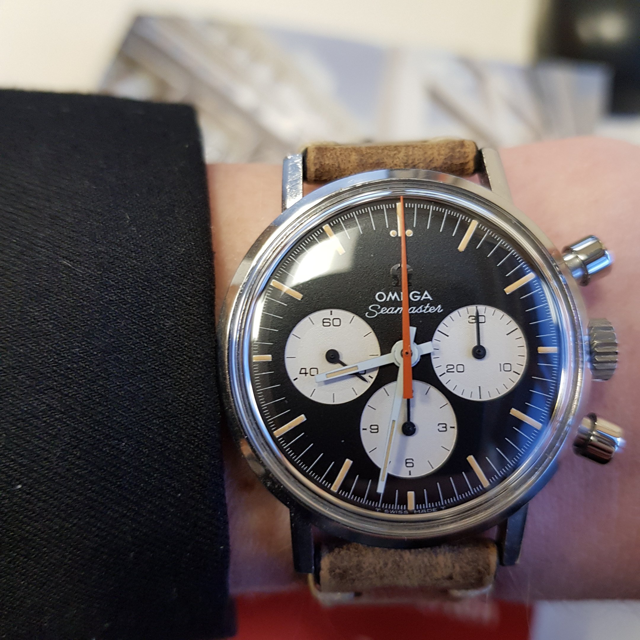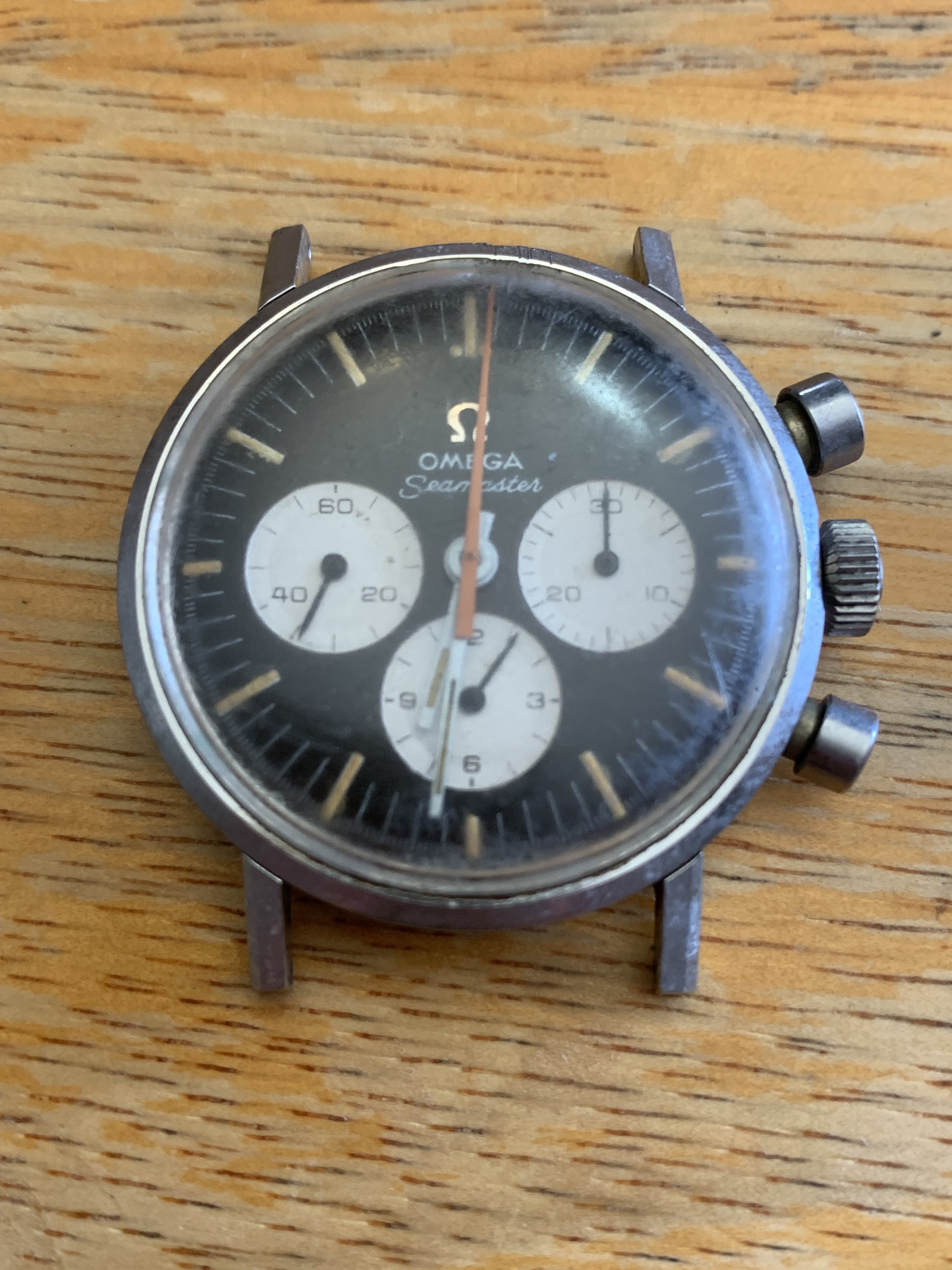 From what I understand an Omega Seamaster Reverse Panda. I believe the bracelet is original to the watch, No.12 Stainless Steel Omega 18mm Ends. I am not exactly sure what I acquired, so here I am on the premier Omega Forum. Also, looking for quality restoration companies that you (the professionals) would recommend. Currently, the watch does not run. Winds normally, but with no "action". Sets time as expected.