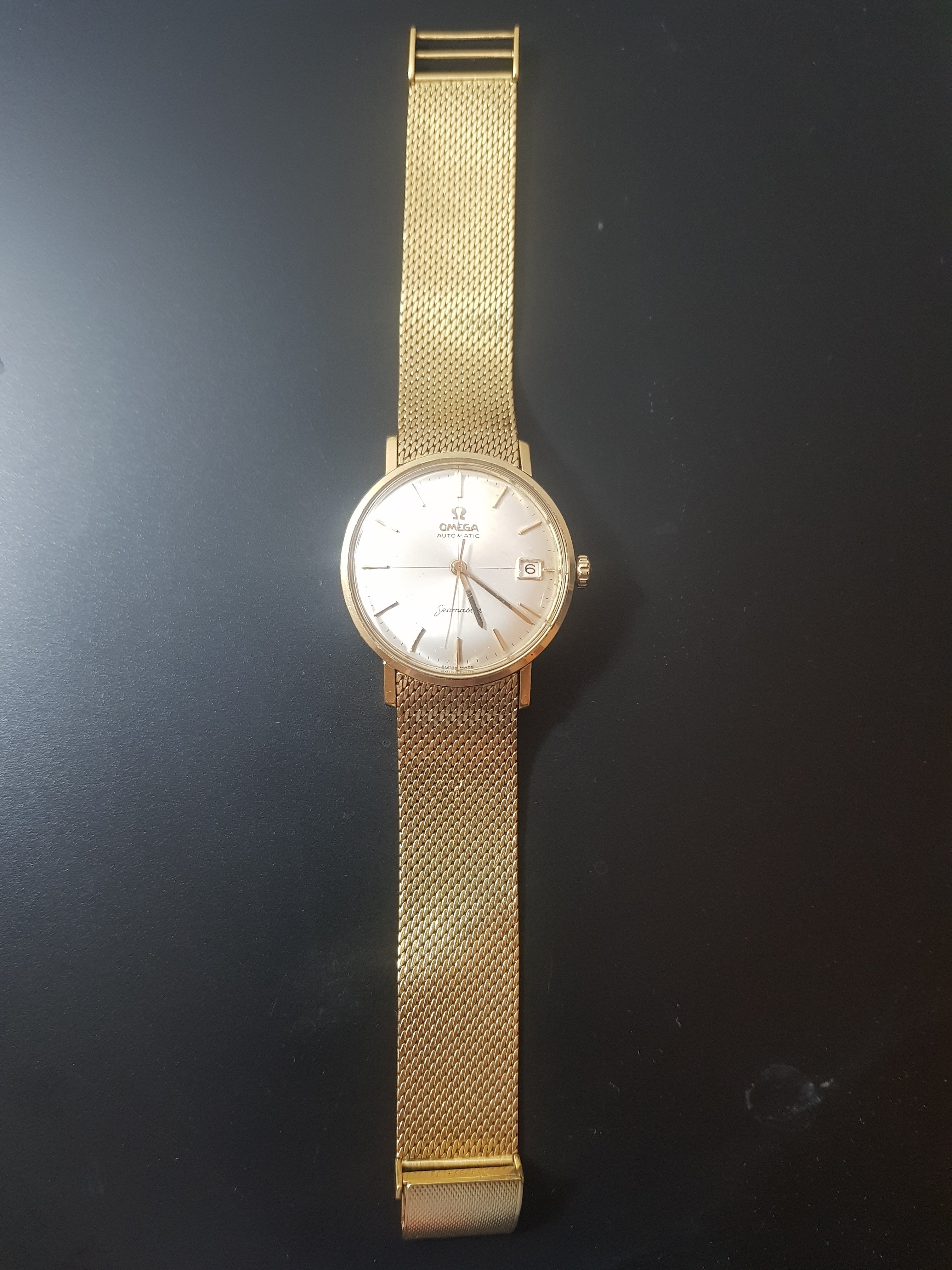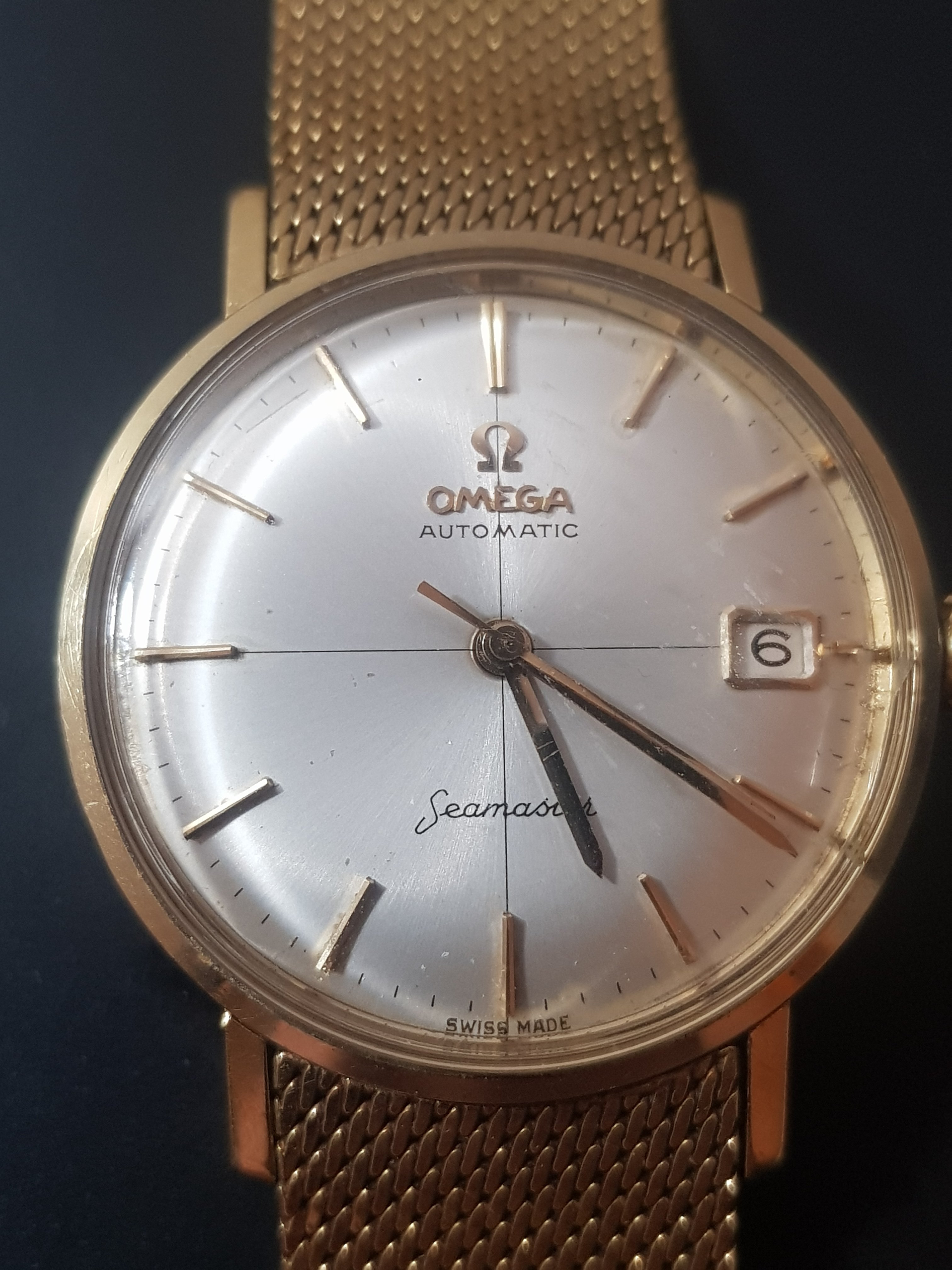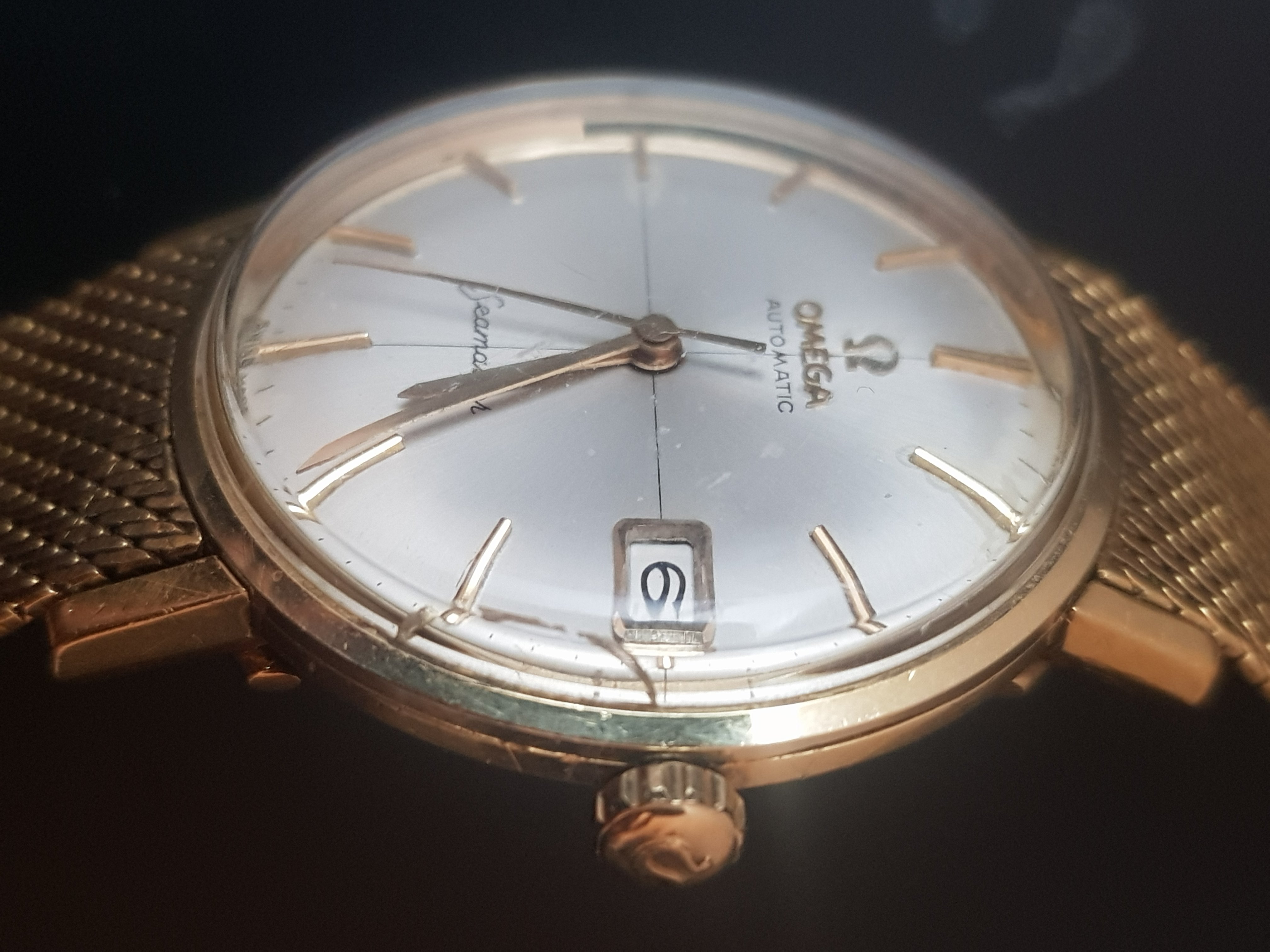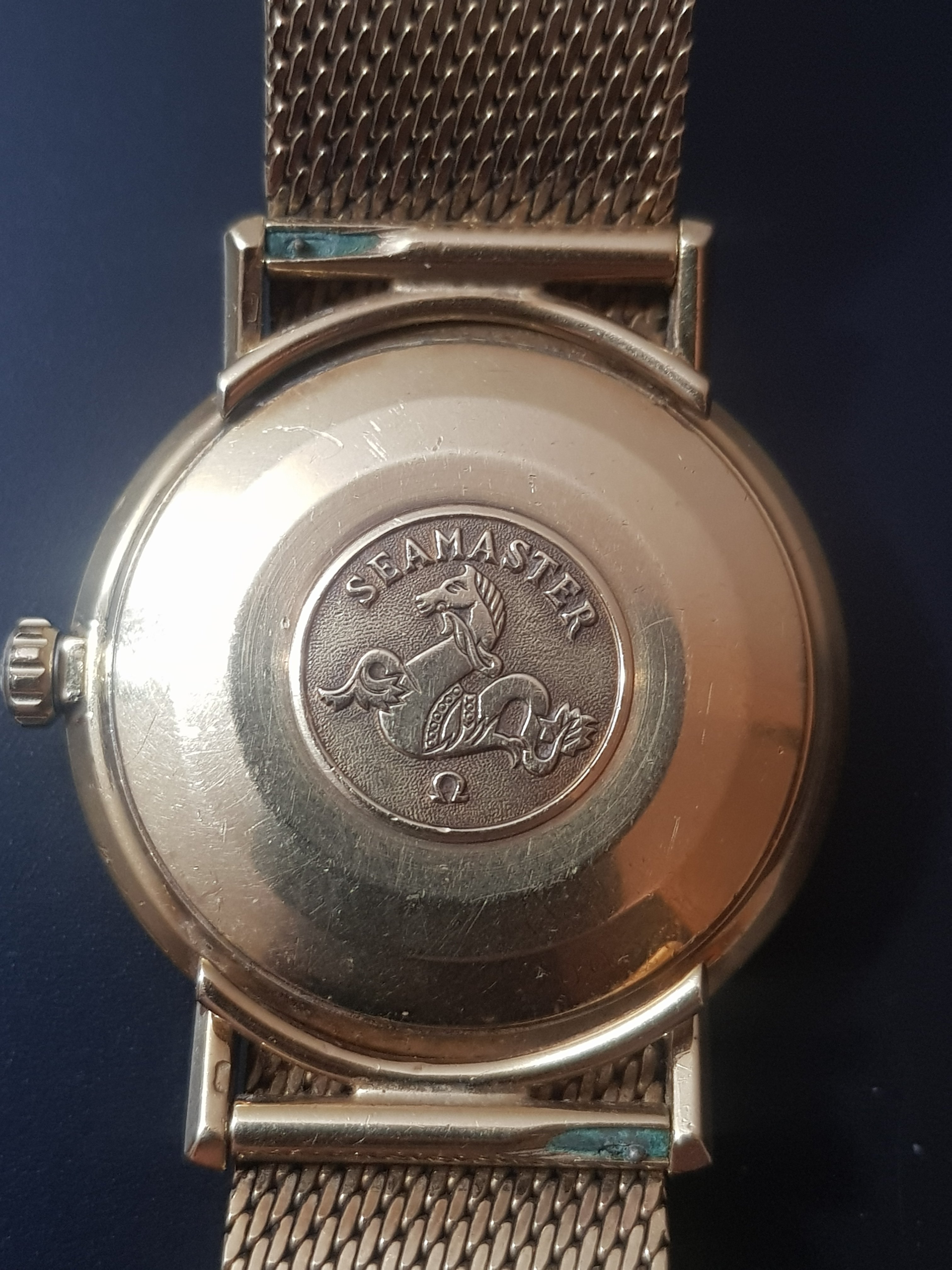 So what I know so far. 18k Gold, Seamaster around before 1963 because it doesnt say de ville on it? It has a crack in the glass. Still functional. I've read so far that the crosshair design is quite common.