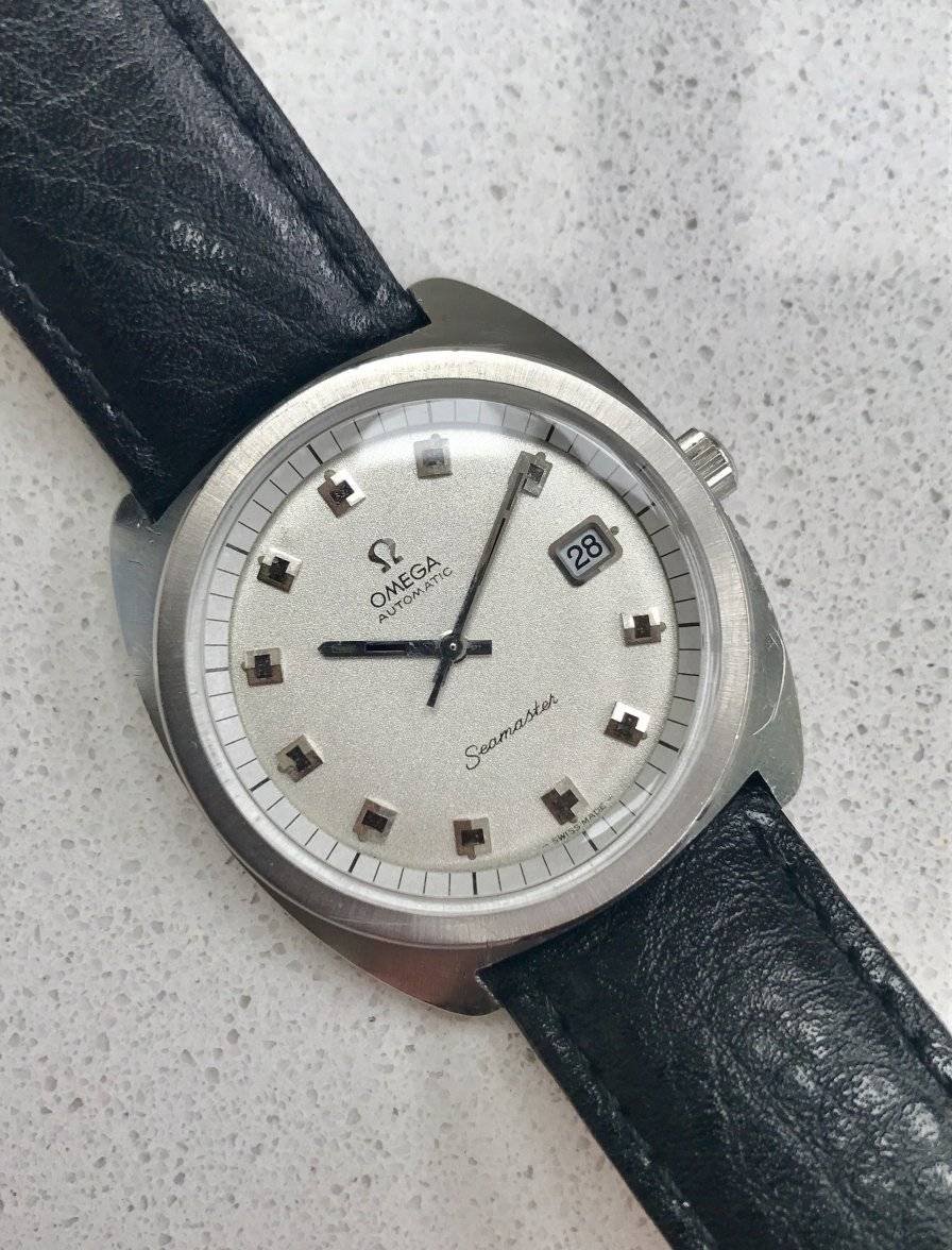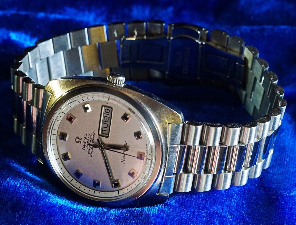 ·While spending a couple hours scouring the web for an excellent and affordable Omega ref. 168.022 with a “sparkle dial”, I come across this handsome watch, the reference 168.034, also a “sparkle”, with a chronometer movement. This model was totally off my radar, and this led to a bit more research. Finally, convinced that this was the real deal I pulled the trigger. A few minutes later I also ordered a bracelet I felt would complement it. I knew from the configuration that locating the correct Omega one was going to take a minute, and I wanted to wear it. It arrived a couple of days later from Japan looking better than the photos.