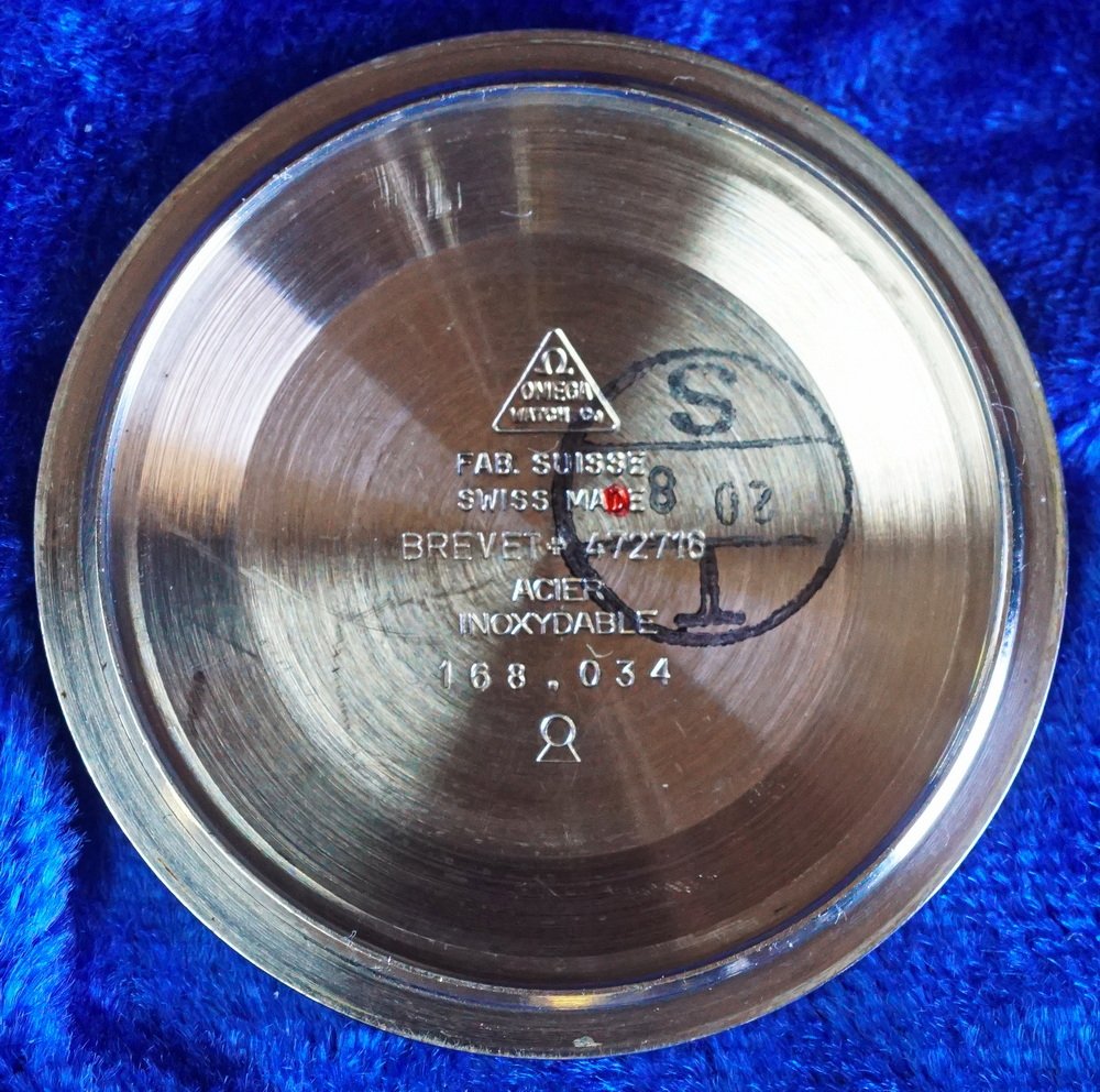 Inside Caseback inscription: Omega symbol above “Omega Watch Co”, inside a triangle; Fab. Suisse; Swiss Made; Brevet; Swiss Cross; 472716; Acier Inoxydable; 168.034; Stylized Hardhat. In ink: “20” and “8”, with “T” above and “S” below, in circle.