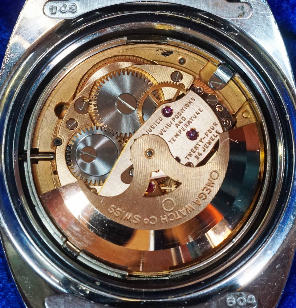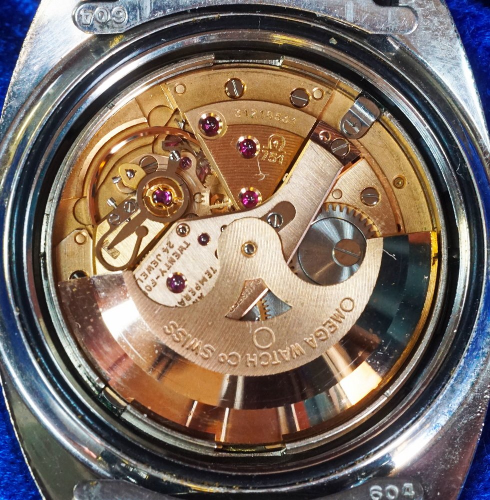 Engraving on movement: On Rotor: Omega Watch Co, above a circle. On Bridges: Twenty-Four 24 Jewels; “751” below Omega symbol with a “1” inside it; 31216531. Moderately decorated with nice copper plating.