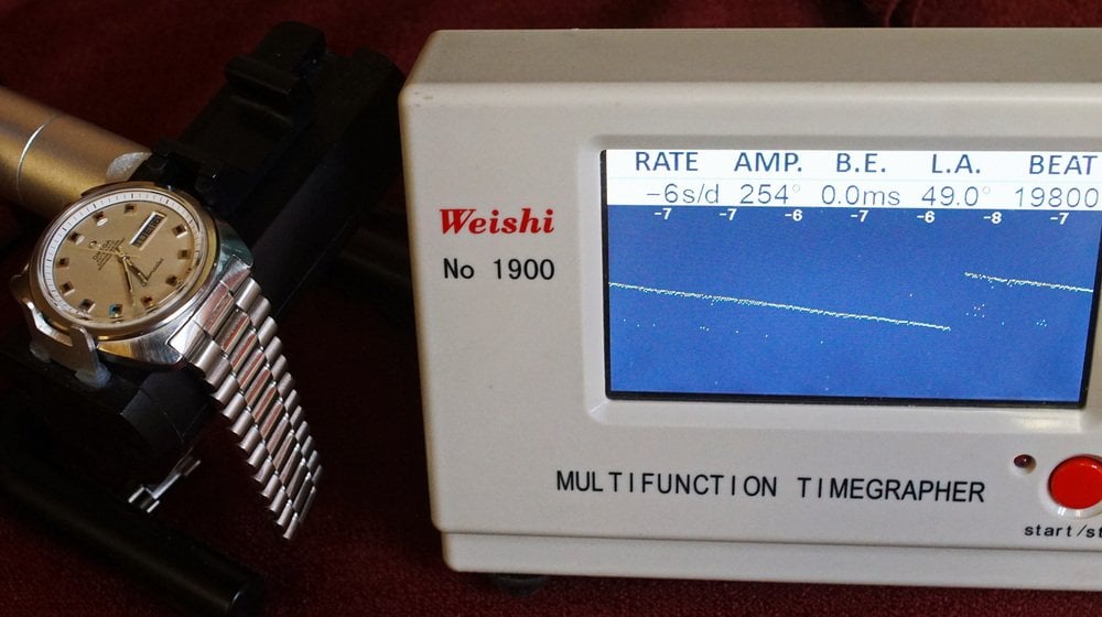 Timegrapher 1900 readings: -6 to -8 seconds a day; 254 degrees of amplitude; 0.0 milliseconds of beat error; 49 degrees lift angle