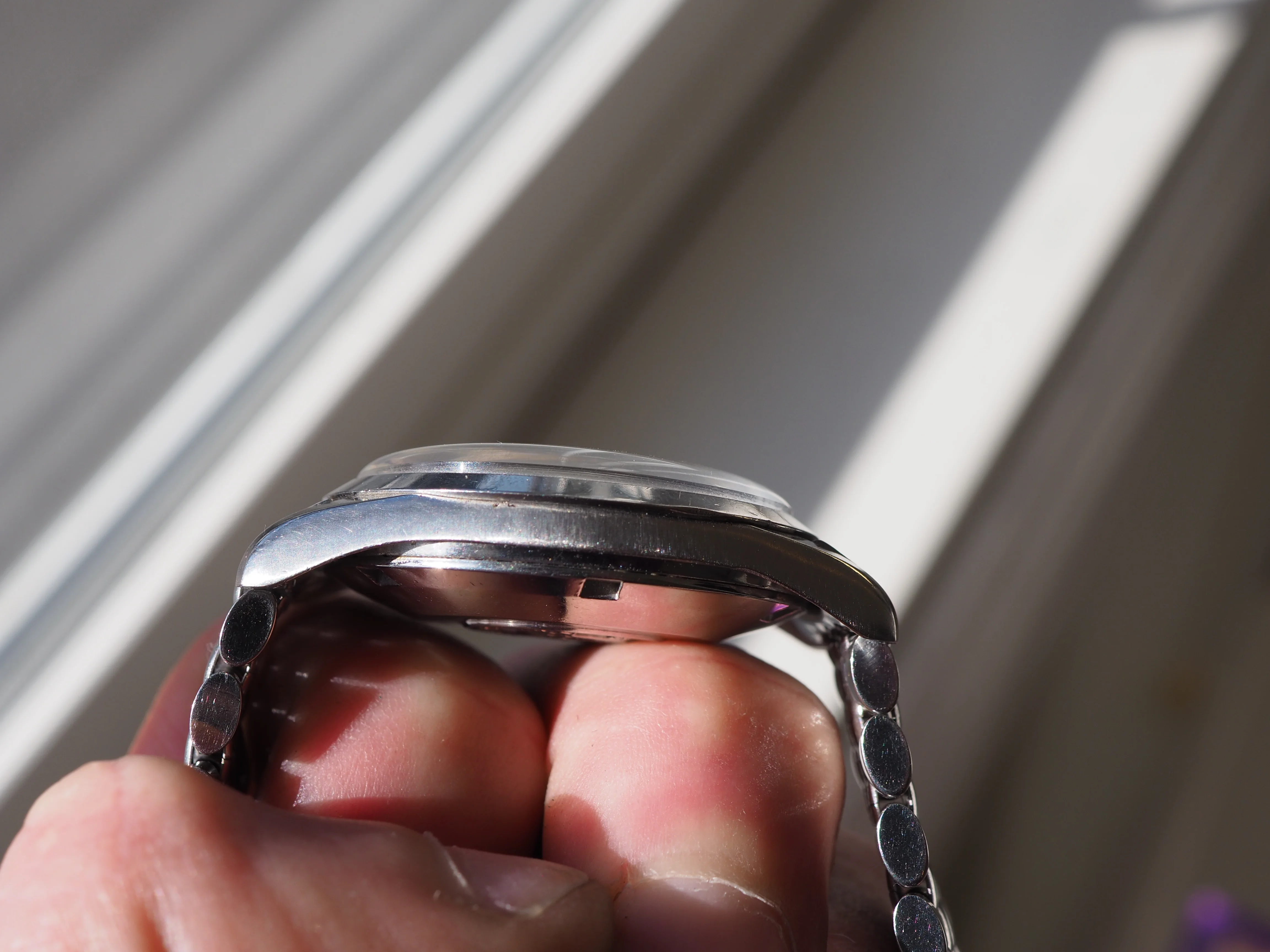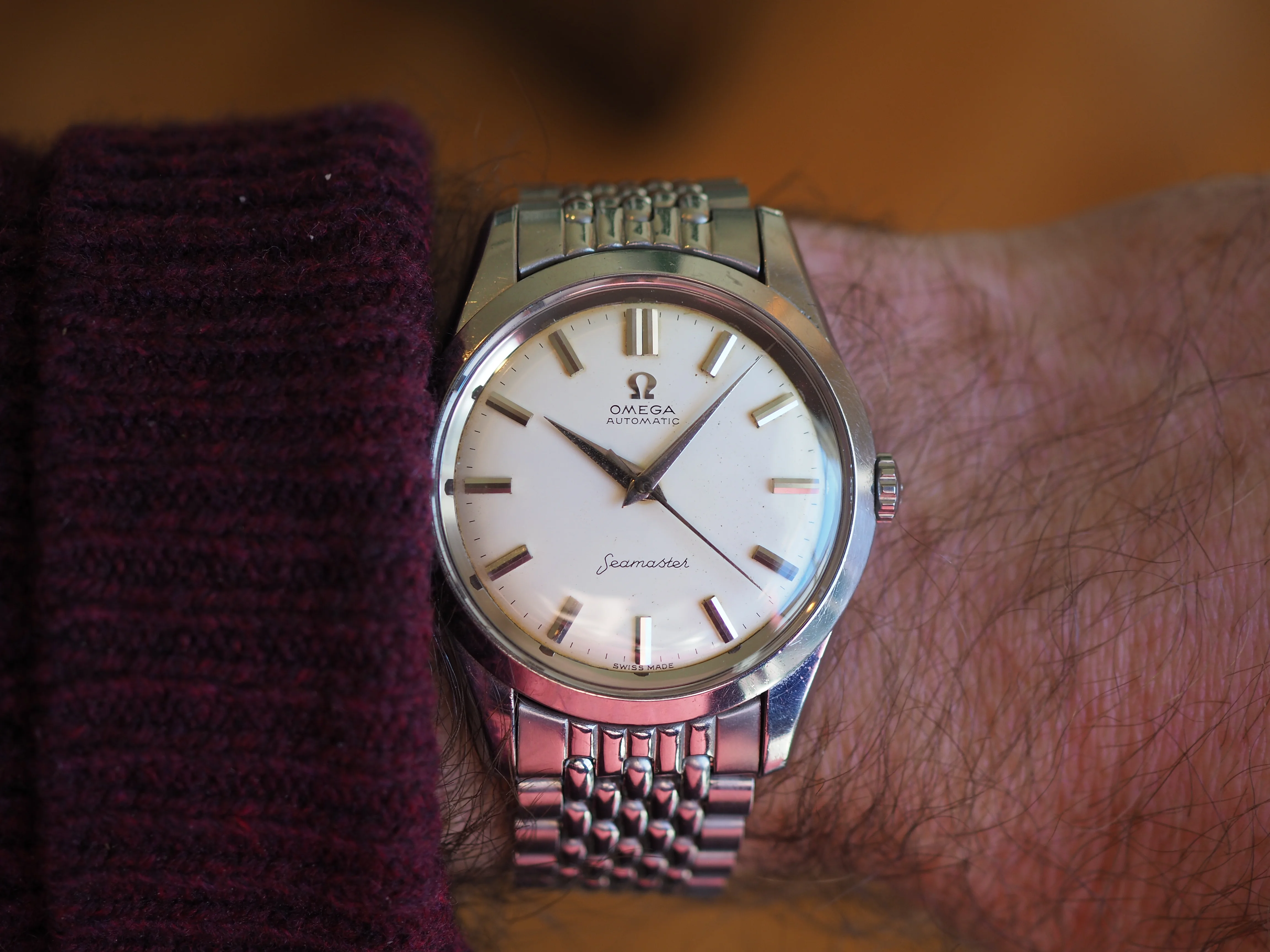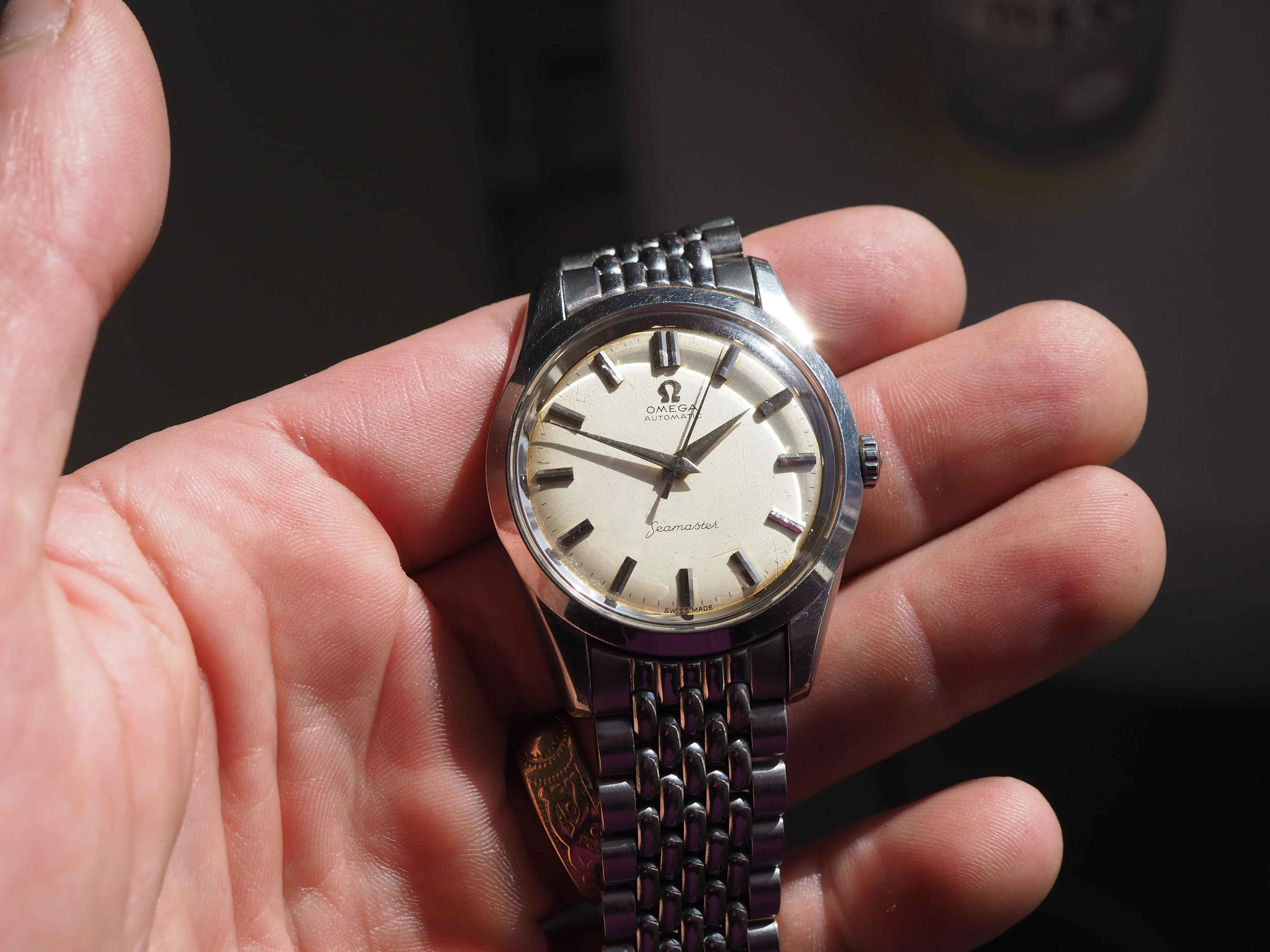 ·I am holding myself firm to a one in, one out policy so I need to sell this watch. It is a non-luminous ref 14710 Omega Seamaster Special from 1960-1962. The movement was serviced May 2021 by Kelly Hunter at Art of the Watch. It runs well, but it has been 5 years since its last service. The watch shows signs of age, but is in good overall condition with the correct crown. The bracelet no significant stretch, but it is quite short. It fits my 6.5" wrist with no room for expansion. I have taken pictures in bright light to highlight any flaws. There is a slight brown patina around the edge of dial that is visible in bright sunlight (see last photo), but it is unnoticeable in indoor lighting.
