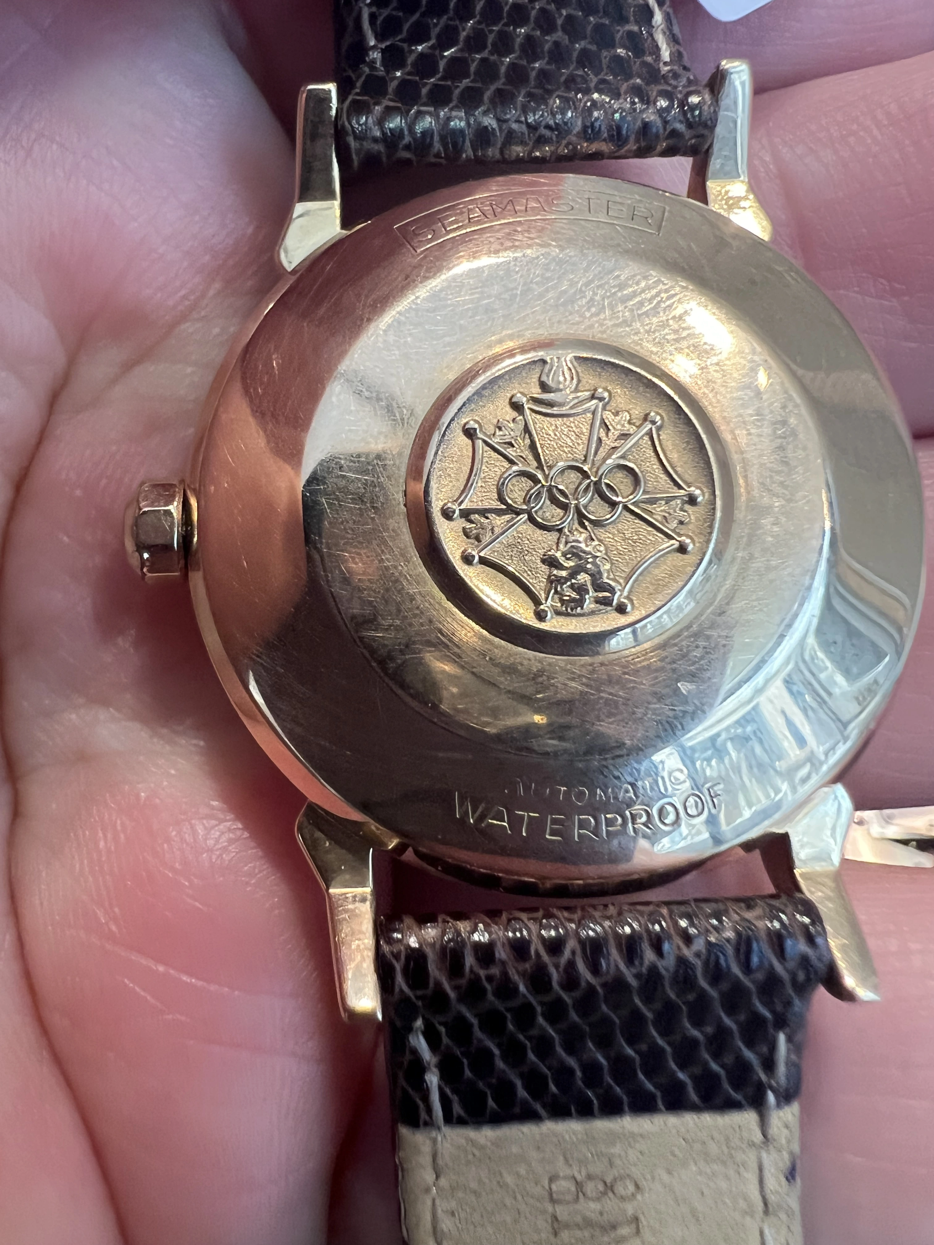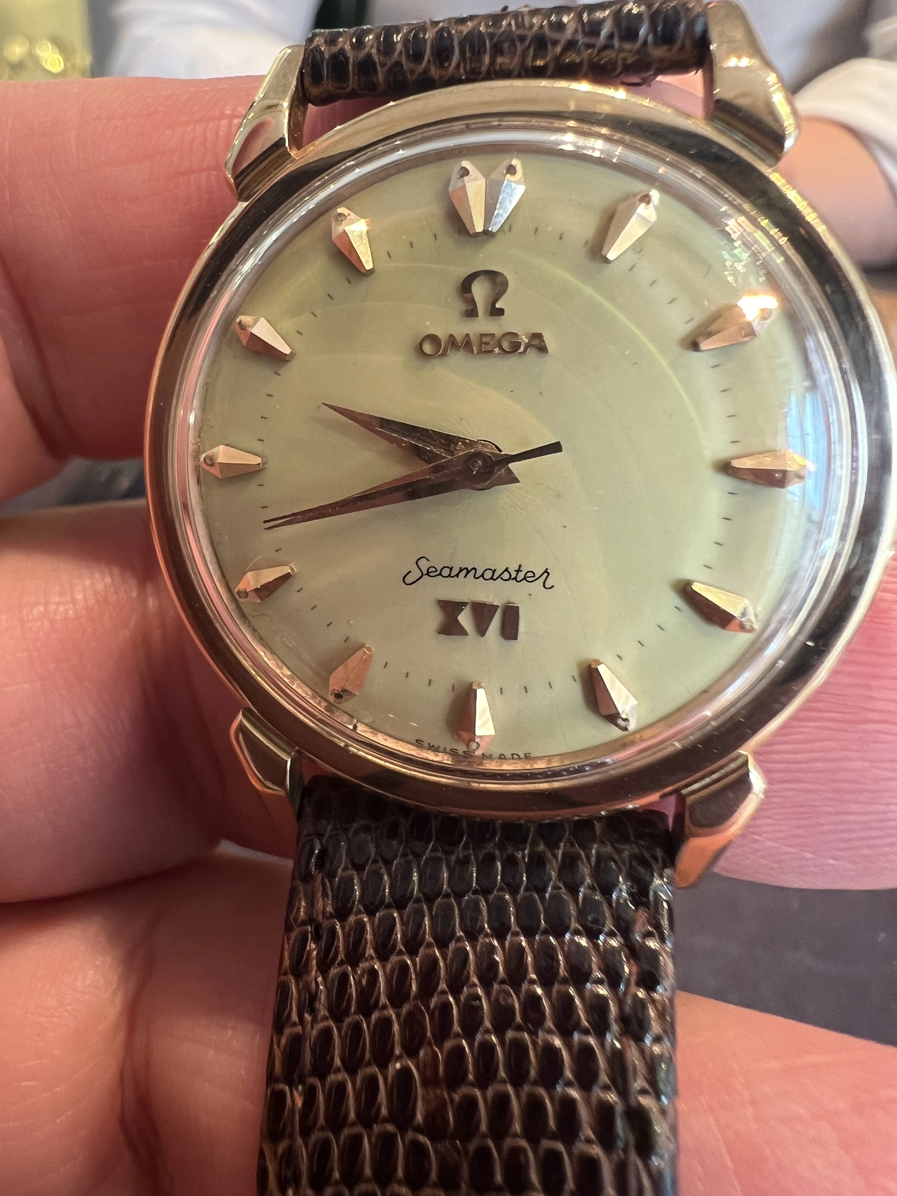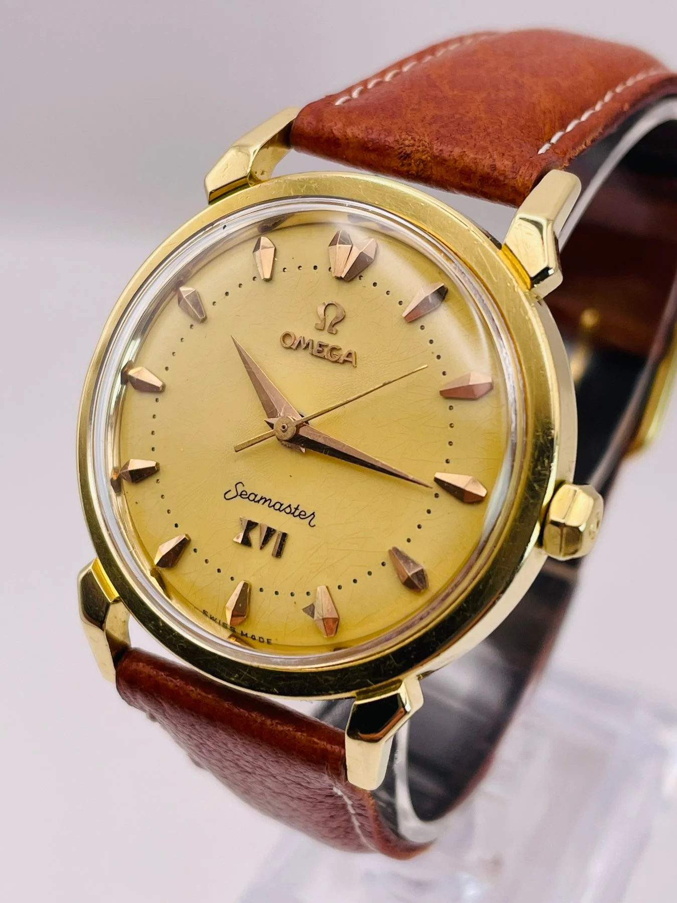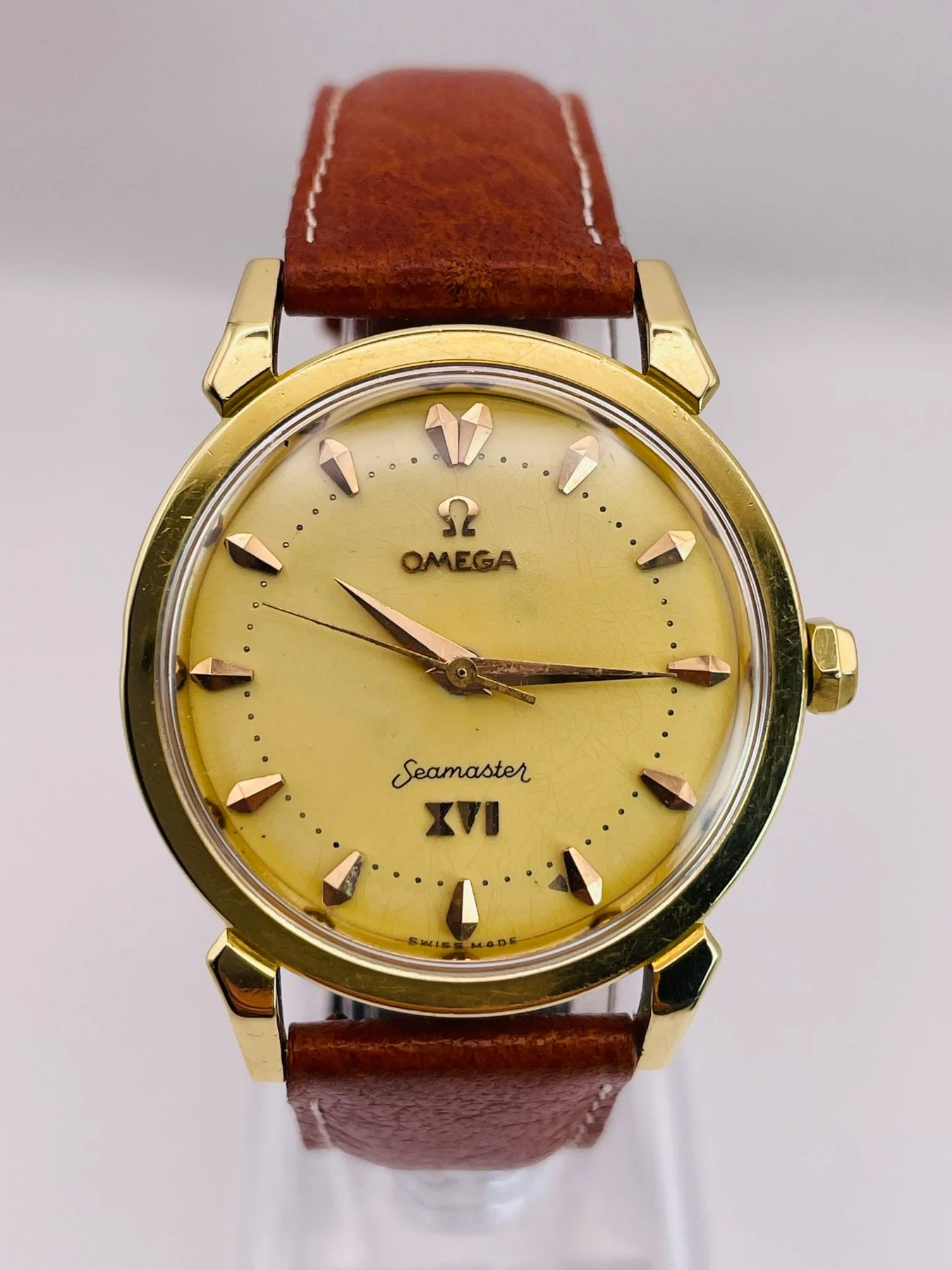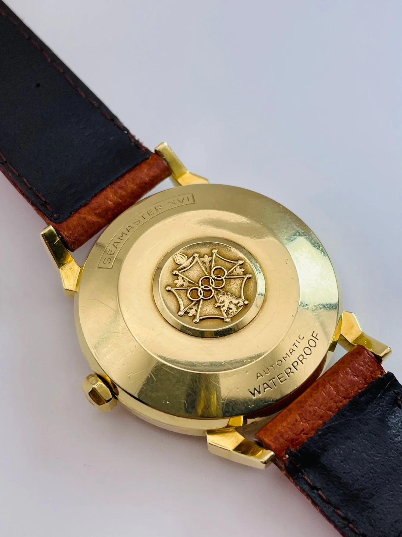 ·I'm looking at a vintage Omega Seamaster XVI commemorating the 1956 Melbourne Olympics (ref. 2850, 18k yellow gold case, Cal. 471 automatic). It's the commercial version with the Roman numeral "XVI" above 6 o'clock, champagne dial, faceted/cut hour markers.