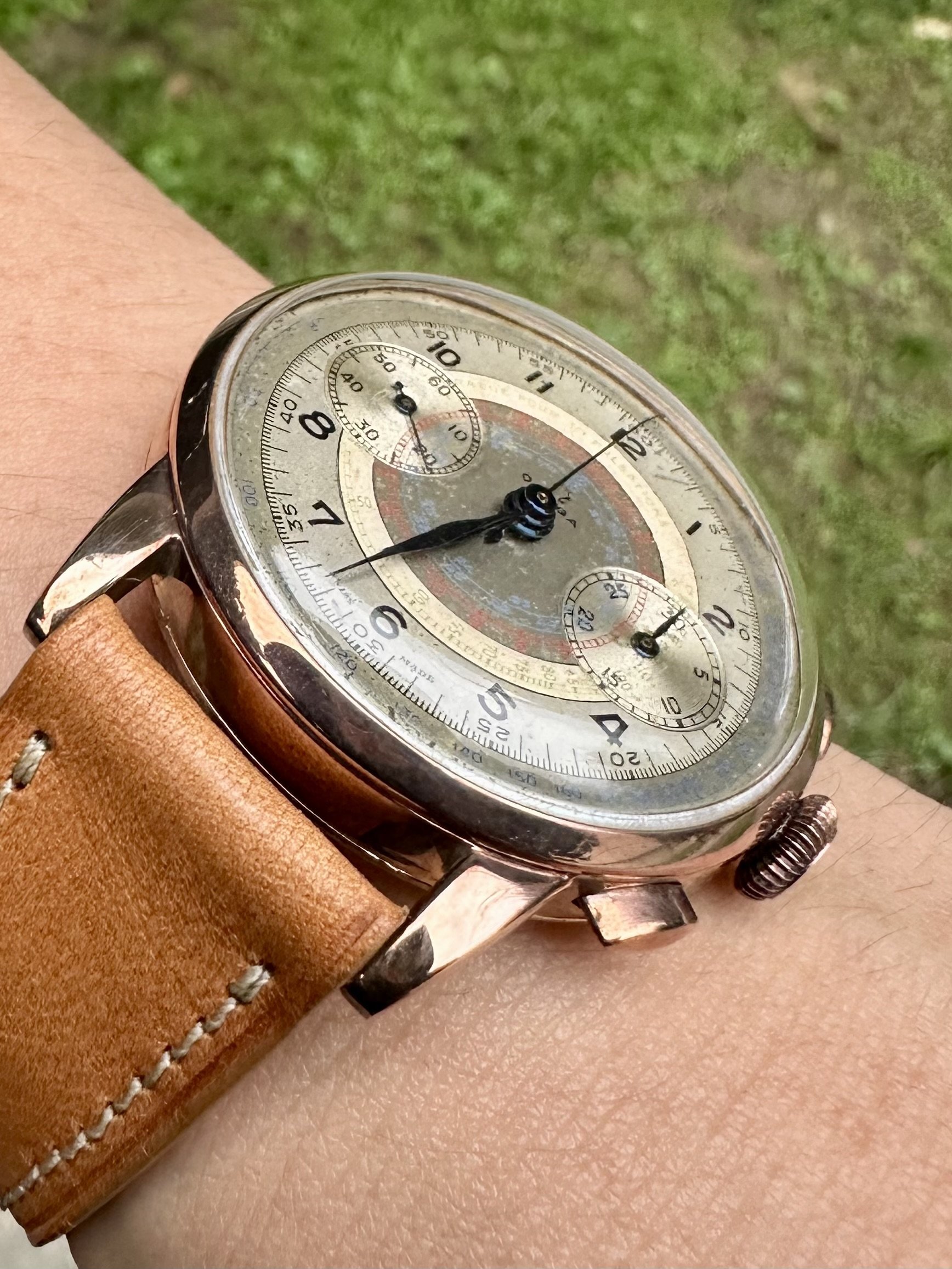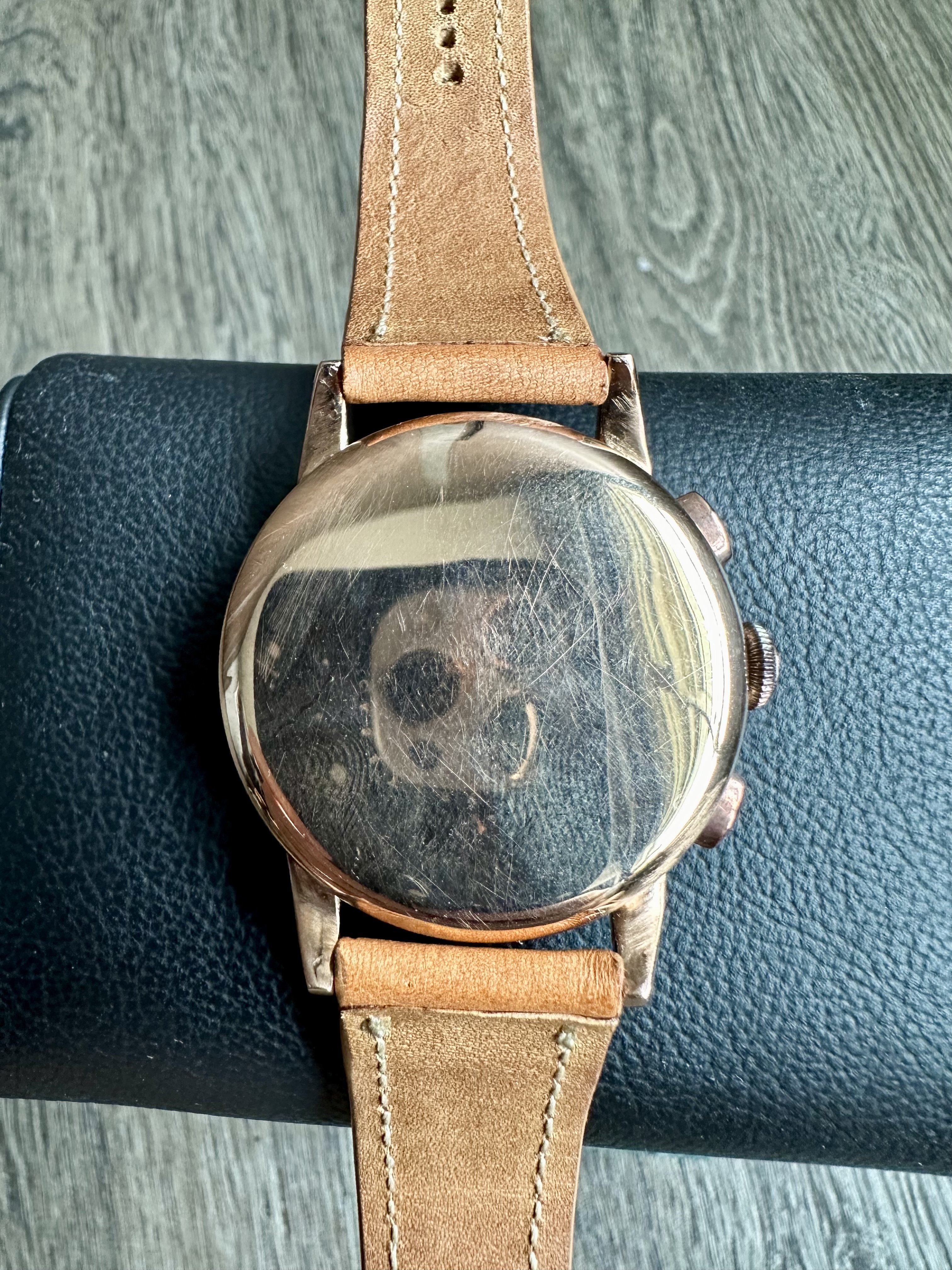 38mm Solid rose gold case has slight beautiful patina and has a very deep gorgeous reddish tone to it.
