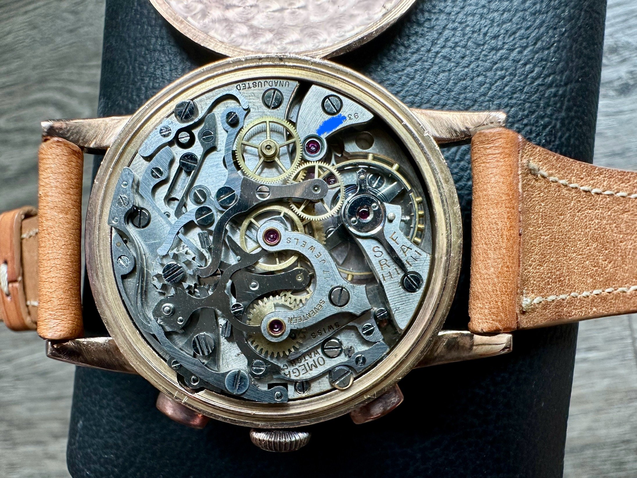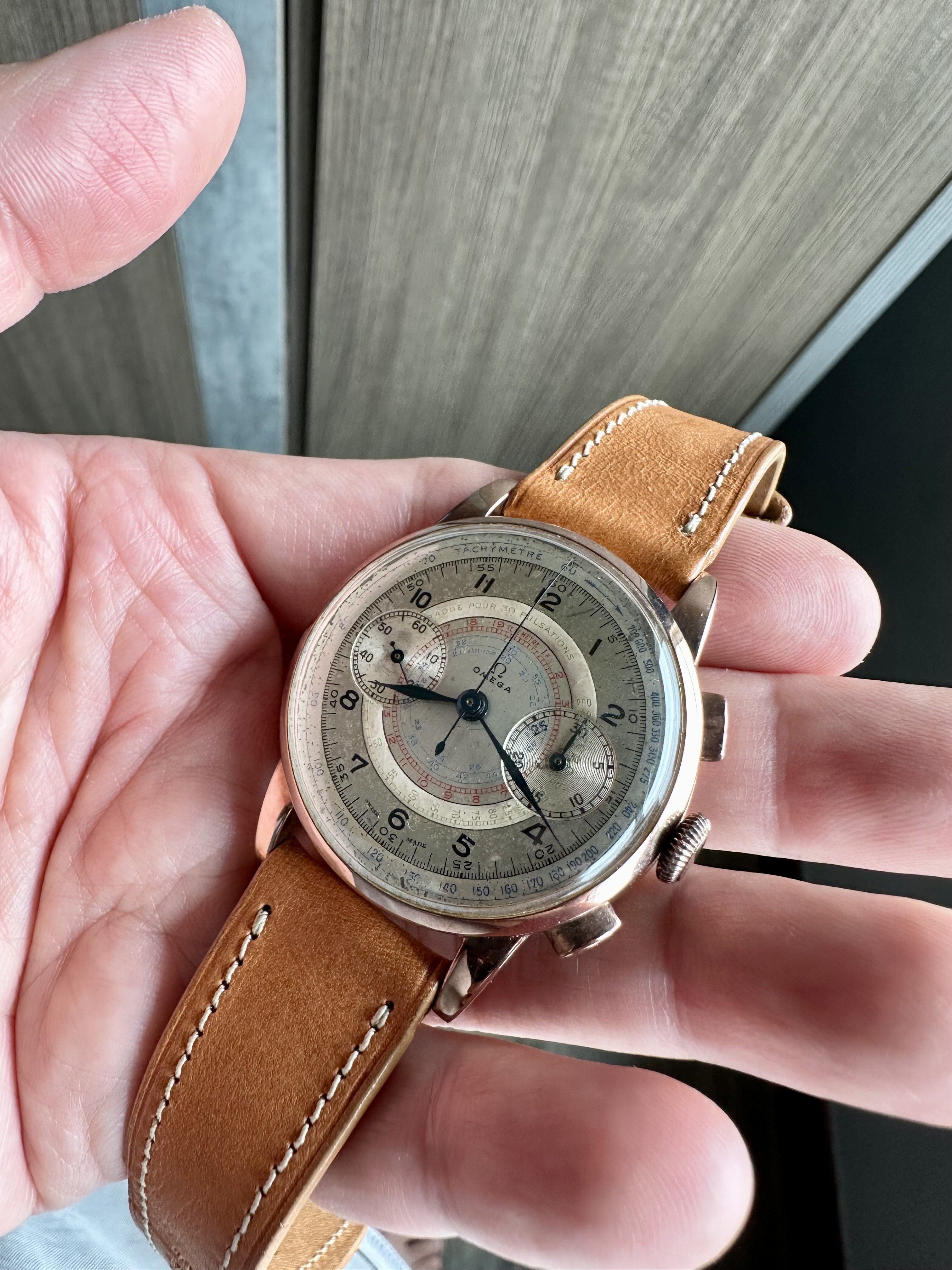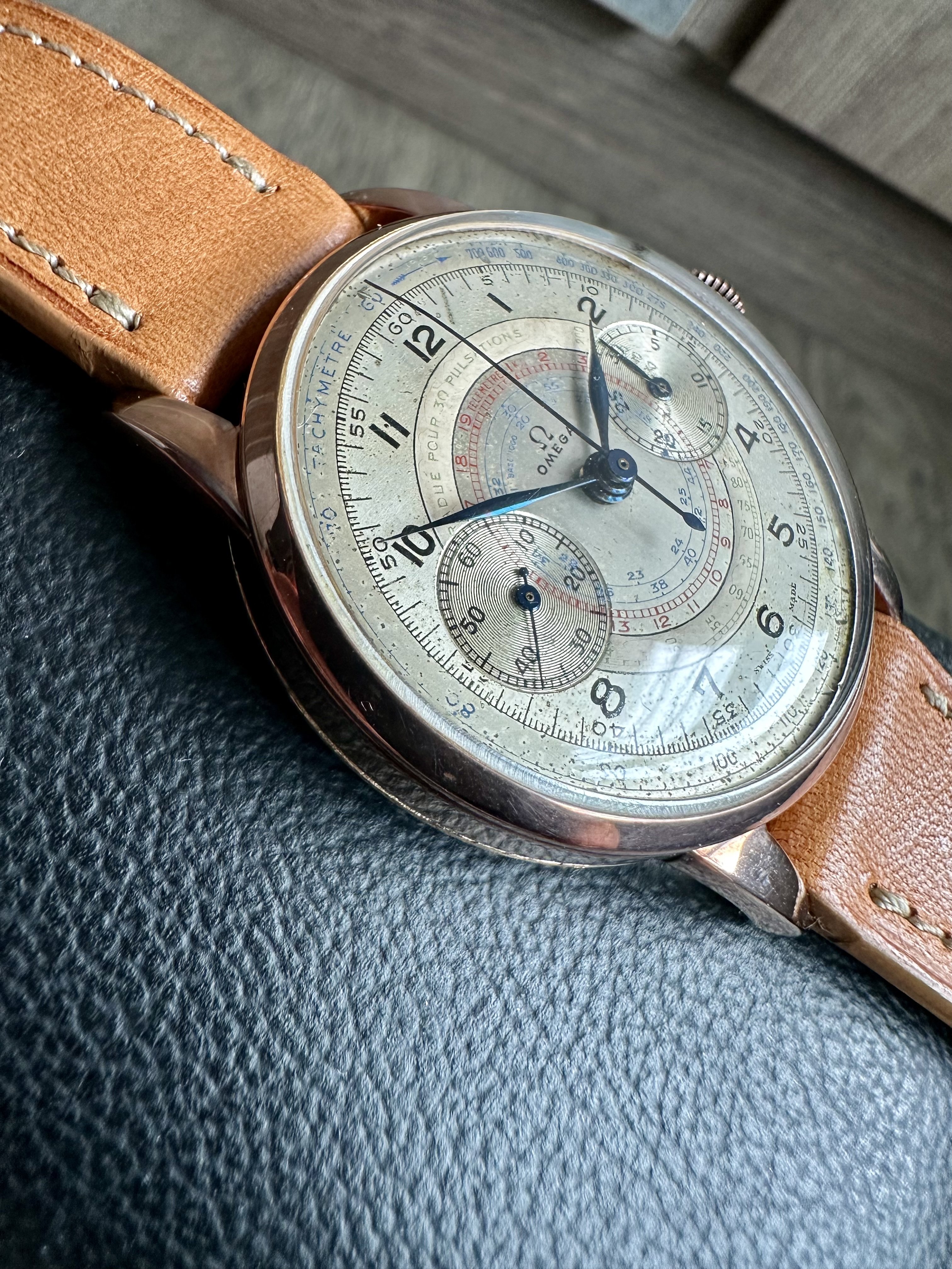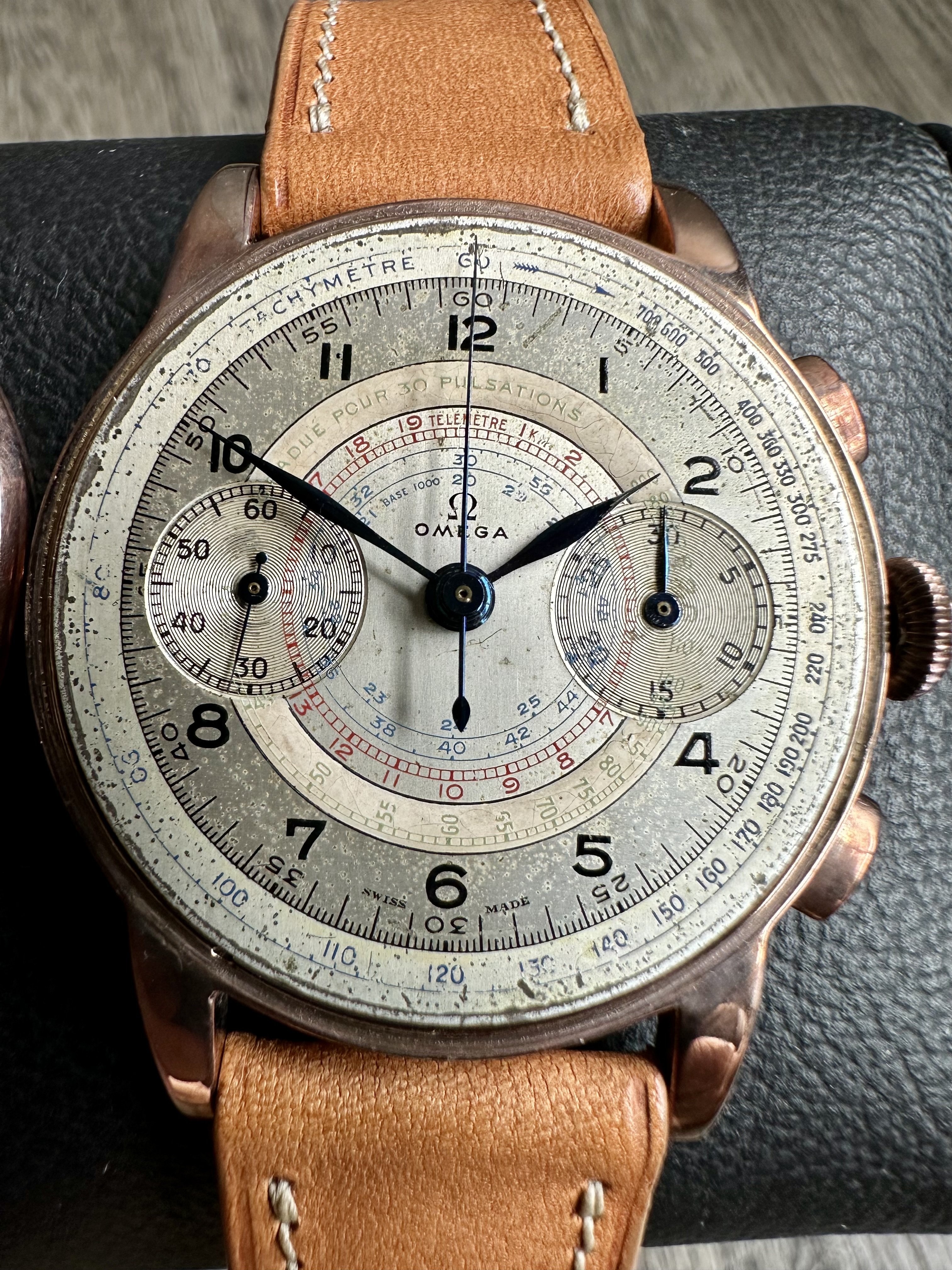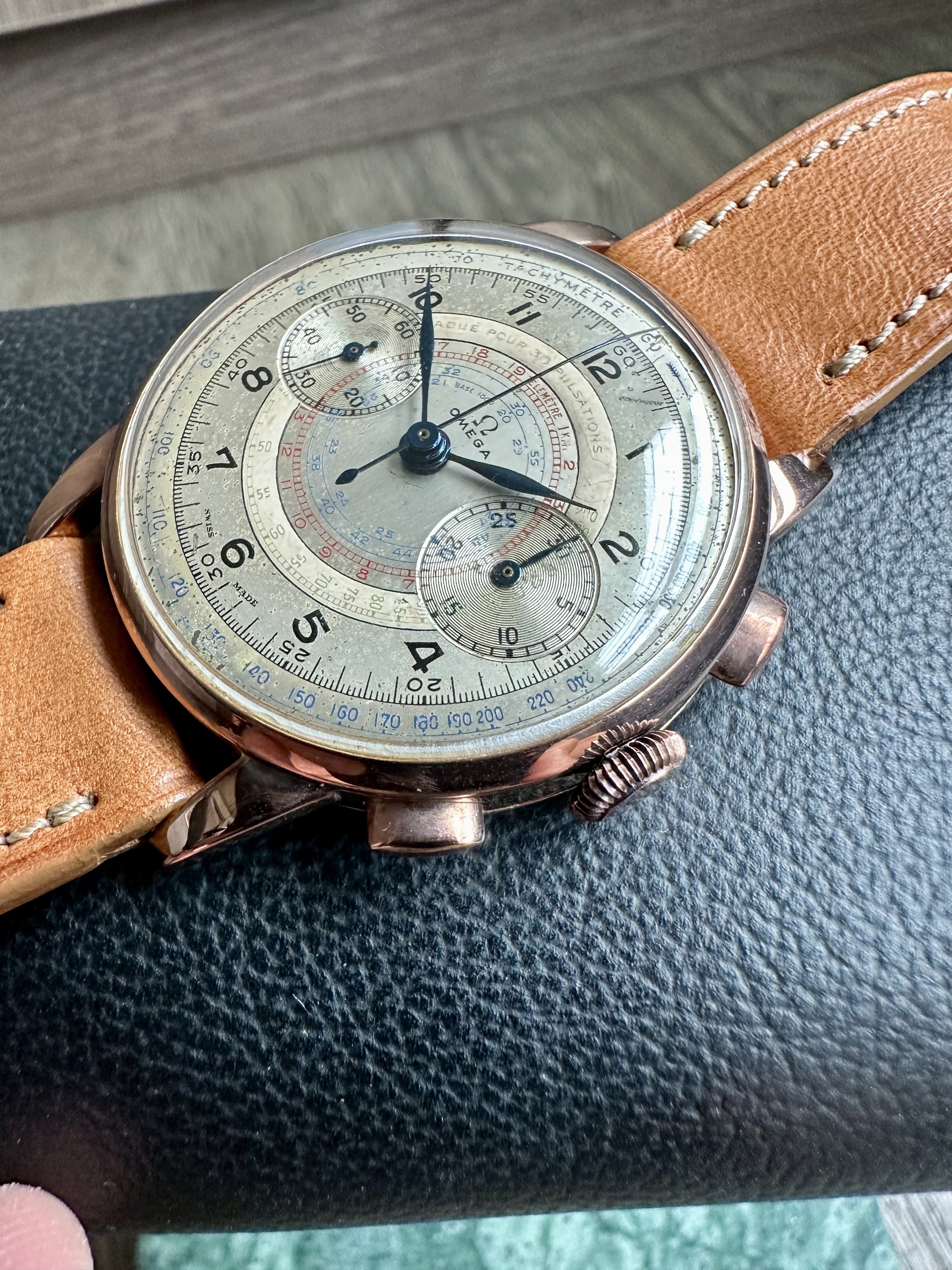 ·For sale, a 1930s, deep tone solid rose gold 18kt Omega 33.3 with RARE lacquered white & green numbers Pulsation scale!