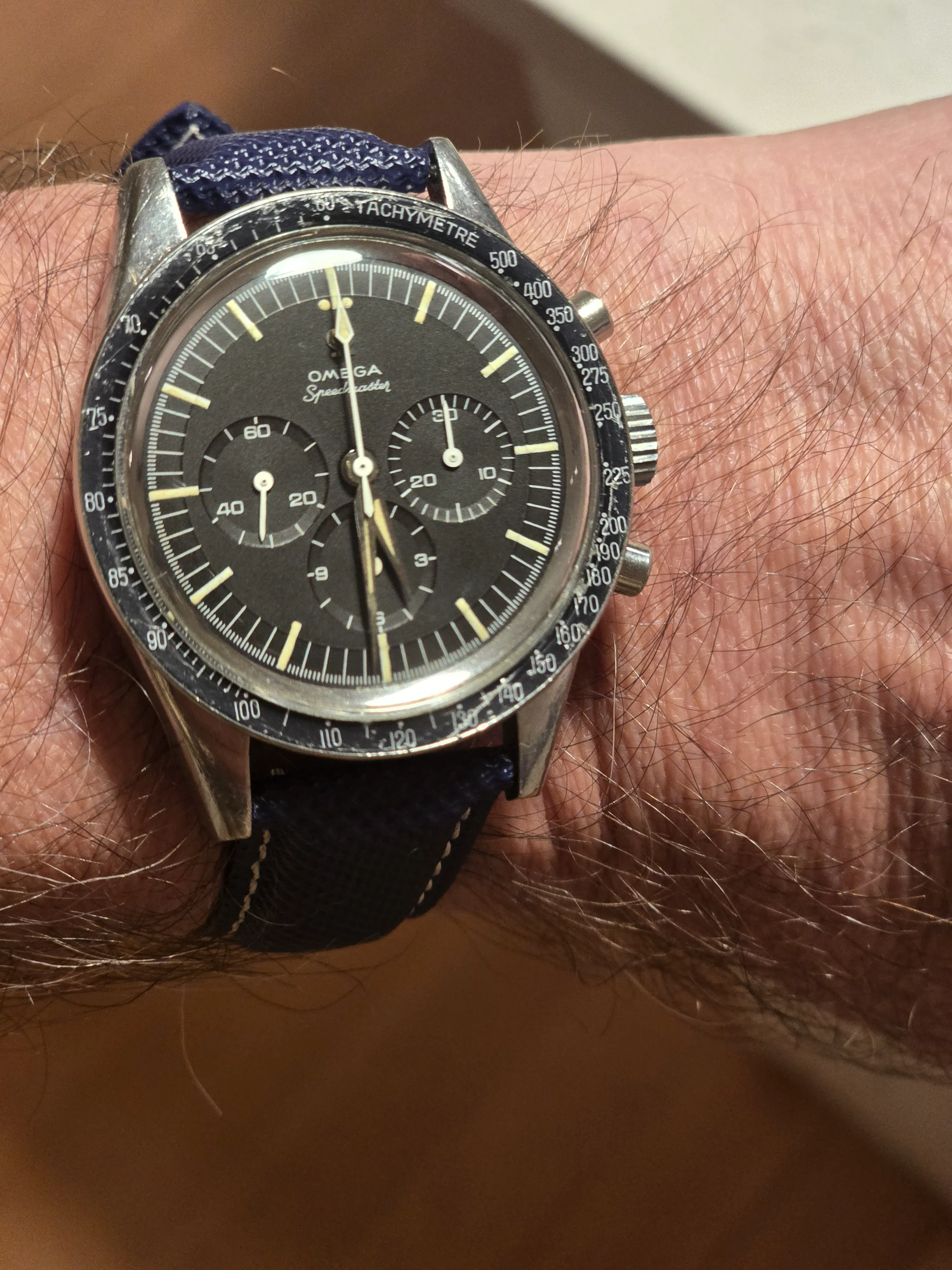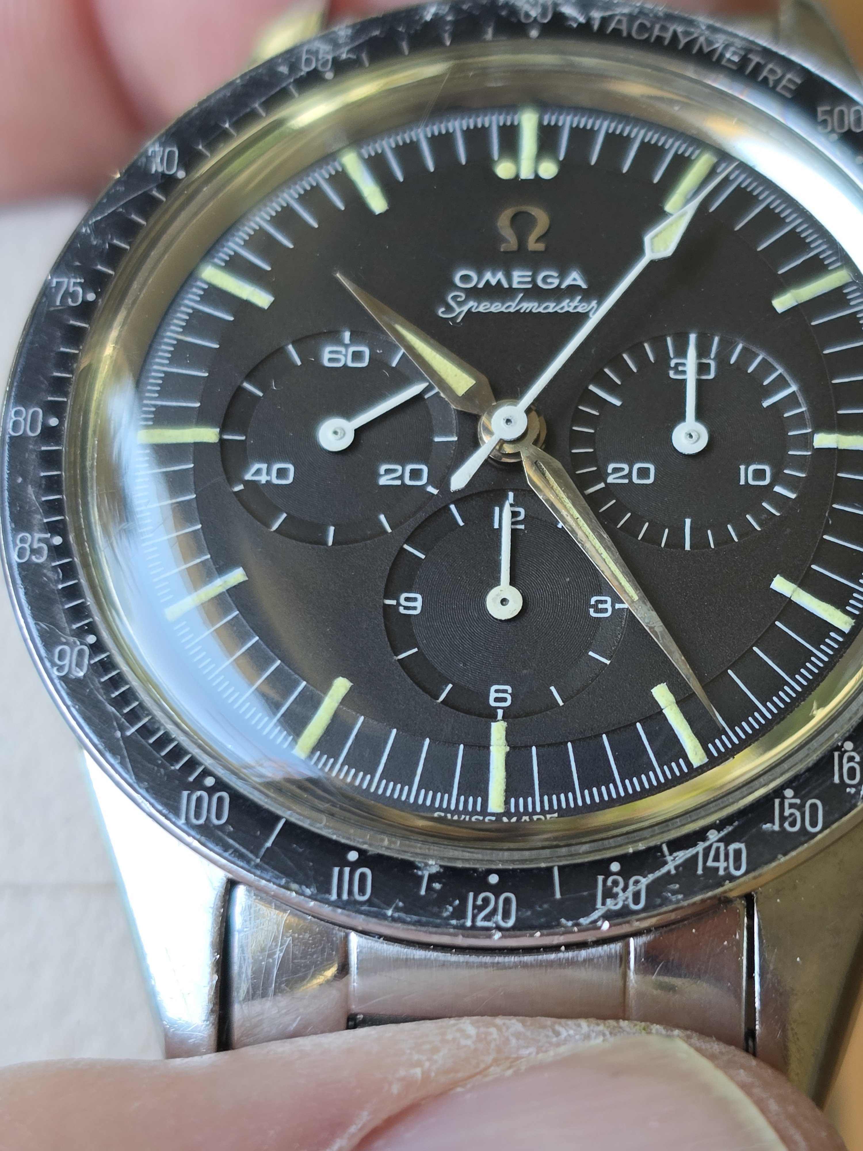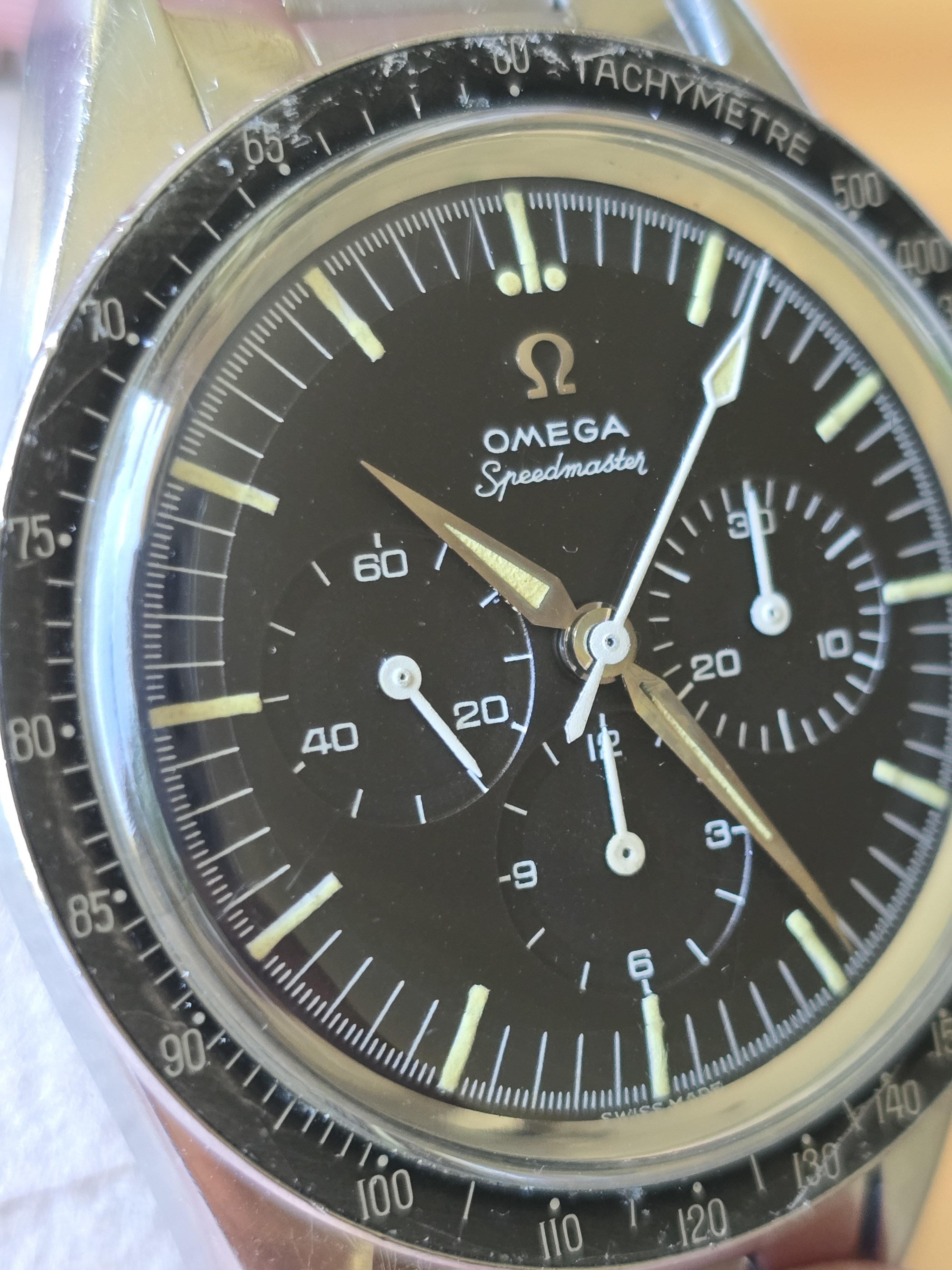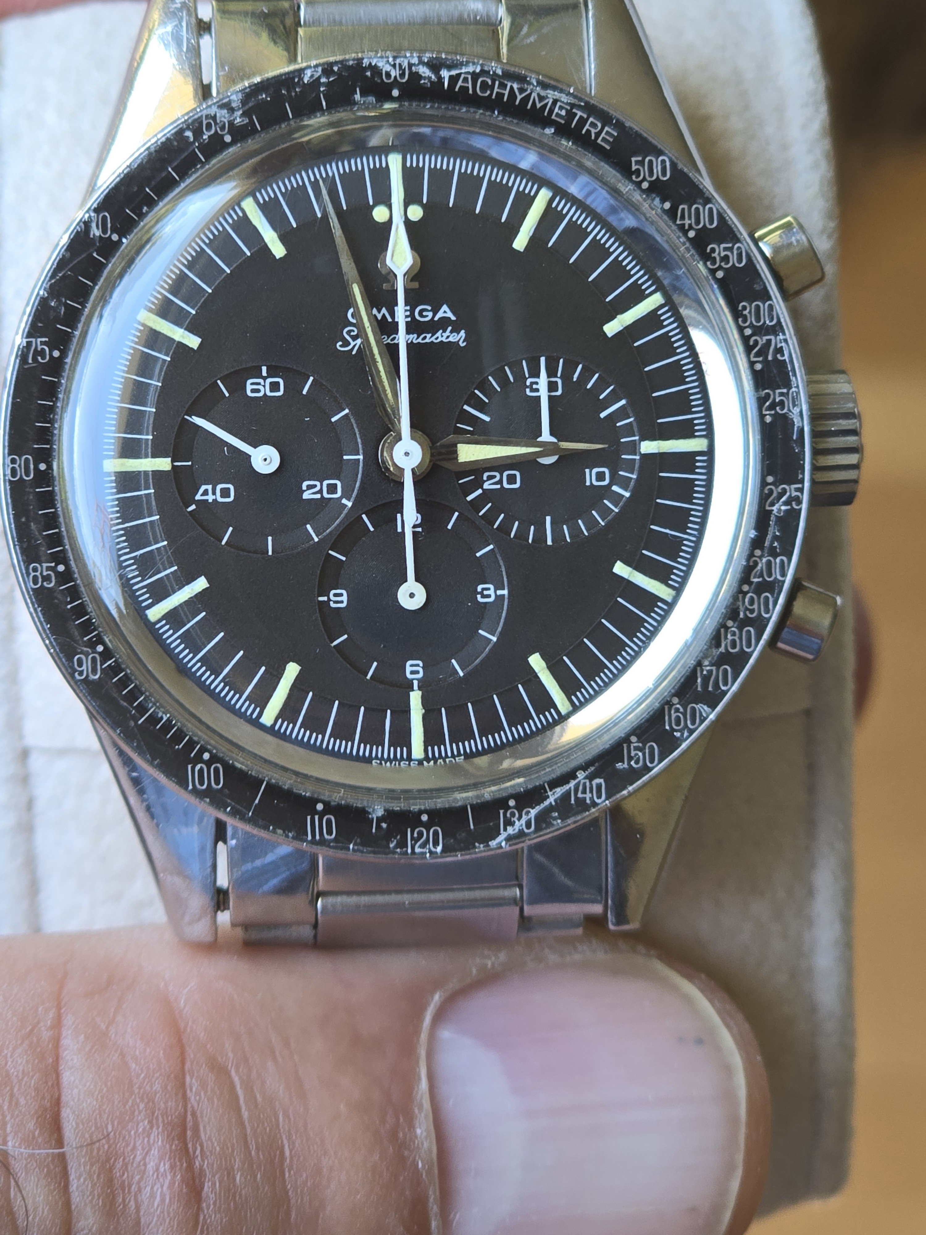 ··"I cut it TWICE and it's still short!"Omega Speedmaster 105.002-62 Alpha hands with 7912/6 Bracelet. Includes old style extract. Last service 2018 (see invoice photo.)