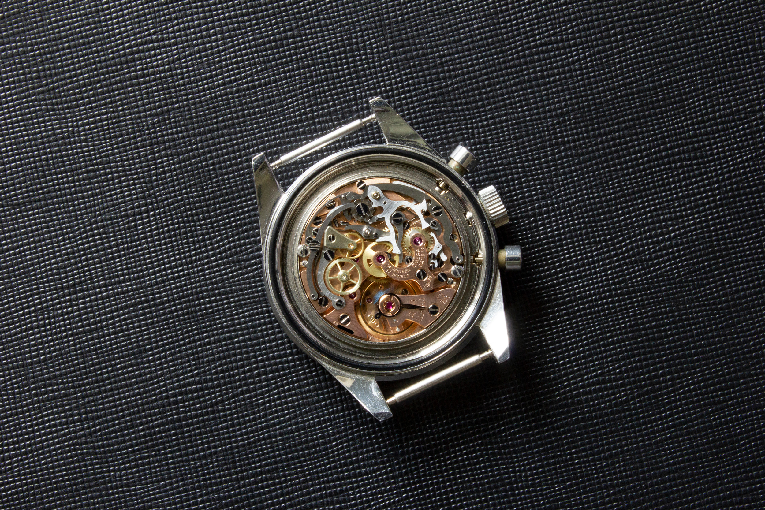 Both pusher caps and pusher necks are original to the watch with the correct measurements.