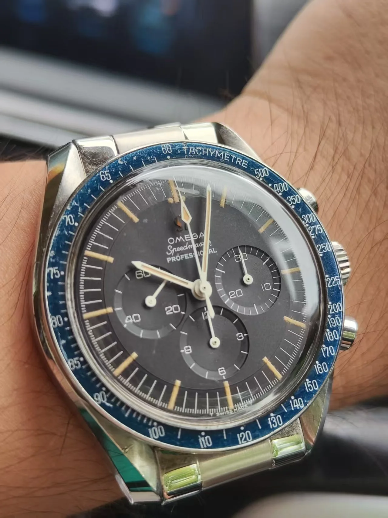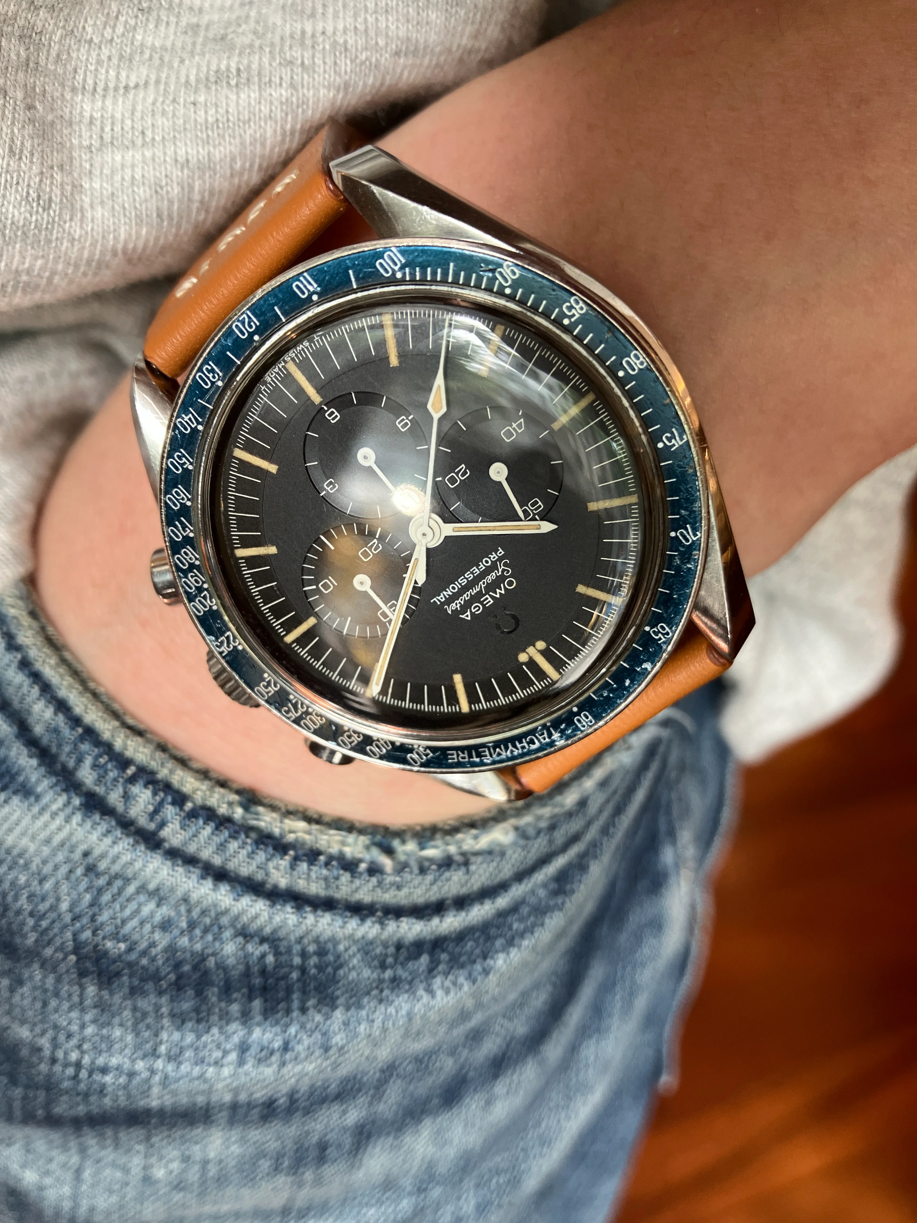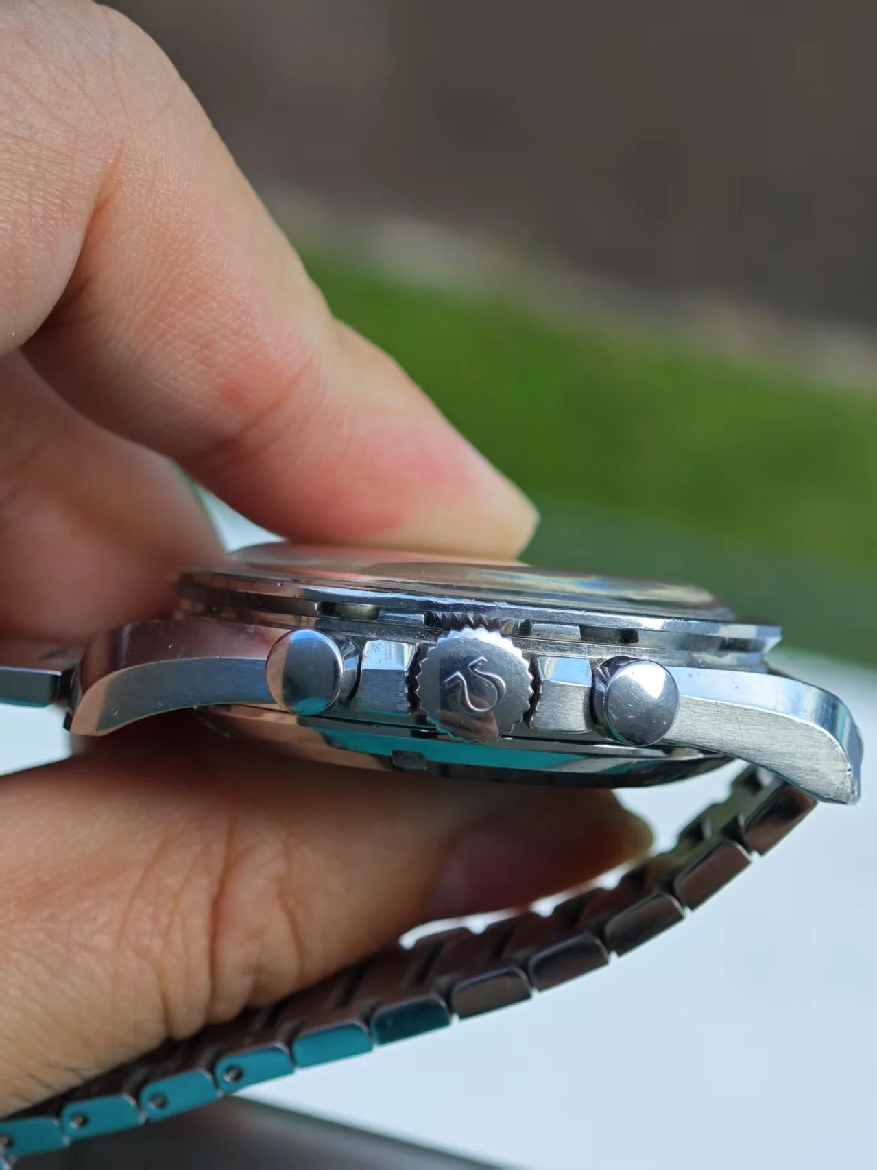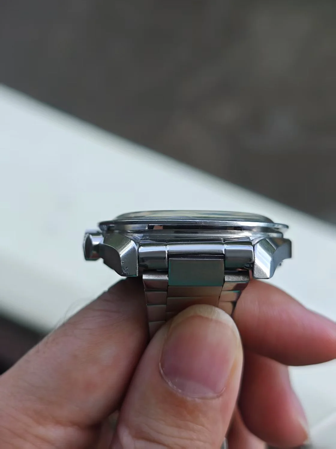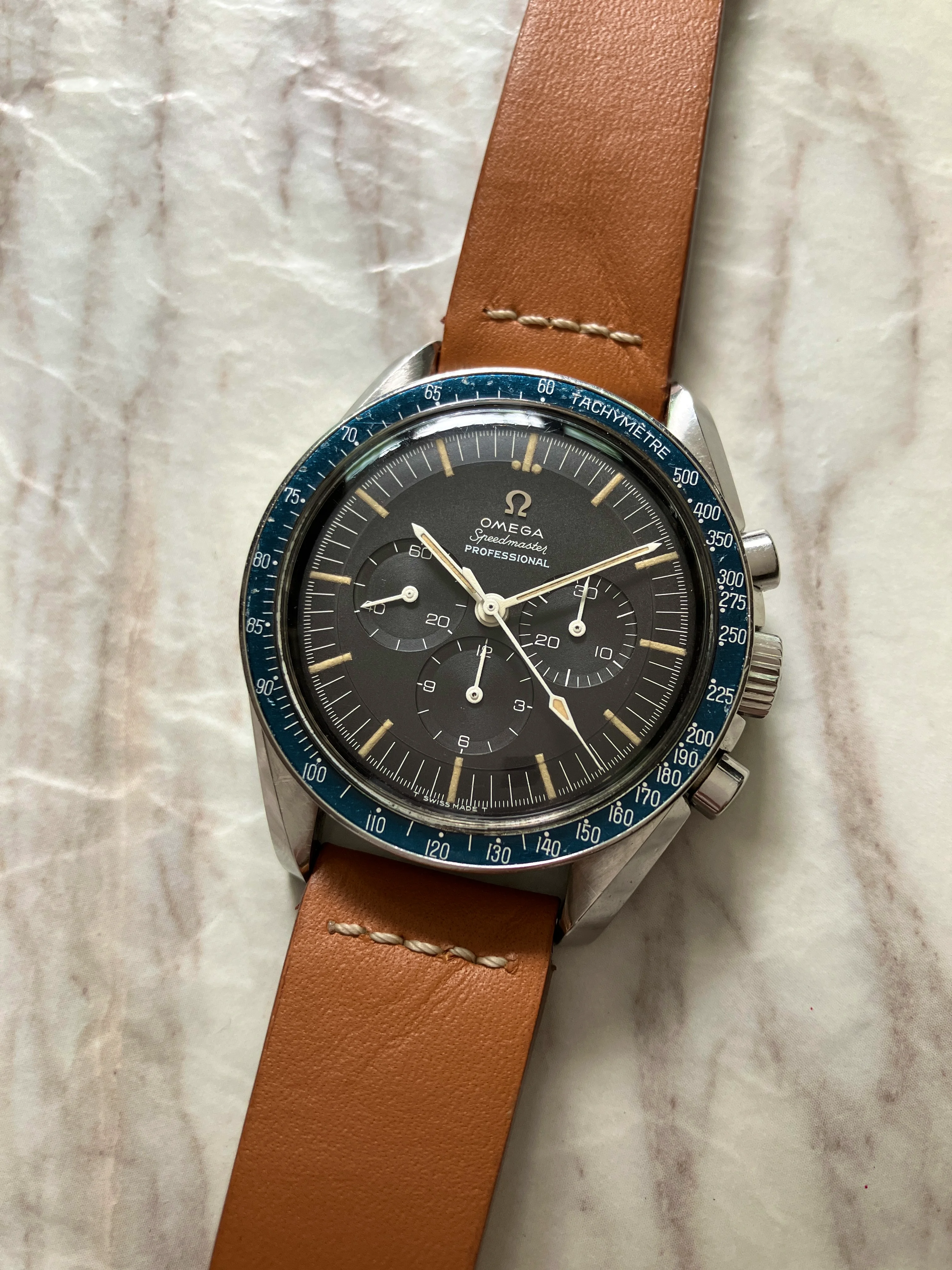··yoloA beautiful unpolished 105.012-64. please refer to the pictures. The dial is is mint condition. It has a beautiful blue ghosting DON bezel. Original crown and fat neck pushers. Some nicks and tool marks here and there, but the case maintains good proportions and is probably not polished. The circular brush marks on the case back are not something you may easily see on other examples. The watch is just serviced, so you can wear it without worry in the next 5 years.