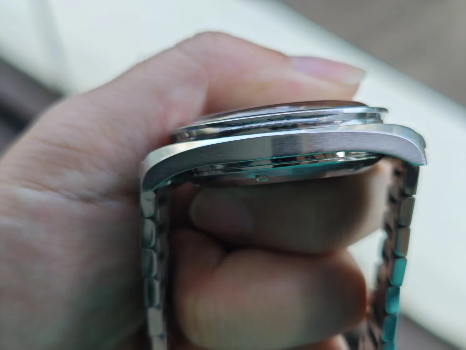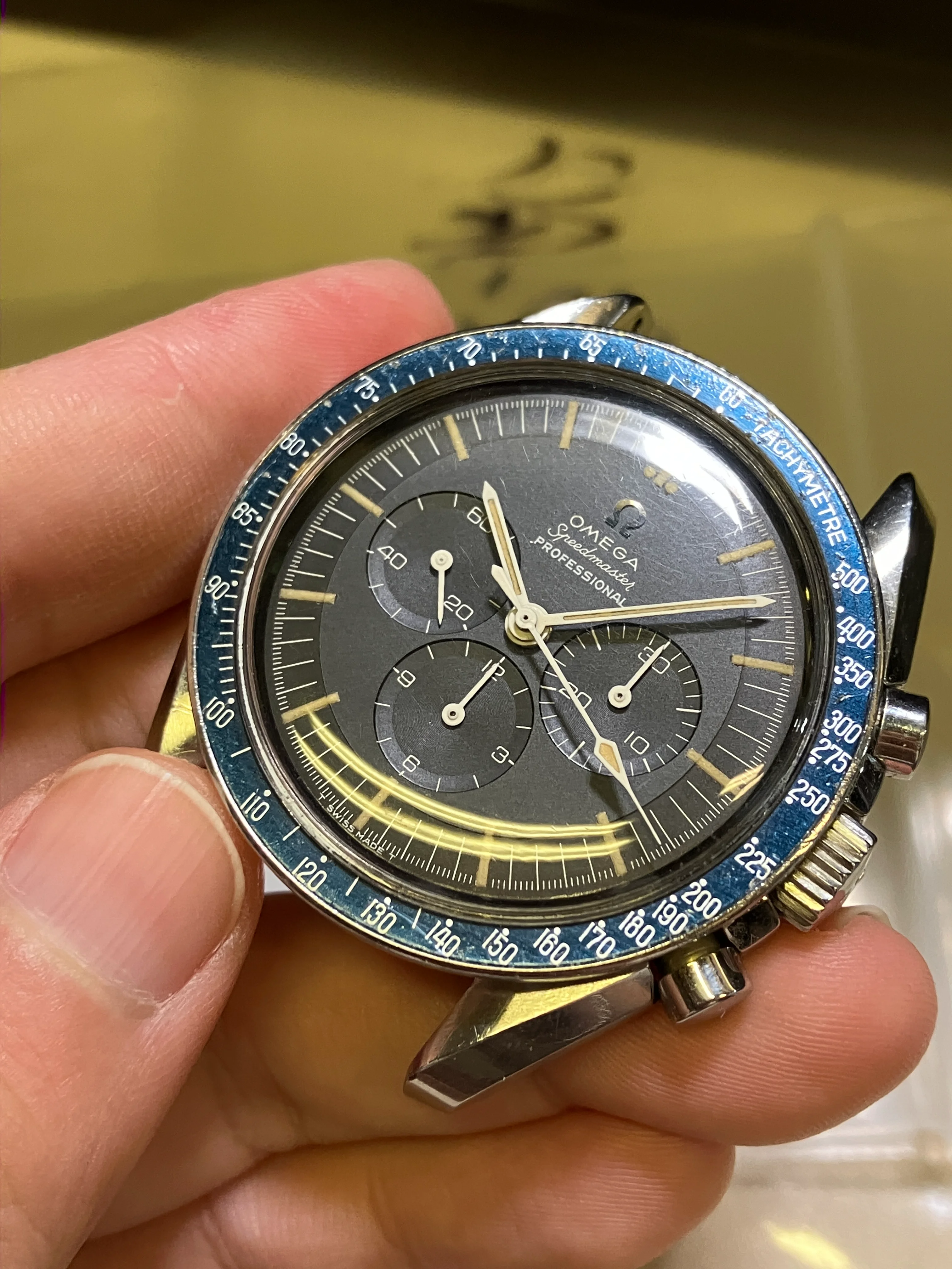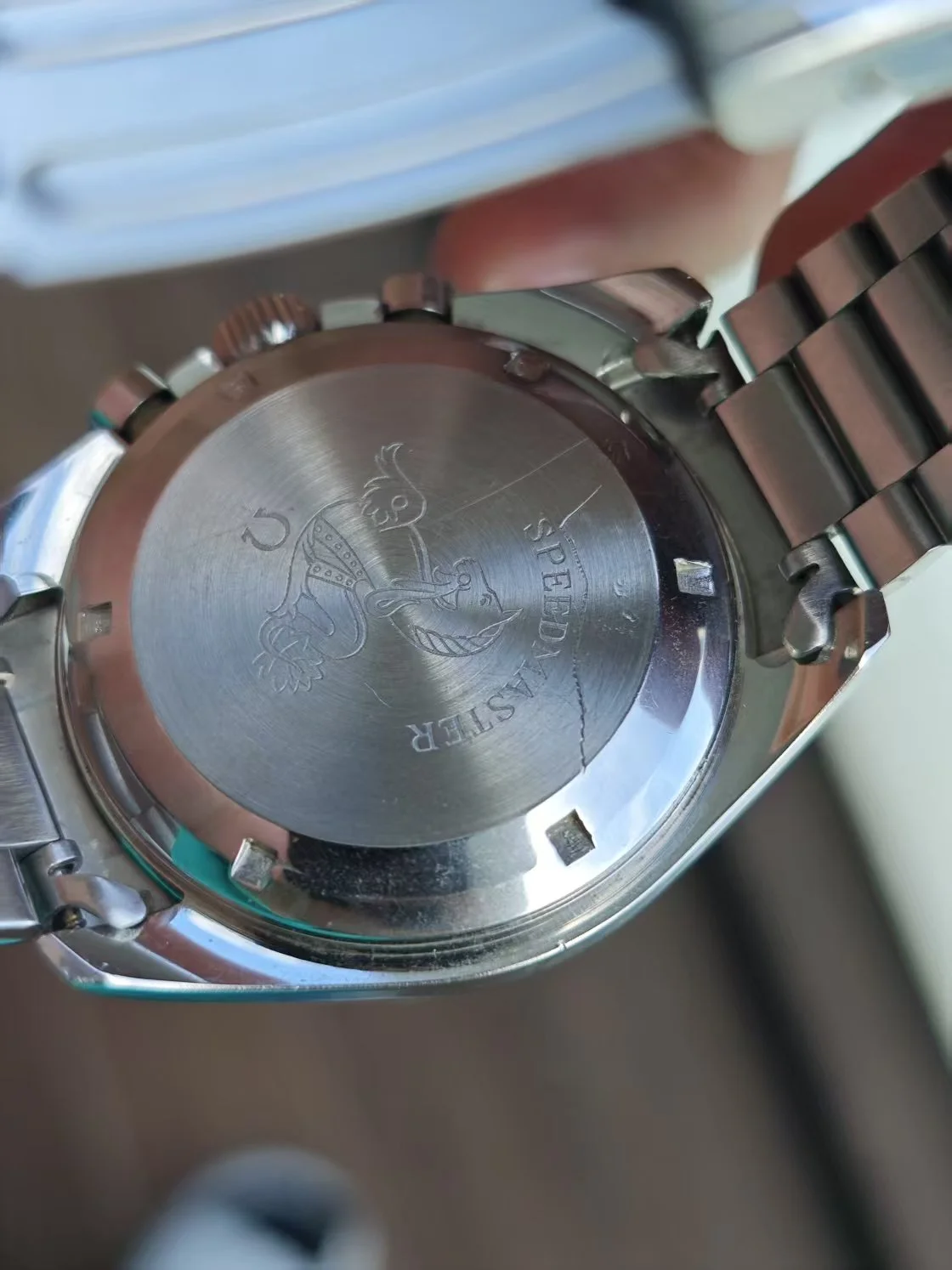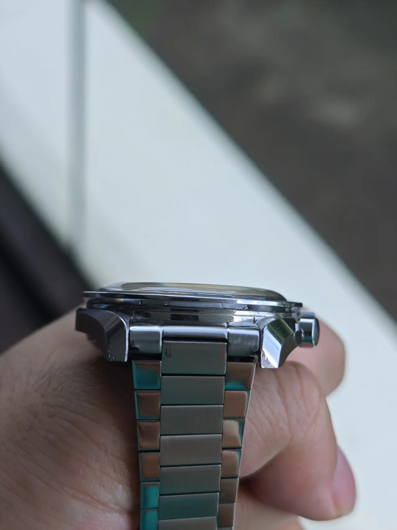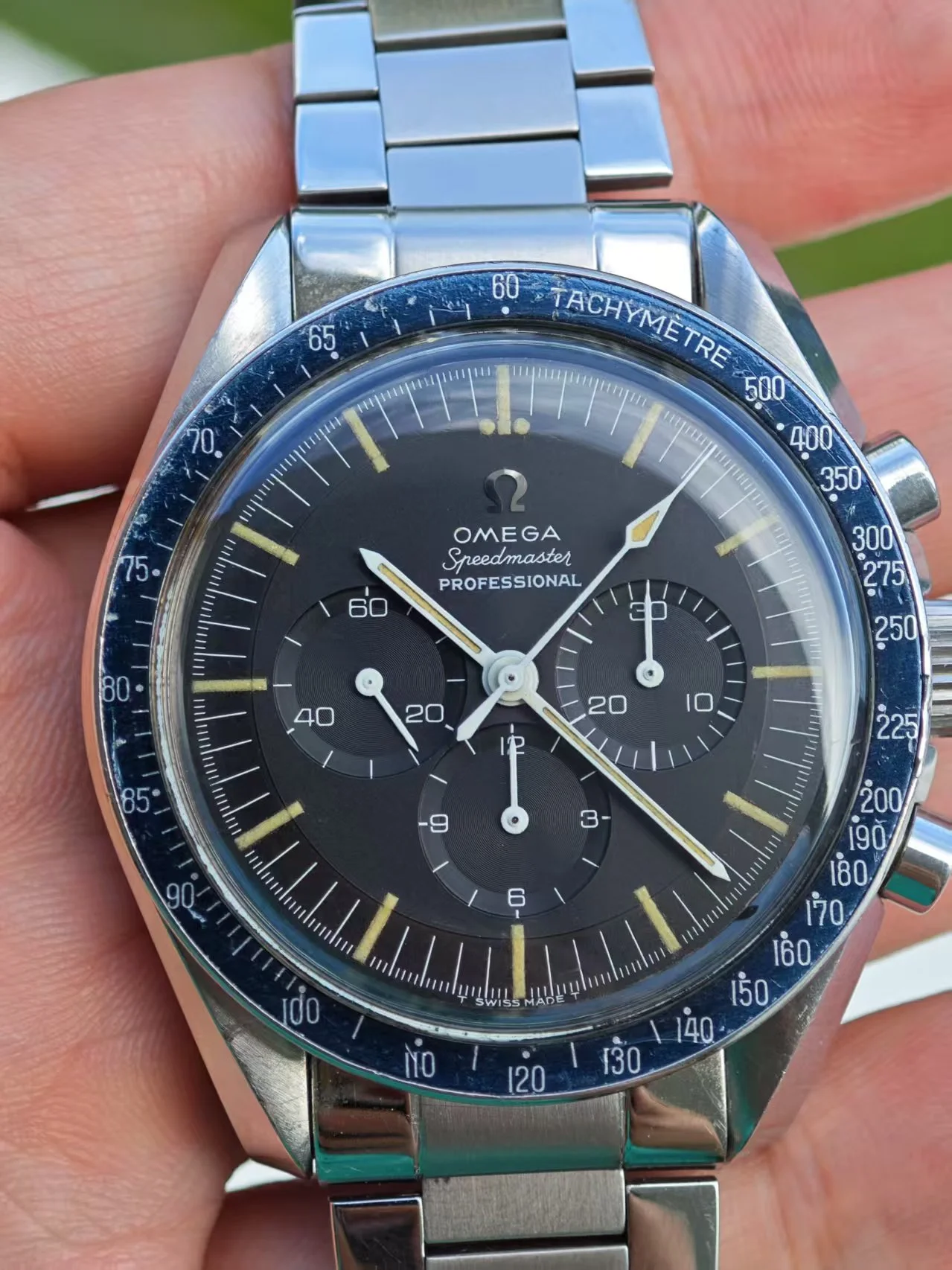 ··yoloA beautiful unpolished 105.012-64. please refer to the pictures. The dial is is mint condition. It has a beautiful blue ghosting DON bezel. Original crown and fat neck pushers. Some nicks and tool marks here and there, but the case maintains good proportions and is probably not polished. The circular brush marks on the case back are not something you may easily see on other examples. The watch is just serviced, so you can wear it without worry in the next 5 years.
