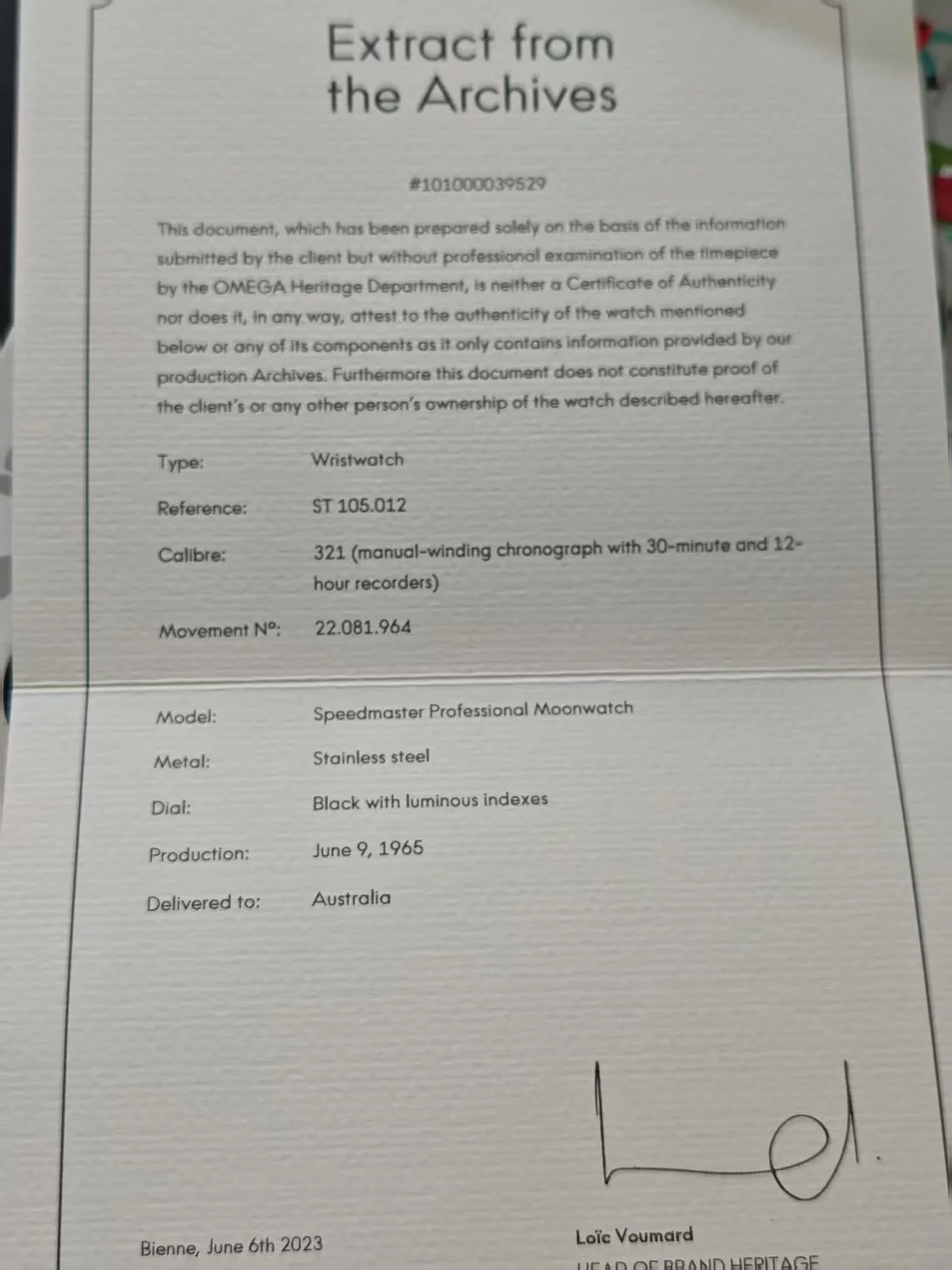 The watch comes with the extract from the archives issued by Omega (probably the last batch of this service).
