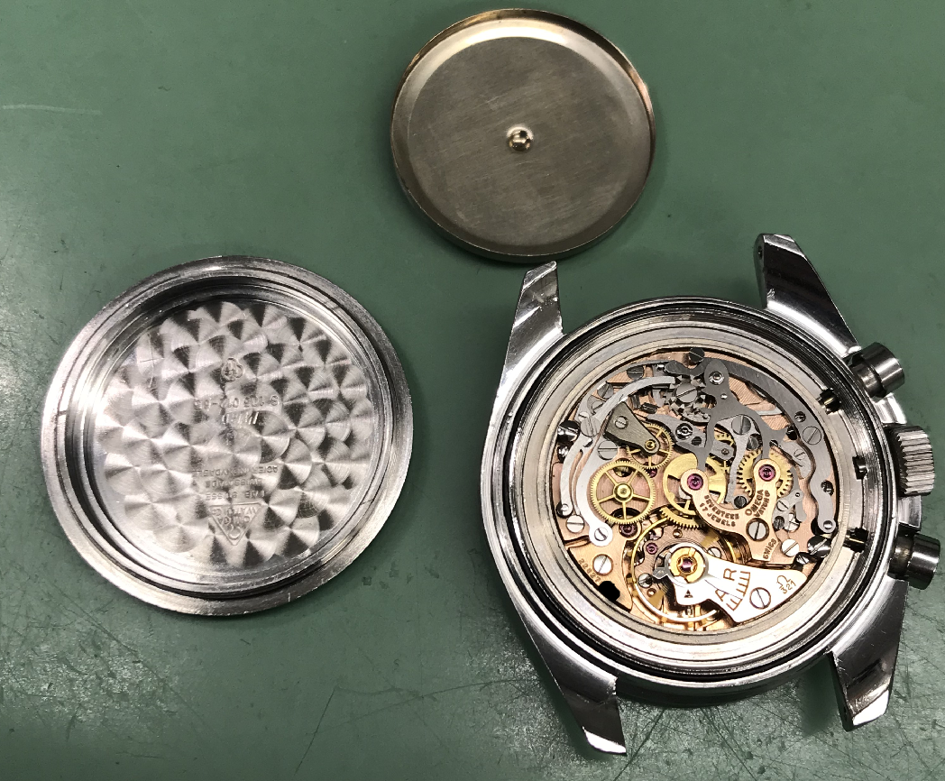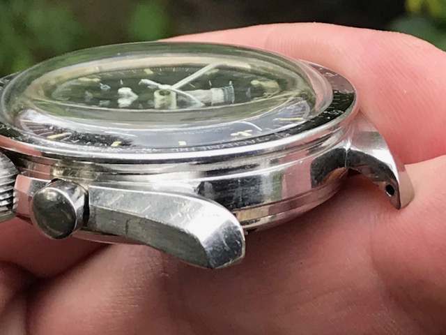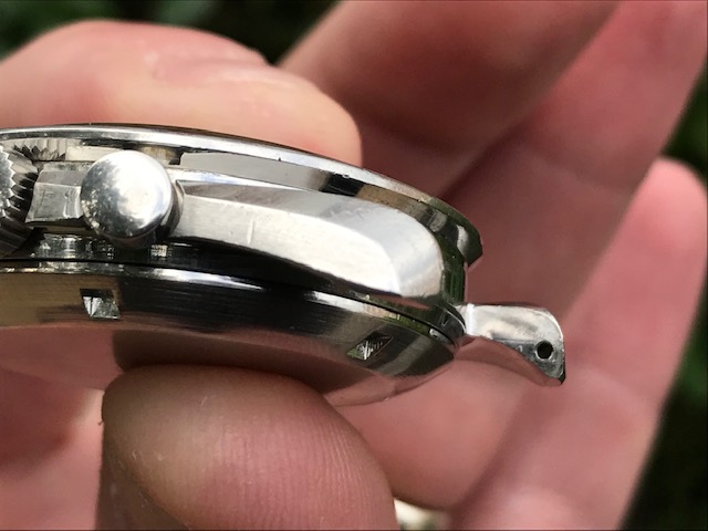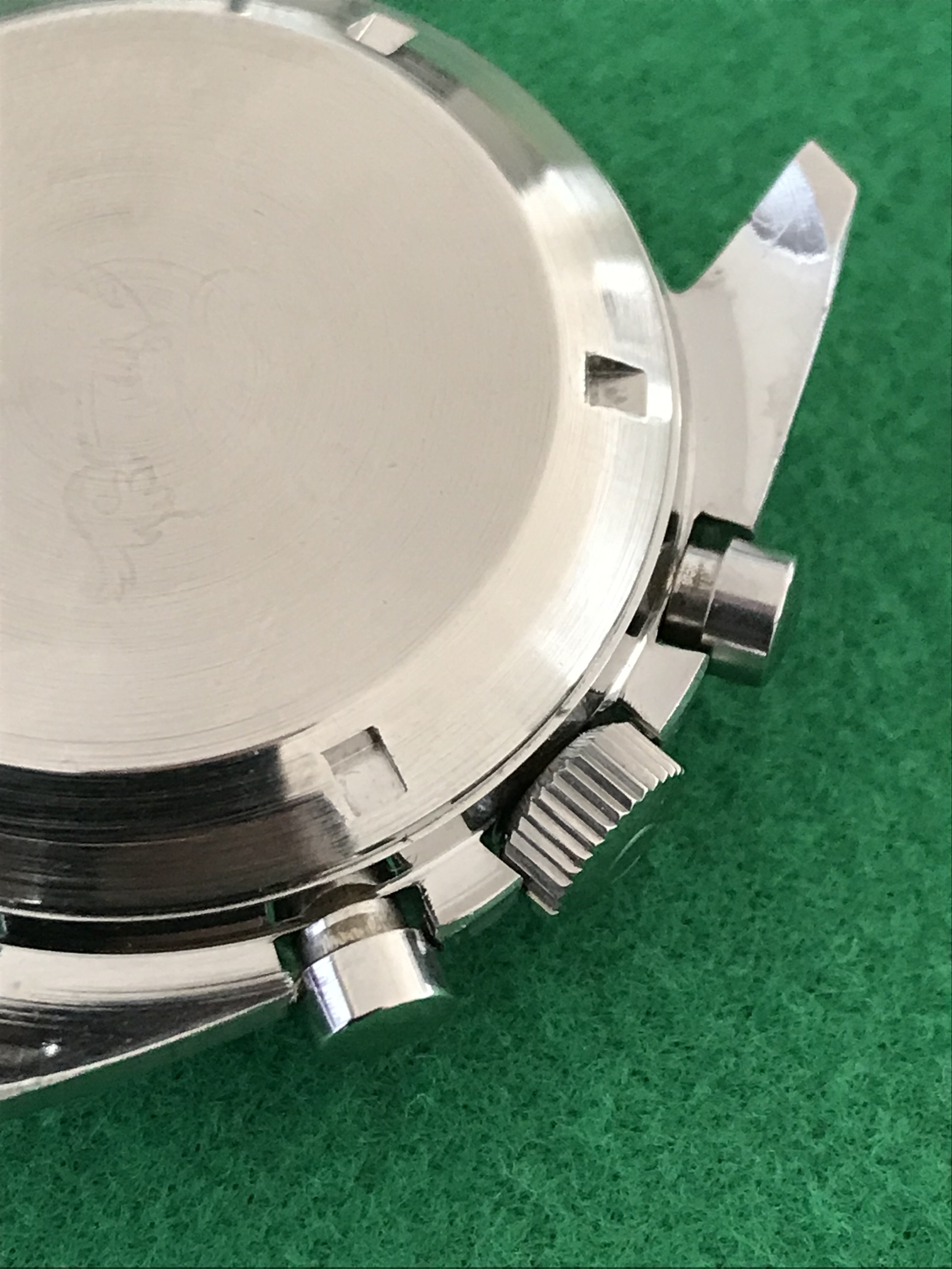 Pushers & crown: Original low pushers with original wide tubes. Flat foot crown.