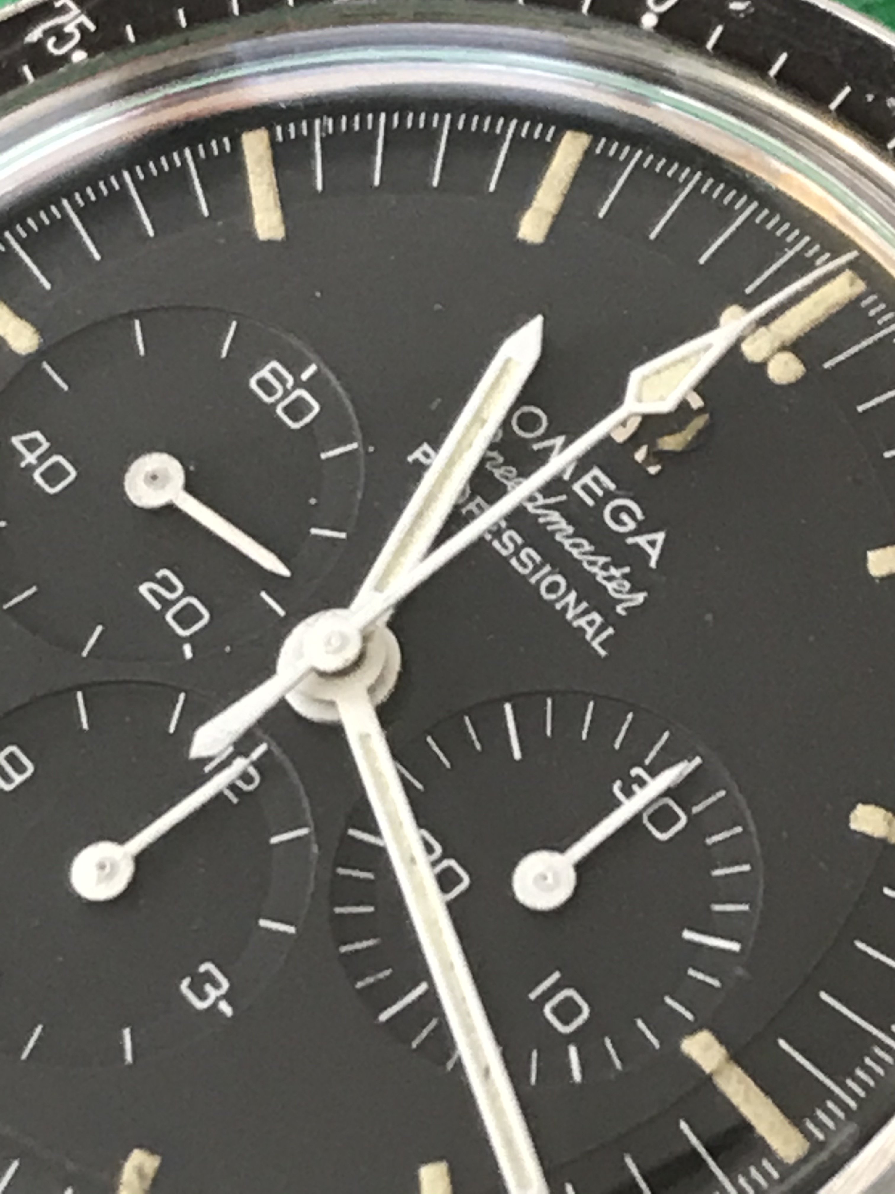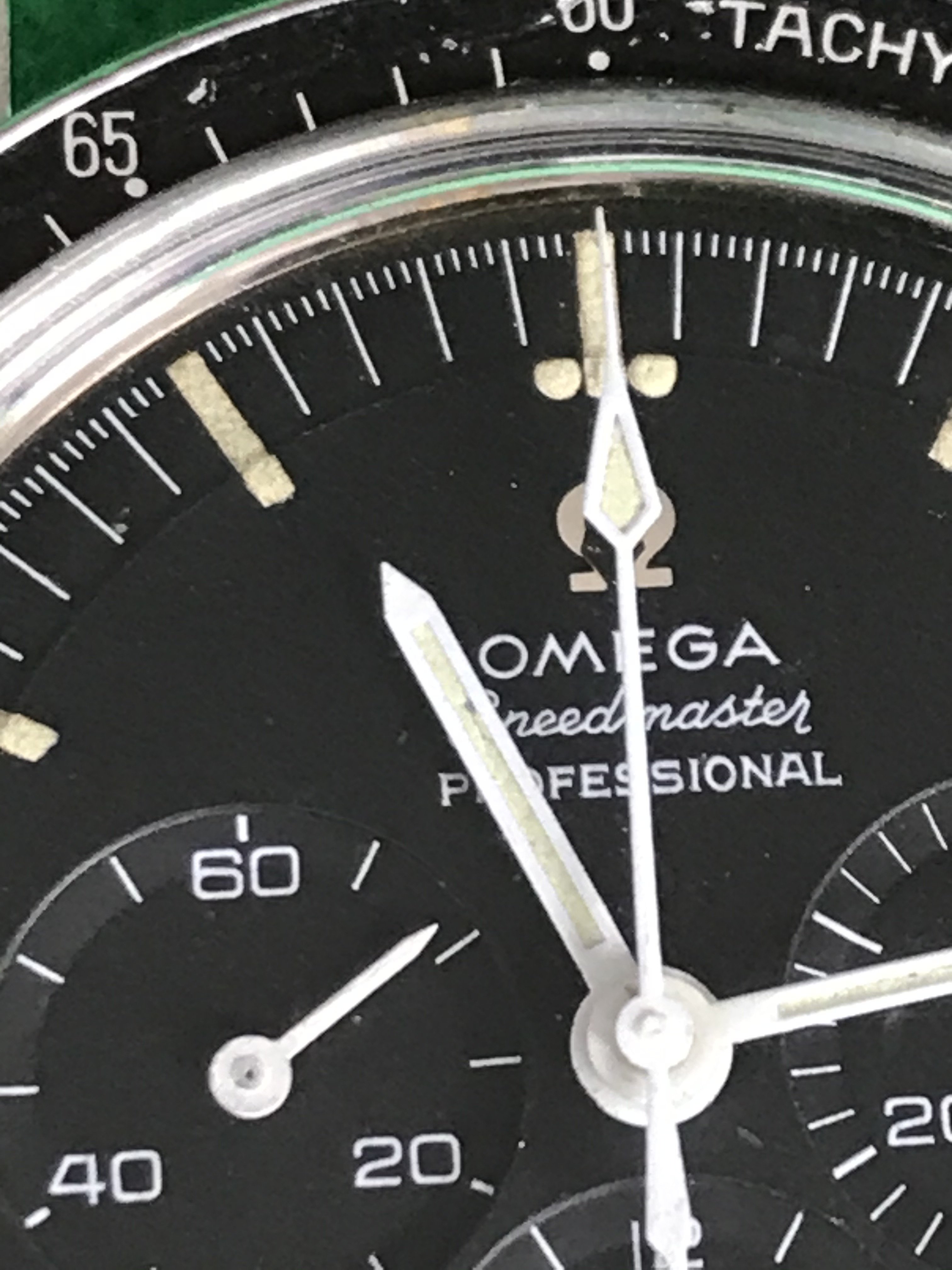 Hands: Original baton hands. Tritium glows as expected and decay over a few seconds when exposed to UVs. Hands in subdials has been repainted.