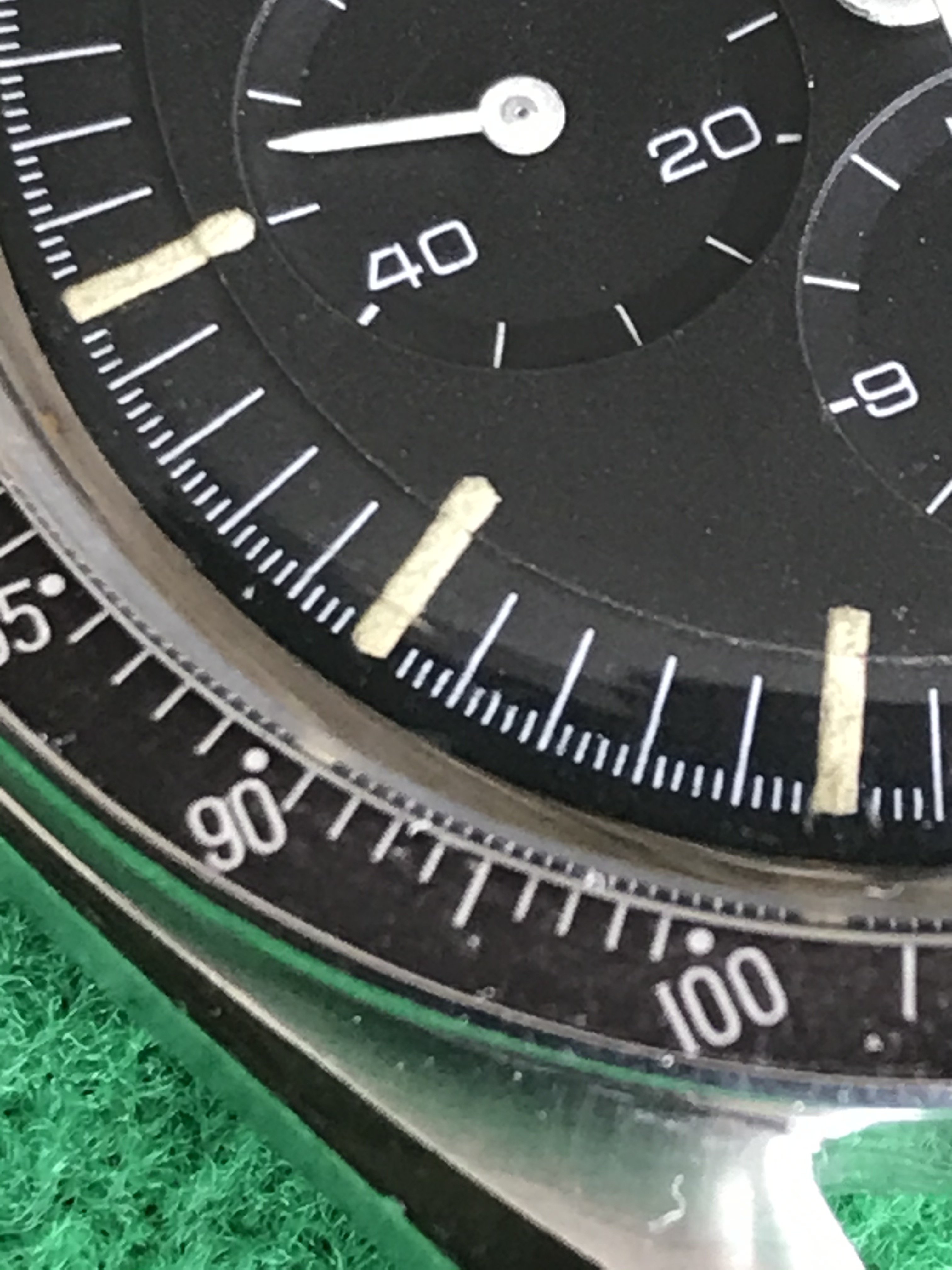 Bezel: Very nice original Dot Over Ninety (DON) bezel TACHYMETRE that has some wear and has turned really ghost grey/purple.