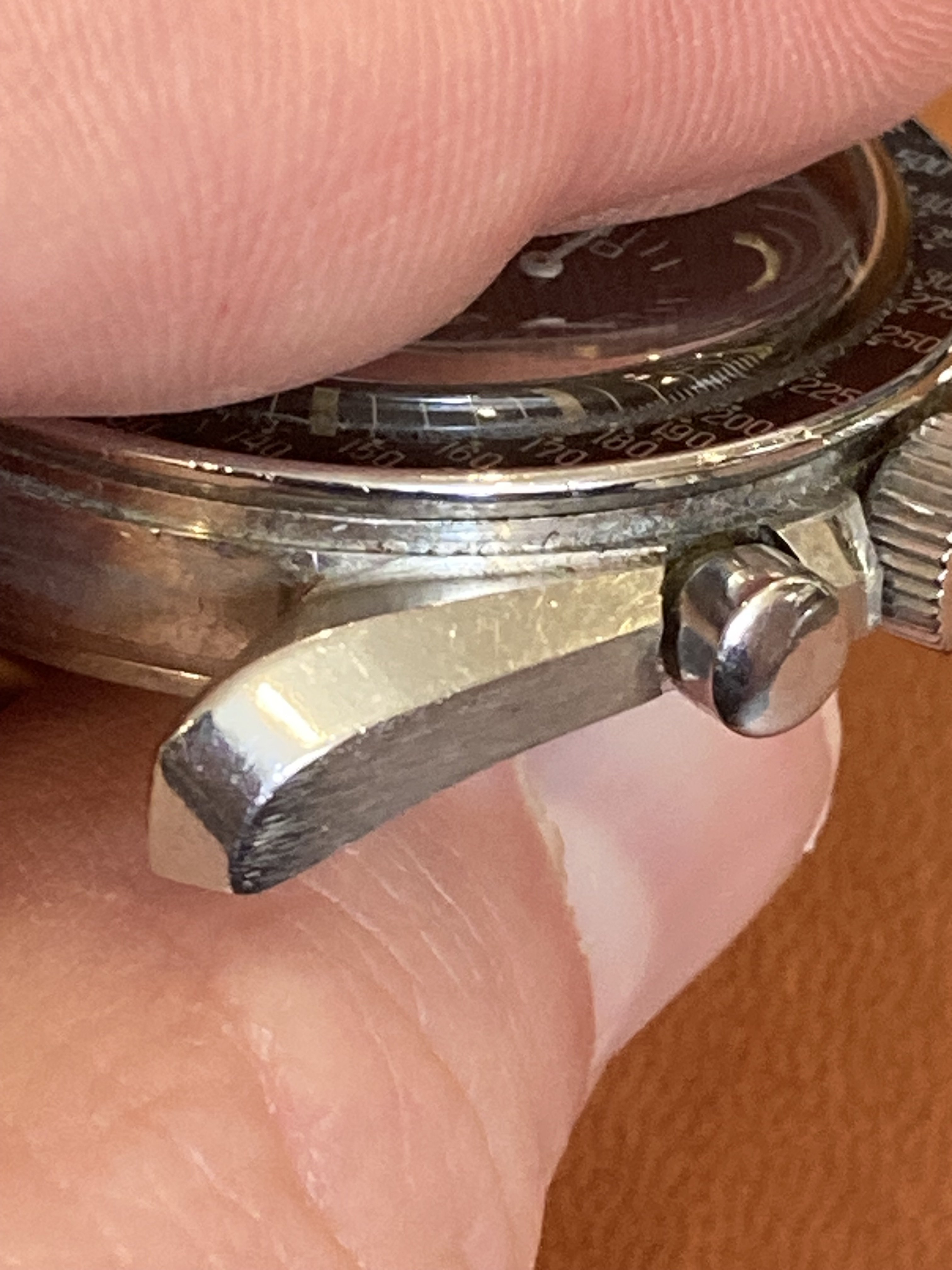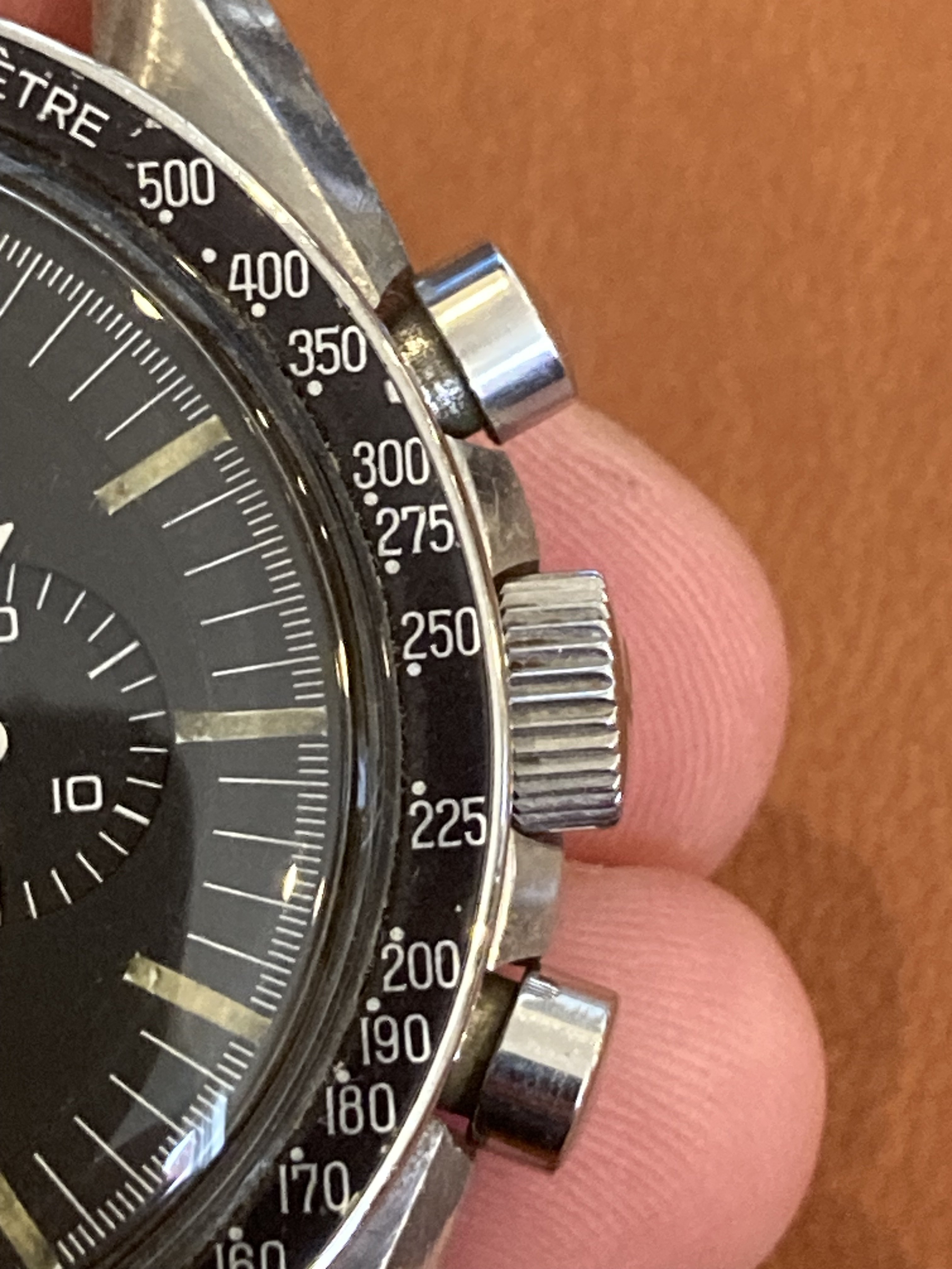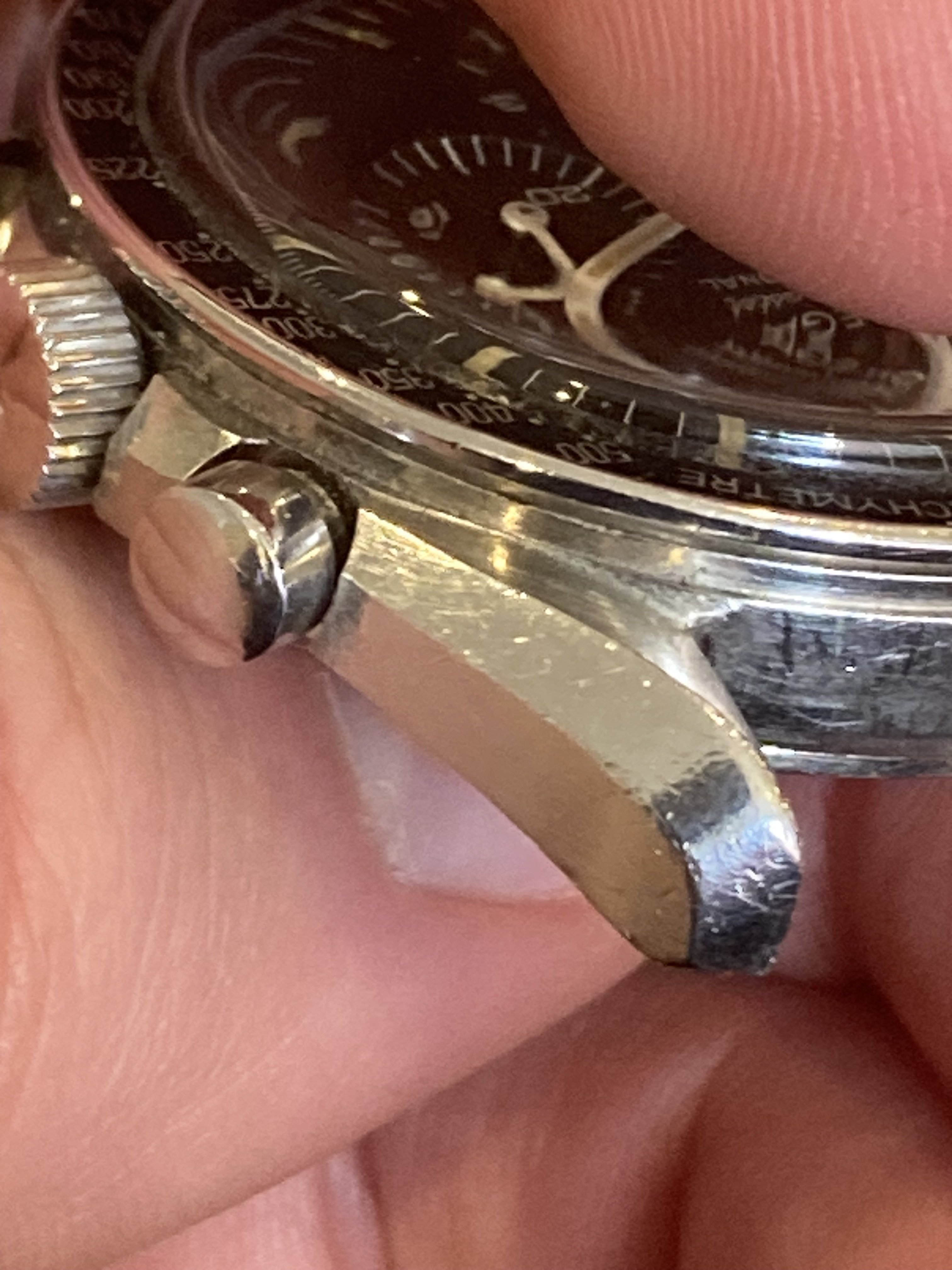 All parts are correct for the reference, still has its original short/fat pushers. The only cosmetic issue is that the chrono needle appears to have been clipped at the tip at some point, and the hands have apparently been relumed as they do not fluoresce under UV light like the dial does. Neither of these actions were done by me.