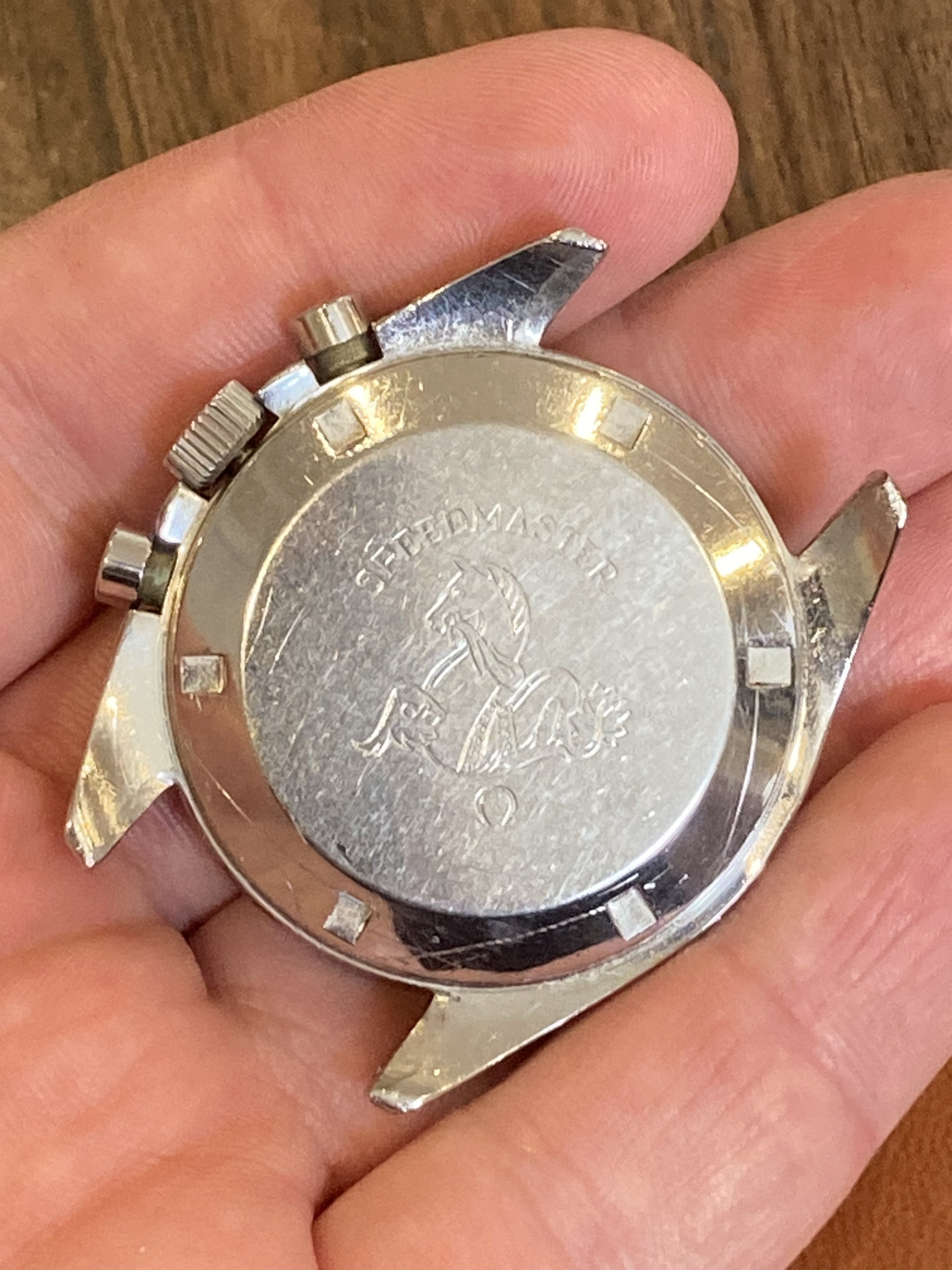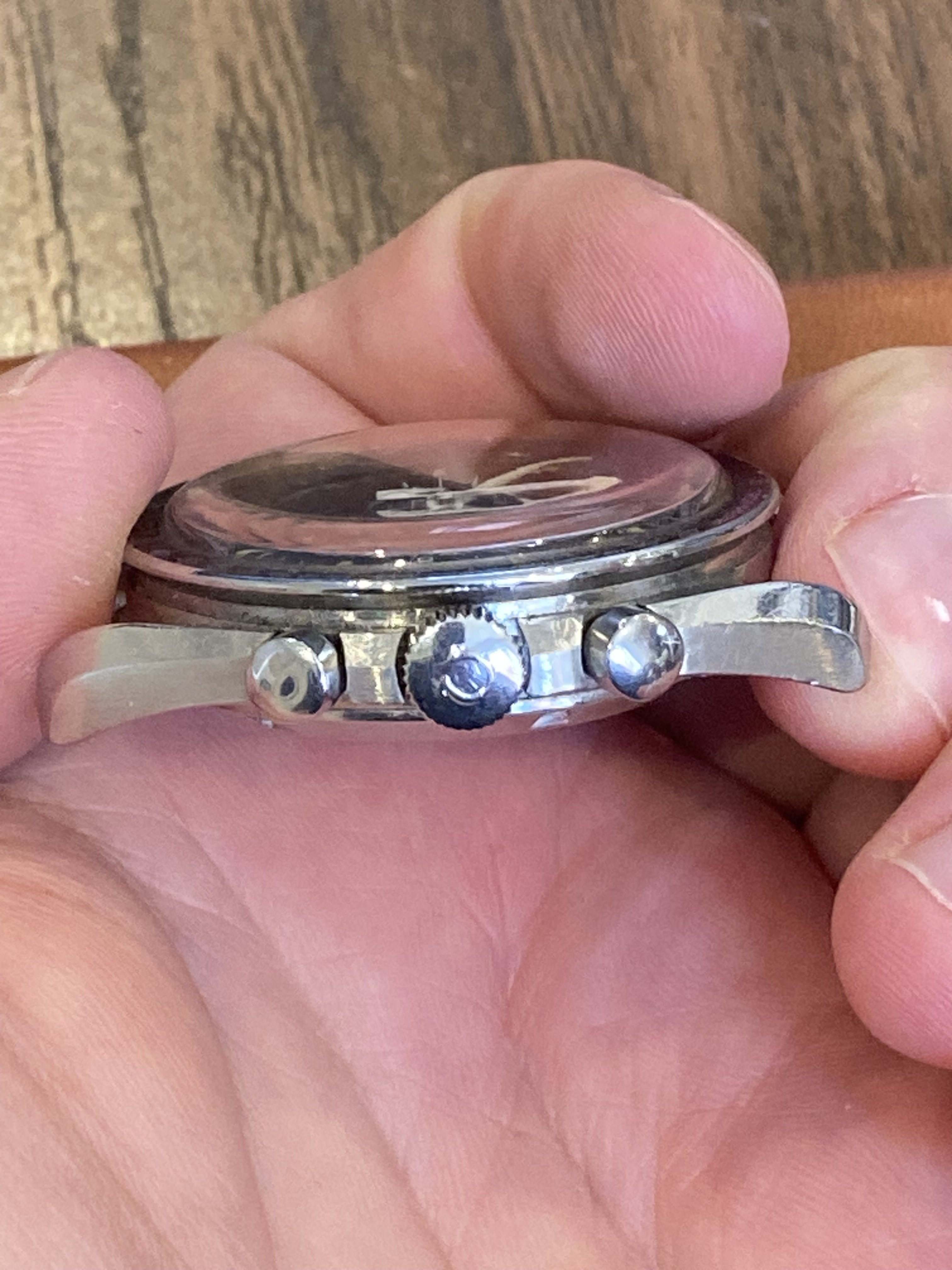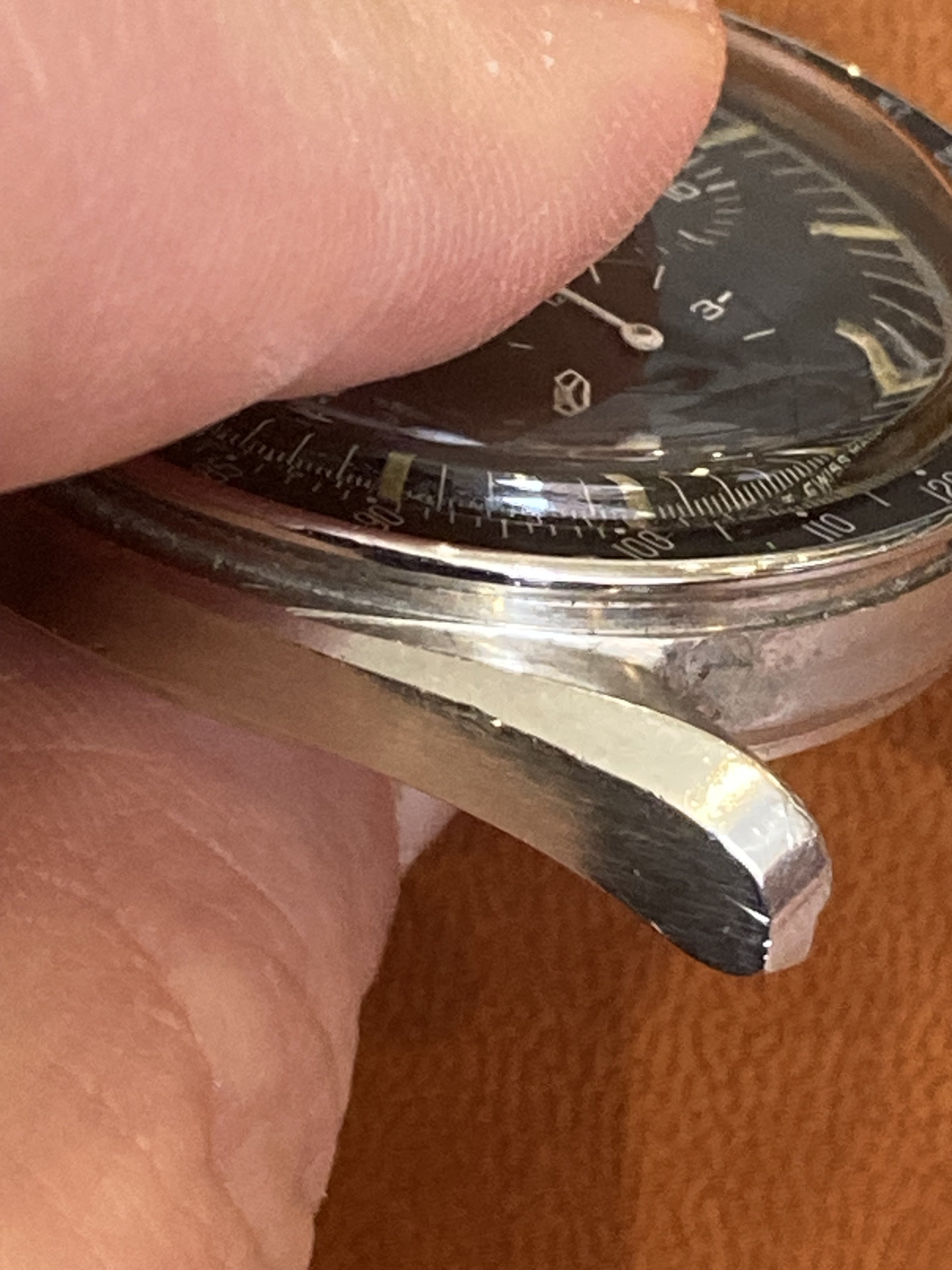 All parts are correct for the reference, still has its original short/fat pushers. The only cosmetic issue is that the chrono needle appears to have been clipped at the tip at some point, and the hands have apparently been relumed as they do not fluoresce under UV light like the dial does. Neither of these actions were done by me.