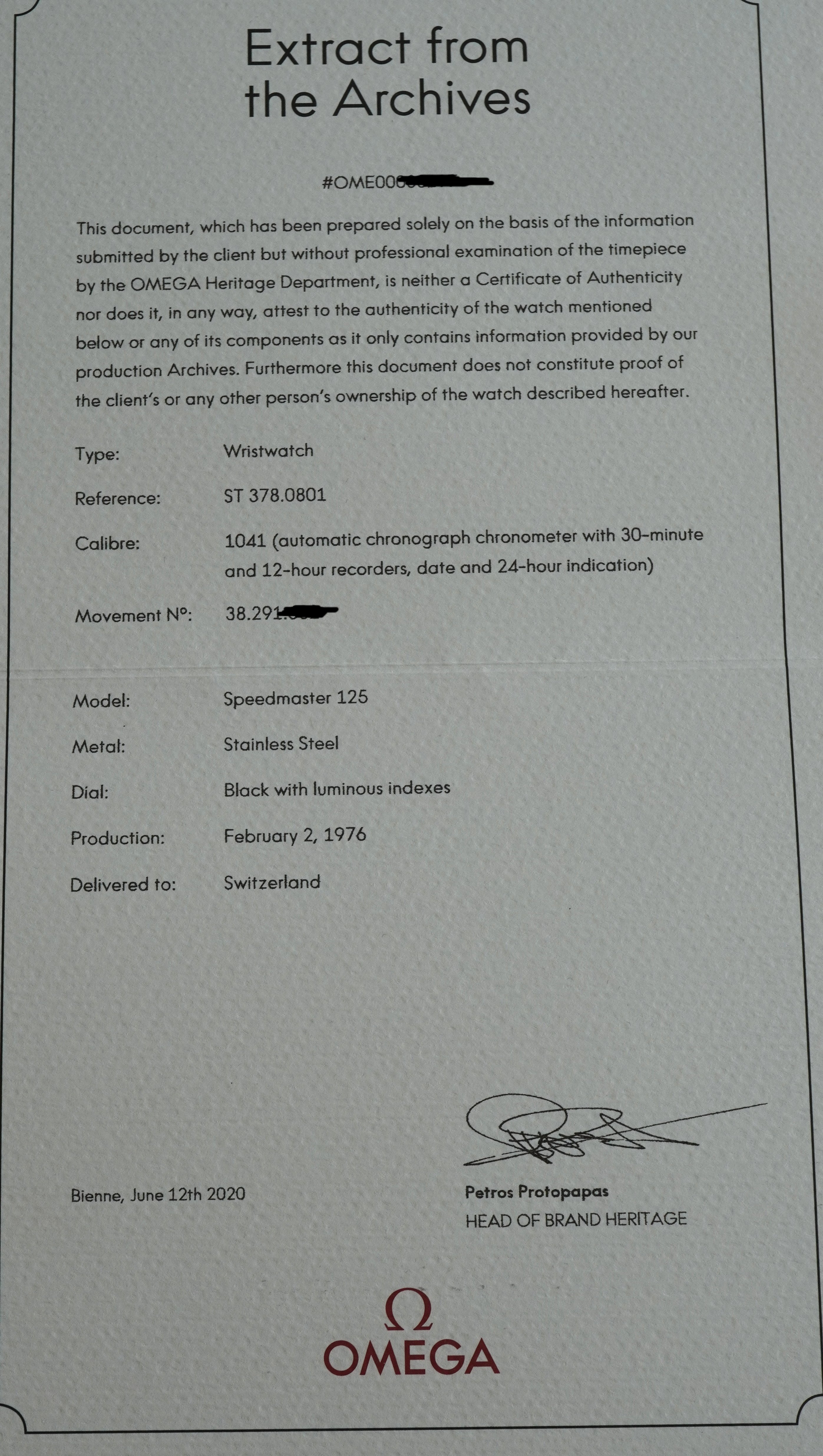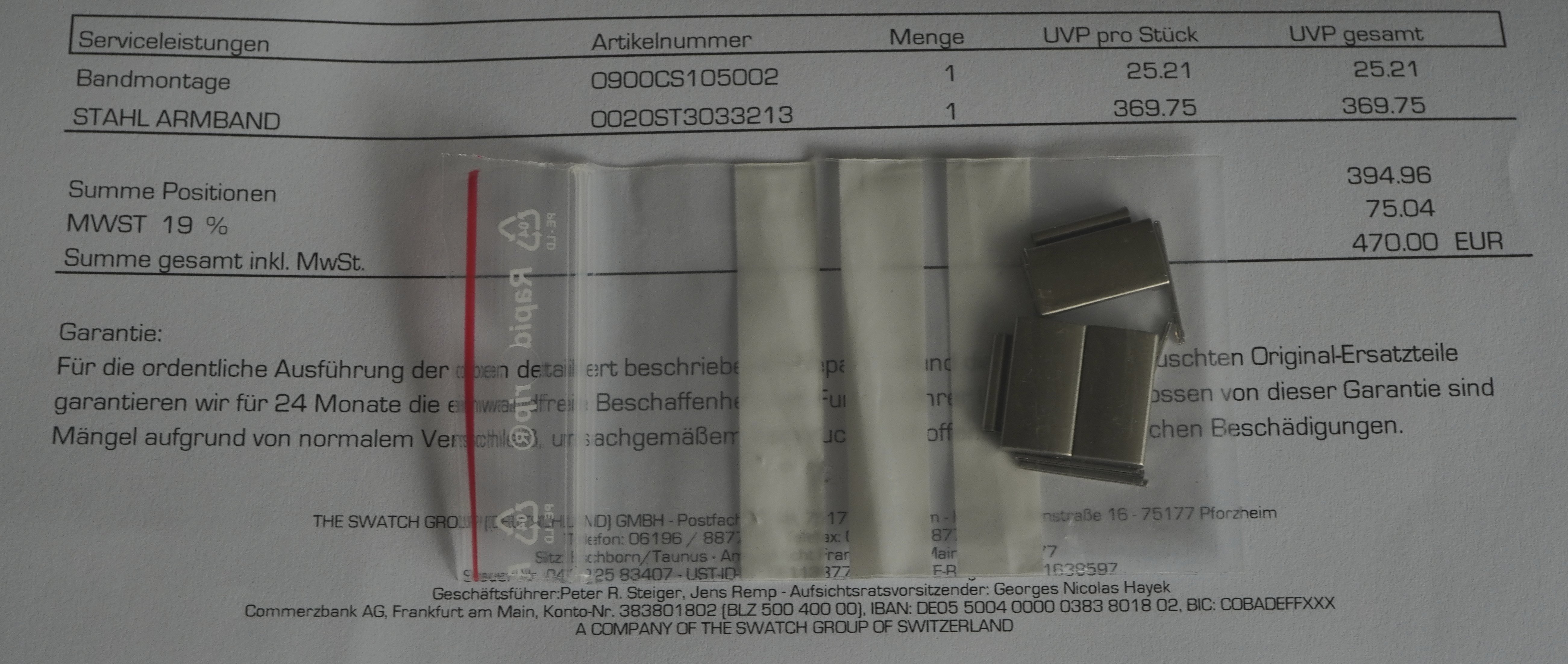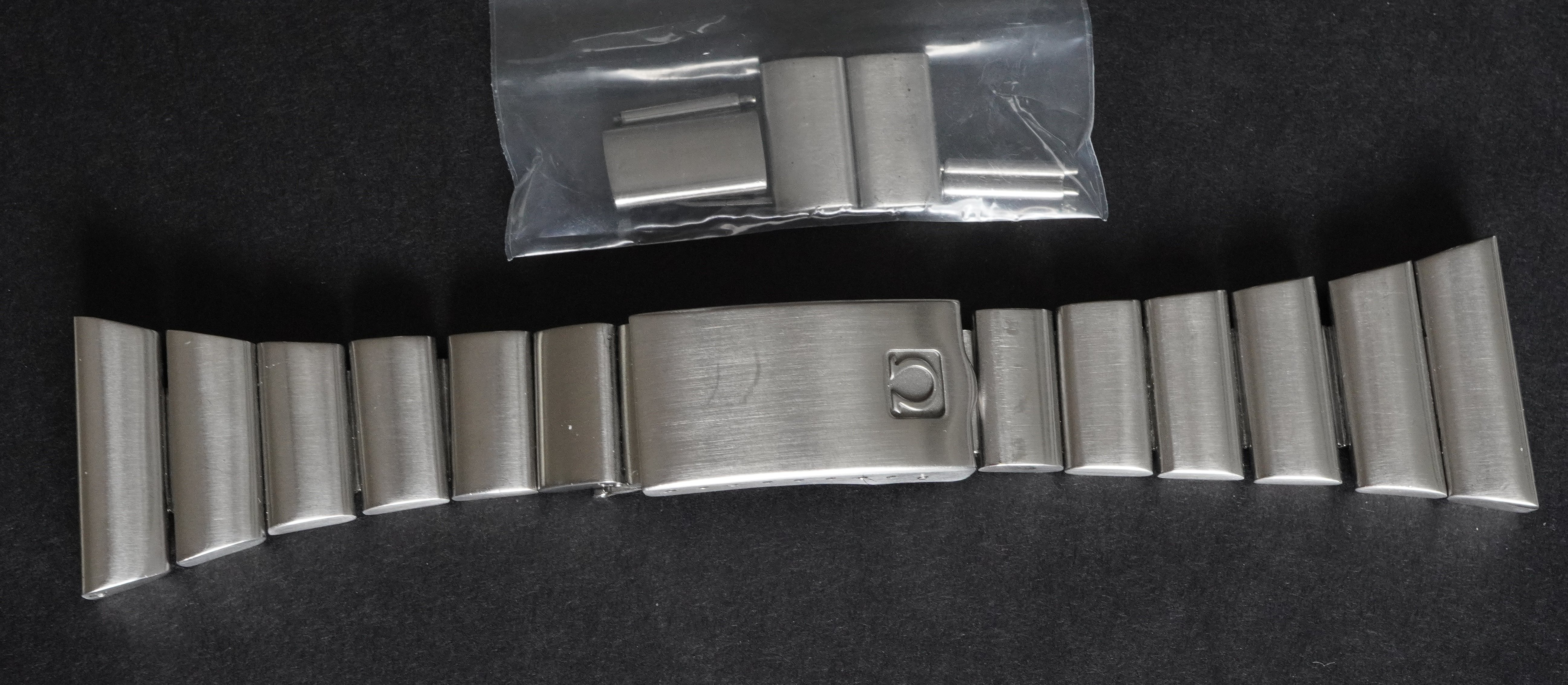 The original bracelet is broken but nonetheless included in the sale. The watch comes on the correct service bracelet which was added from Omega Switzerland in 2022 for 470€ (all links included). While they did that, they closed the caseback so good that I can't open it with my rubber ball anymore, so the pictures from the caliber are from 2020 when I got the extract. All other pictures are new.