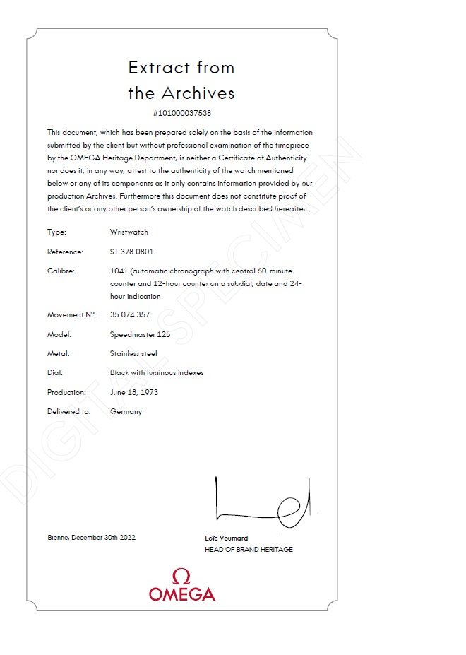 I want to emphasize that one detail needs to be discussed. The base plate has a caliber stamp 1040, whereas one would expect a caliber 1041. On the other hand the automatic bridge and the rotor are marked as one would expect it for a 1041. So, it might be that the base plate has been replaced by the technically identical 1040 base plate. Or, that at least some 125 had been made originally with a 1040 base plate. I may note that I have seen two other 125 also stamped 1040 on the base plate, so that either the latter assumption is valid, or an exchange of the base plate 1041 > 1040 was done more or less frequently for what ever reason. The extract from the archives does not provide any additional information. Anyway, interested persons should assume that in case of my watch the 1040 base plate is a replacement.