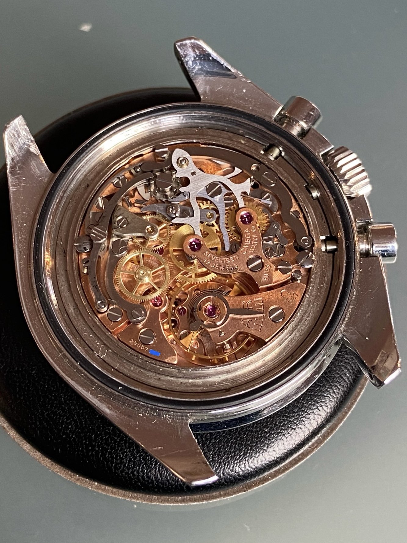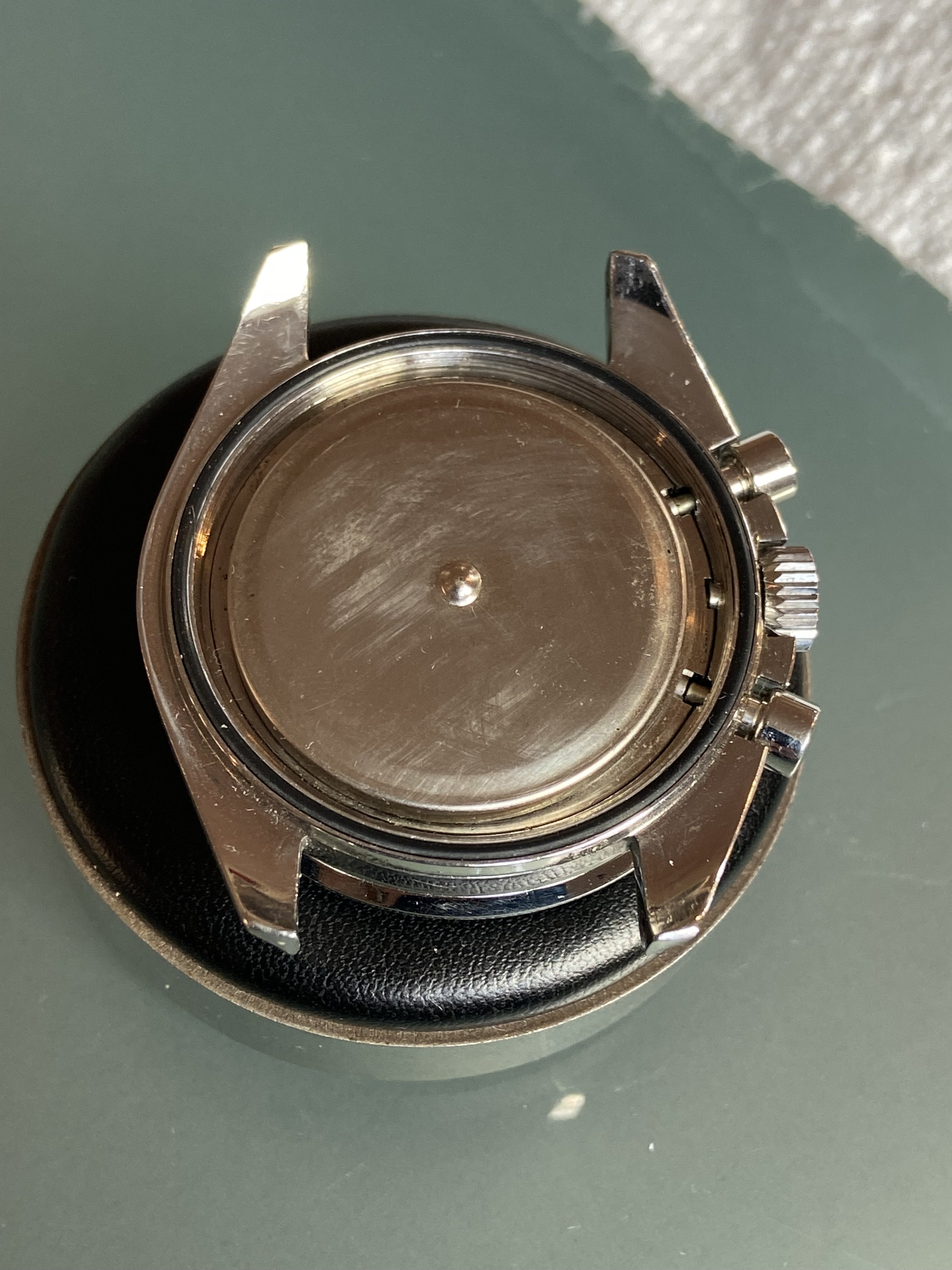 Movement: 321 movement operating correctly and keeping good time, with serial # in the correct range. No service history known, time setting is a bit stiff so service is recommended if buying to wear. Chrono starts and stops properly and resets with a nice snap. In the pictures I see the chrono resets to one tick off dead 12:00 reset, I didnt really notice it until the photos. It is not creep, it resets to the same point each time and stays there. It should be easy to realign during service.