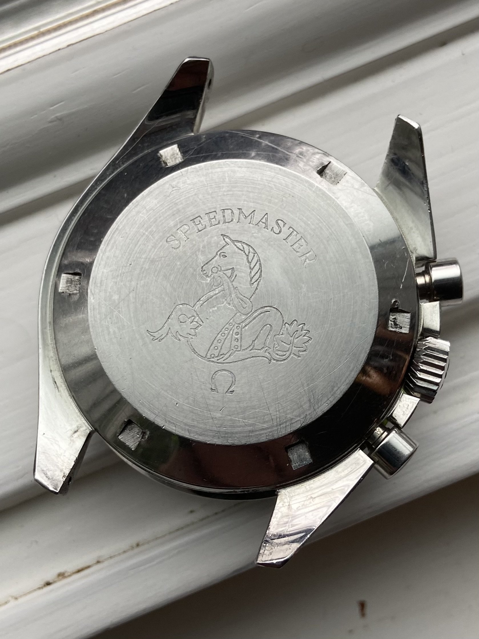 Caseback: strong seamonster/hippocampus logo, a few light marks from a bad opening.