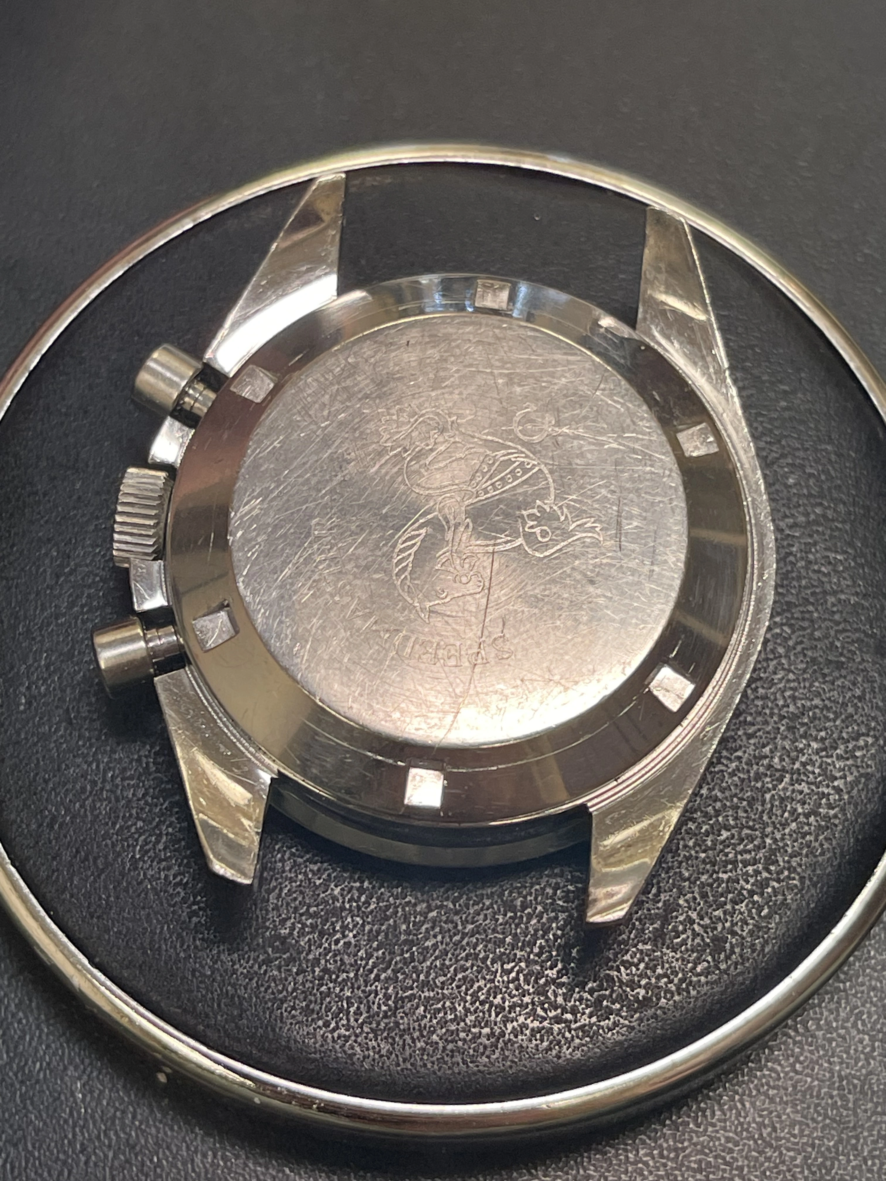 The easy part….The crystal is cracked/destroyed, no top pusher, and the crown does not belong to the watch.