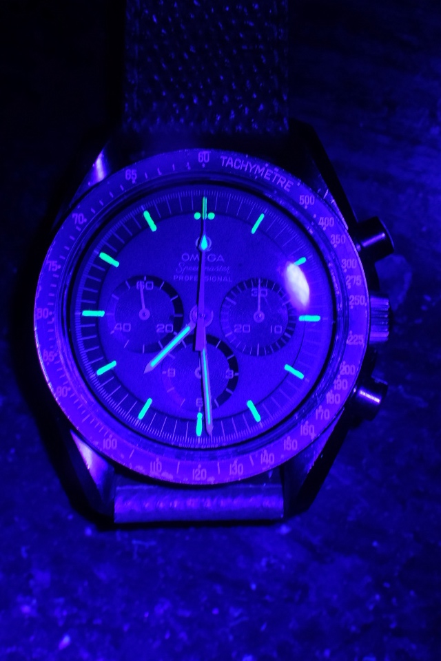 Dial: Lovely condition step dial. Dial lume is a lovely pale creamy color, not an outright yellow seen on many other speedies. Very slight lume loss at 3 o'clock beyond the step.