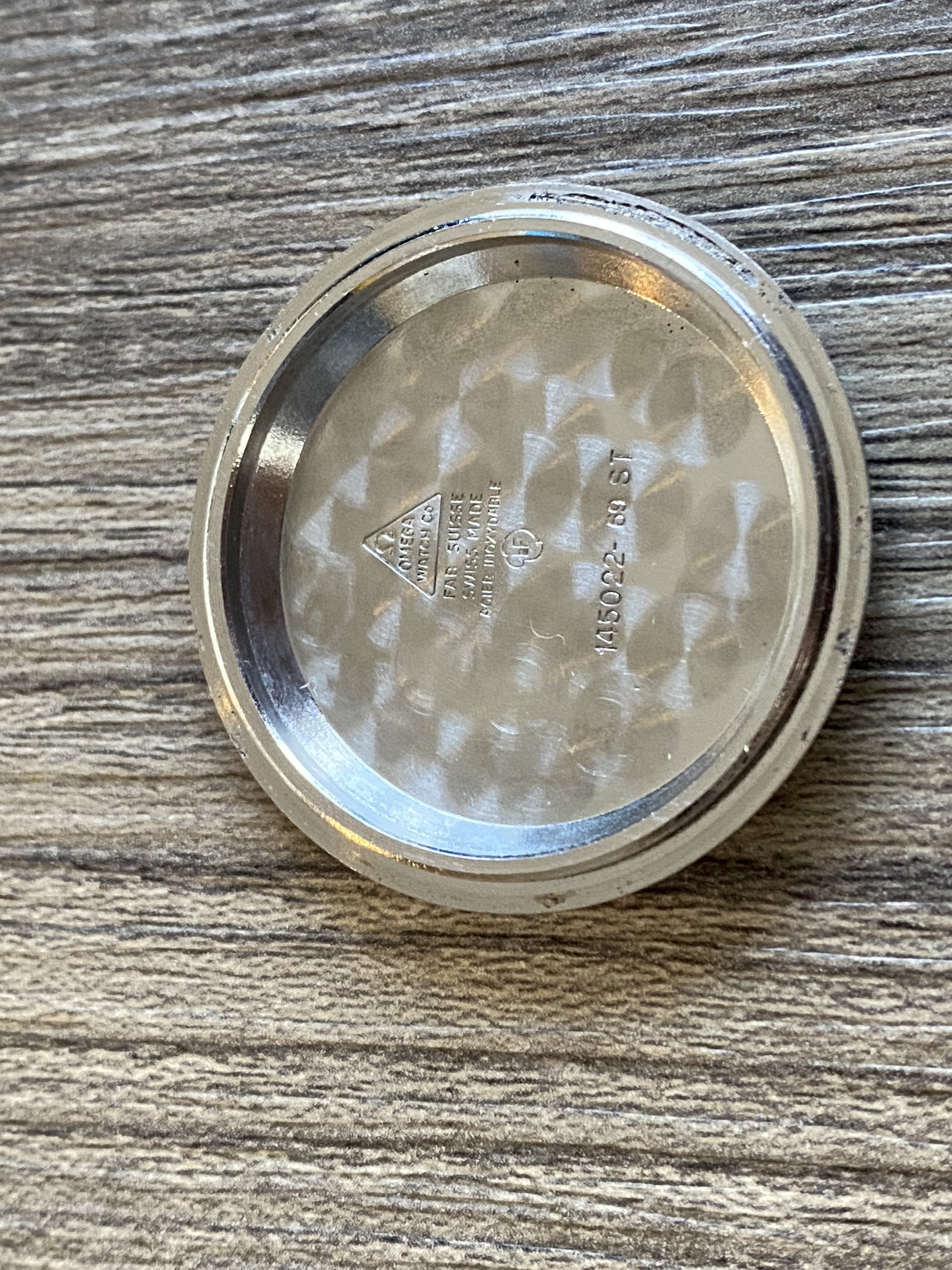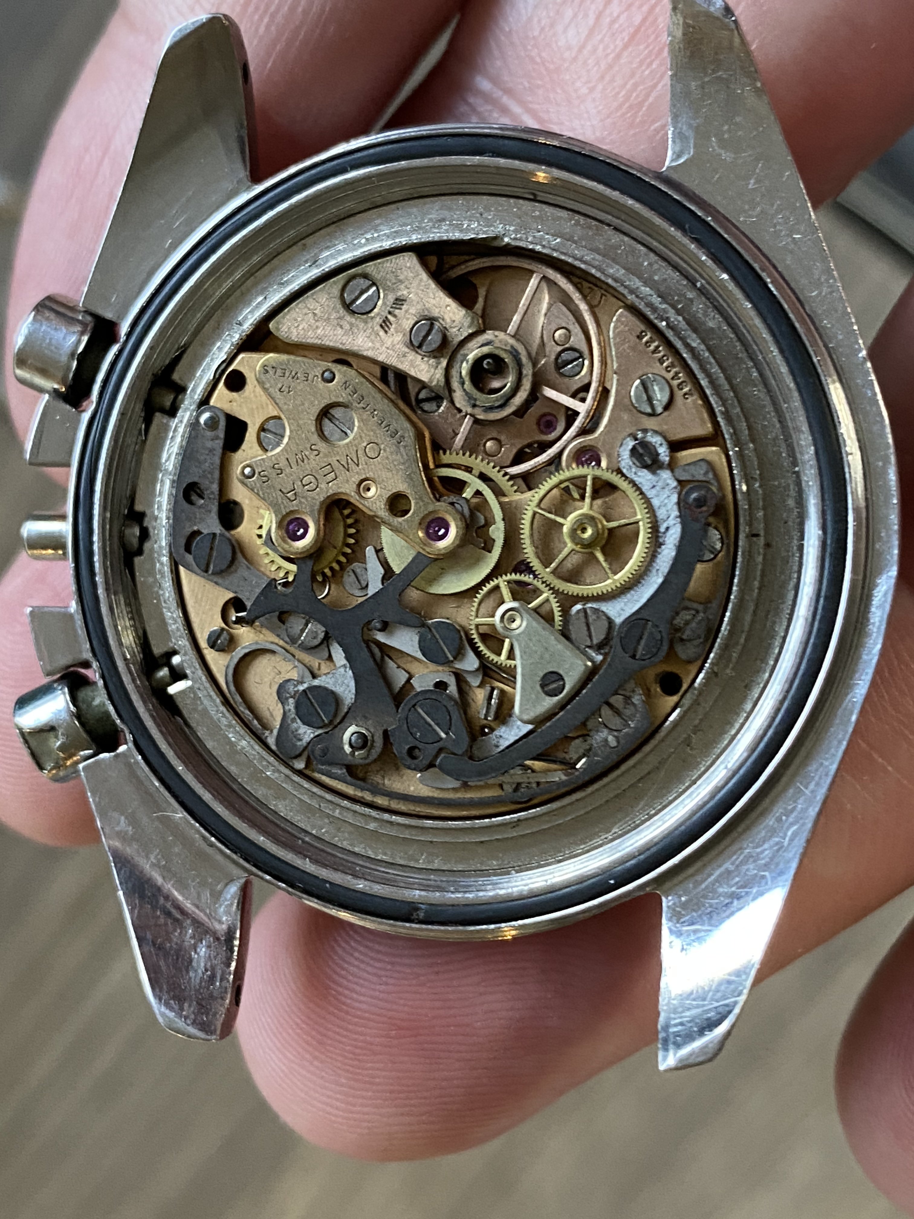 Included are a 145.022-69 HF case in very nice original condition, two original pushers with normal wear in the chrome plating and a small loss of the shell, original Omega signed crystal (logo visible in the last pic), original inner movement cover, 861 movement with 28mm serial number (incomplete but the important stuff is there) and a set of hands that it came with. I wouldn’t know if these are restorable or not, specially the sweep second hand which rotates freely.