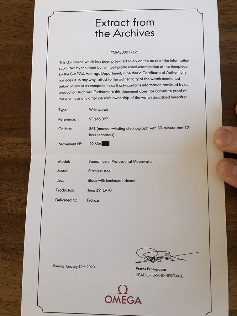 It also comes with its extract of archives, the watch has been produced on the 19th of June 1970, and delivered to France, where I bought the watch.