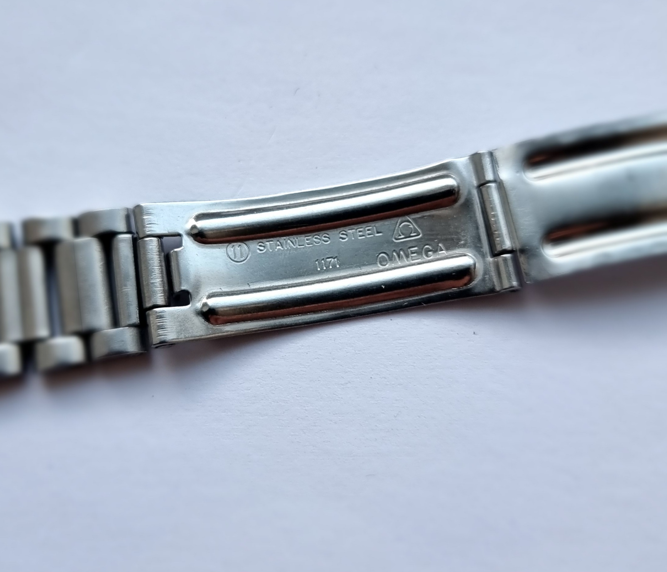 All parts are original and correct, including the 1171/633 bracelet with 'trapezoid' clasp. The bracelet will fit a wrist of approx 7 inches. Extra 1171 links are fairly easy to find if needed. The pushers are original, as is the wide 24 tooth crown. The dial and hand lume is original and has aged with a nice vanilla patina.