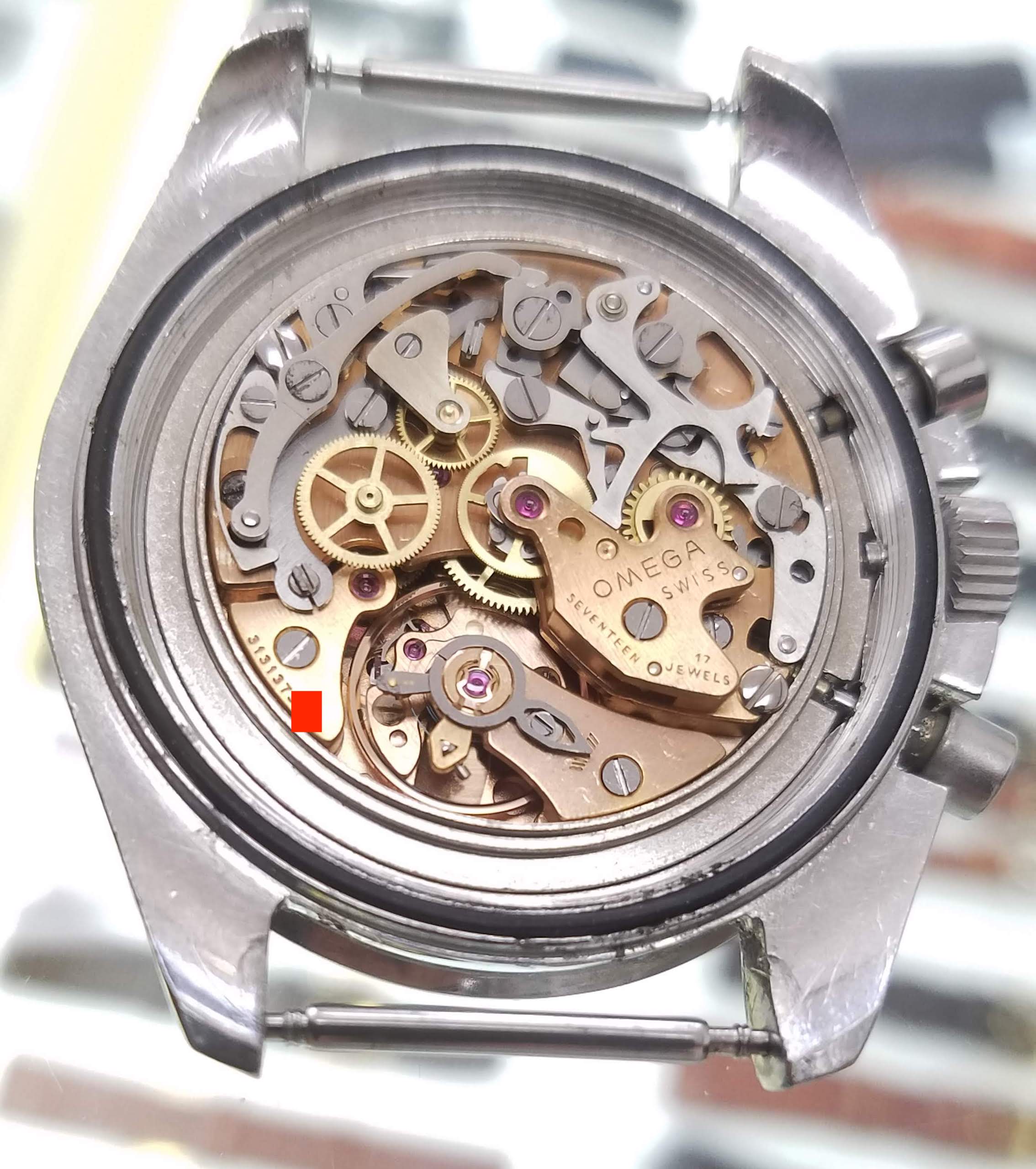 · Wear on the caseback matches wear on the case; part of the hippocamp logo and “Speedmaster” is worn off.