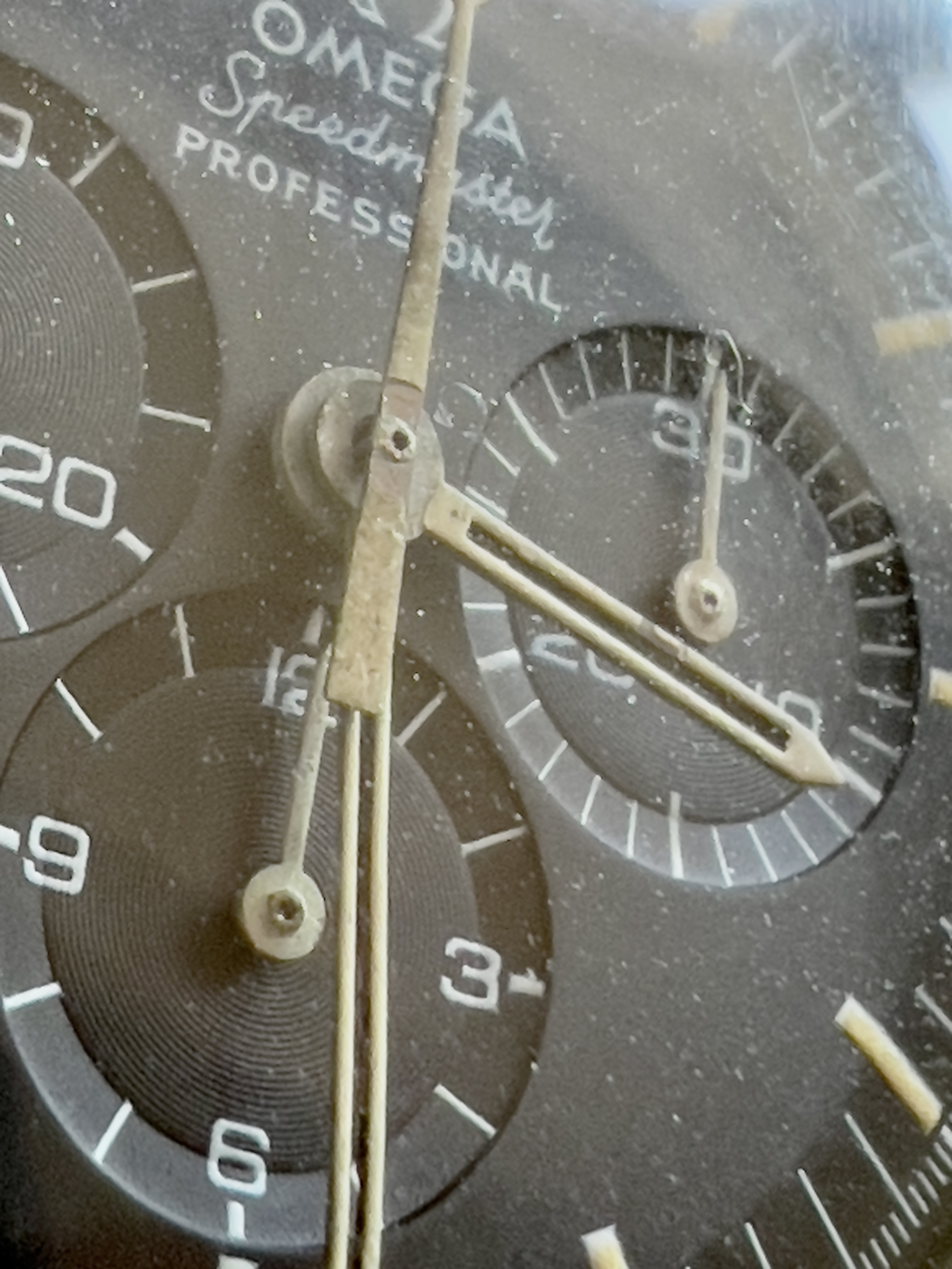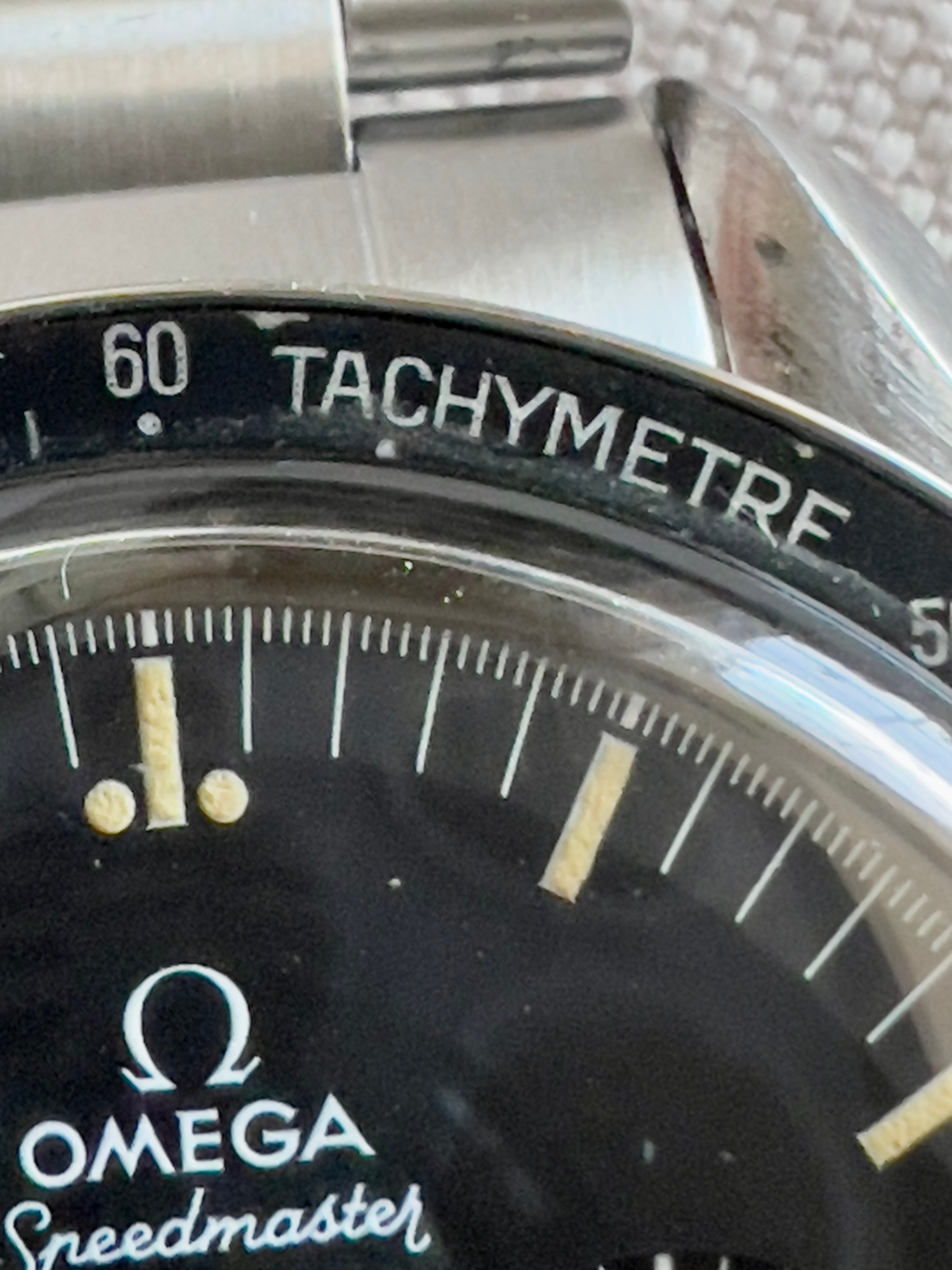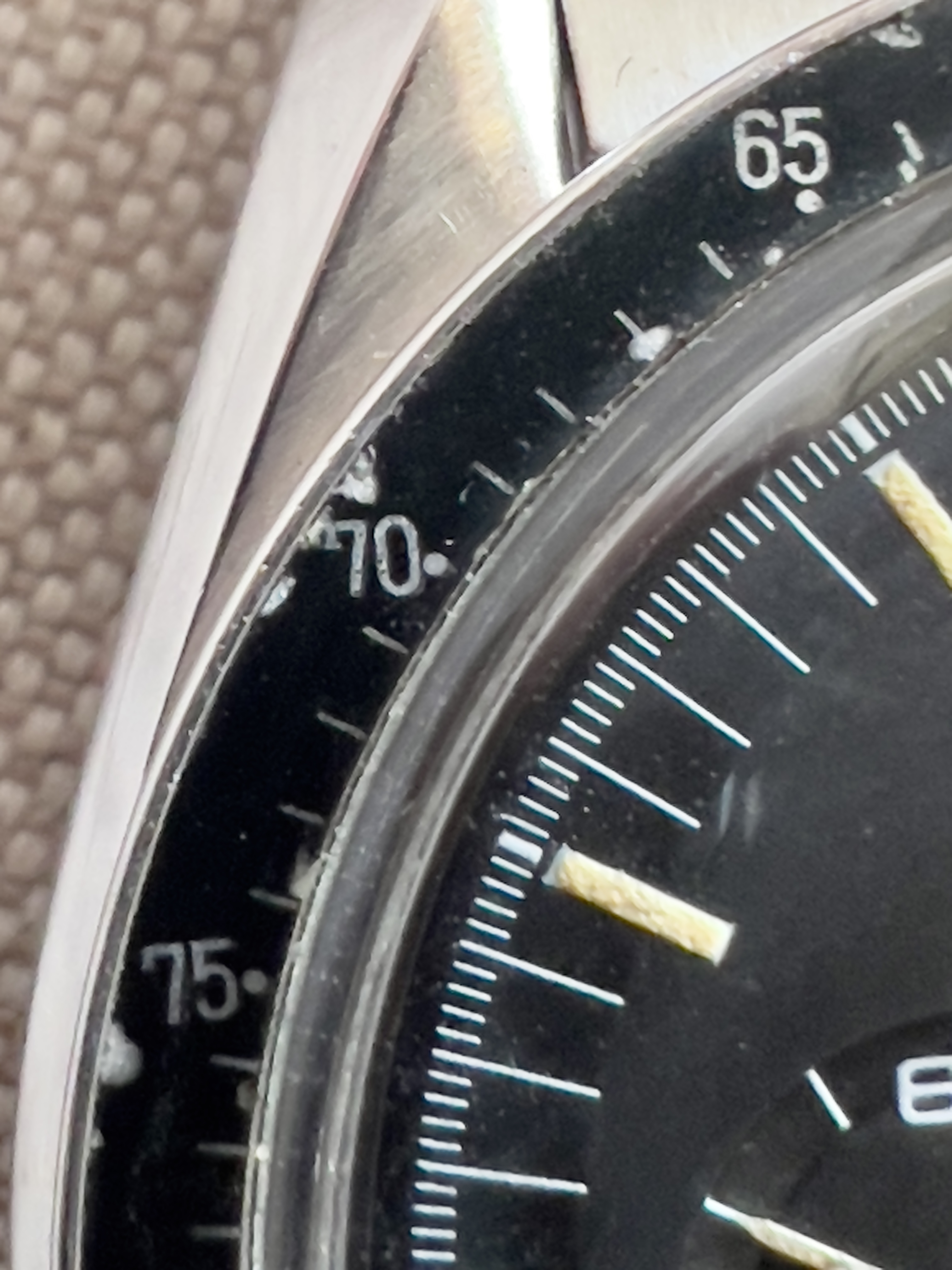 The next issue is the lack of a DON bezel although Moonwatch Only does indicate that 69ST watches left the factory with several different bezels, so I think I can assume that mine having a “Dot close to 70” bezel and a “narrow C” in Tachymetre means it can feasibly be the original.