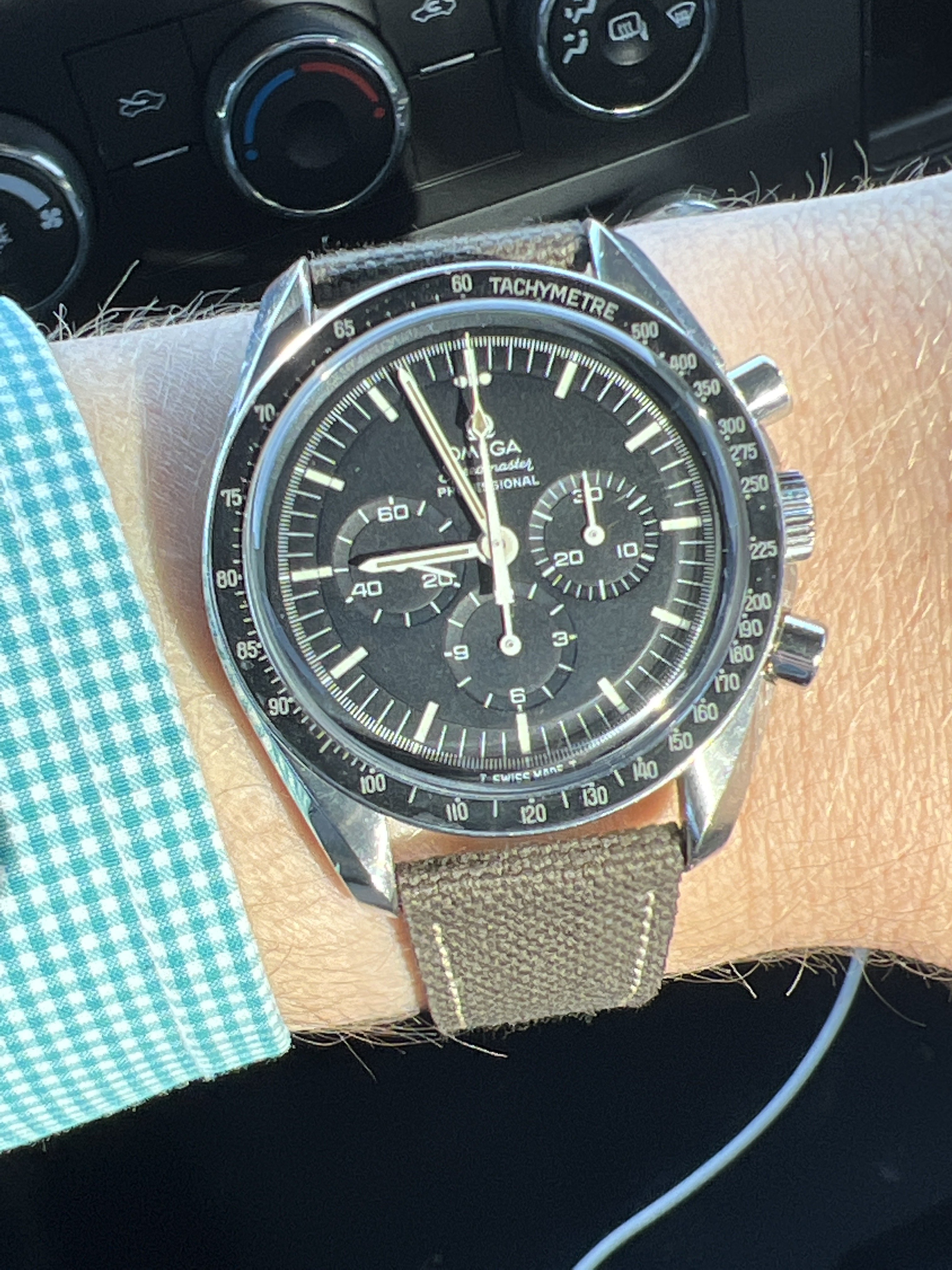 Watch was recently serviced (2022) with an astute attention to detail by OF's favorite Canadian watchmaker. I will send documentation to the buyer. Watch also comes with an extract of the archives. Watch runs as it should and the chronograph resets properly. Case has some innocuous scratches and marks from 50 years of honest use. Because I think it would be a sin to take it off its current strap, it will be included (NOStime olive green hanpu canvas/leather msrp $110).