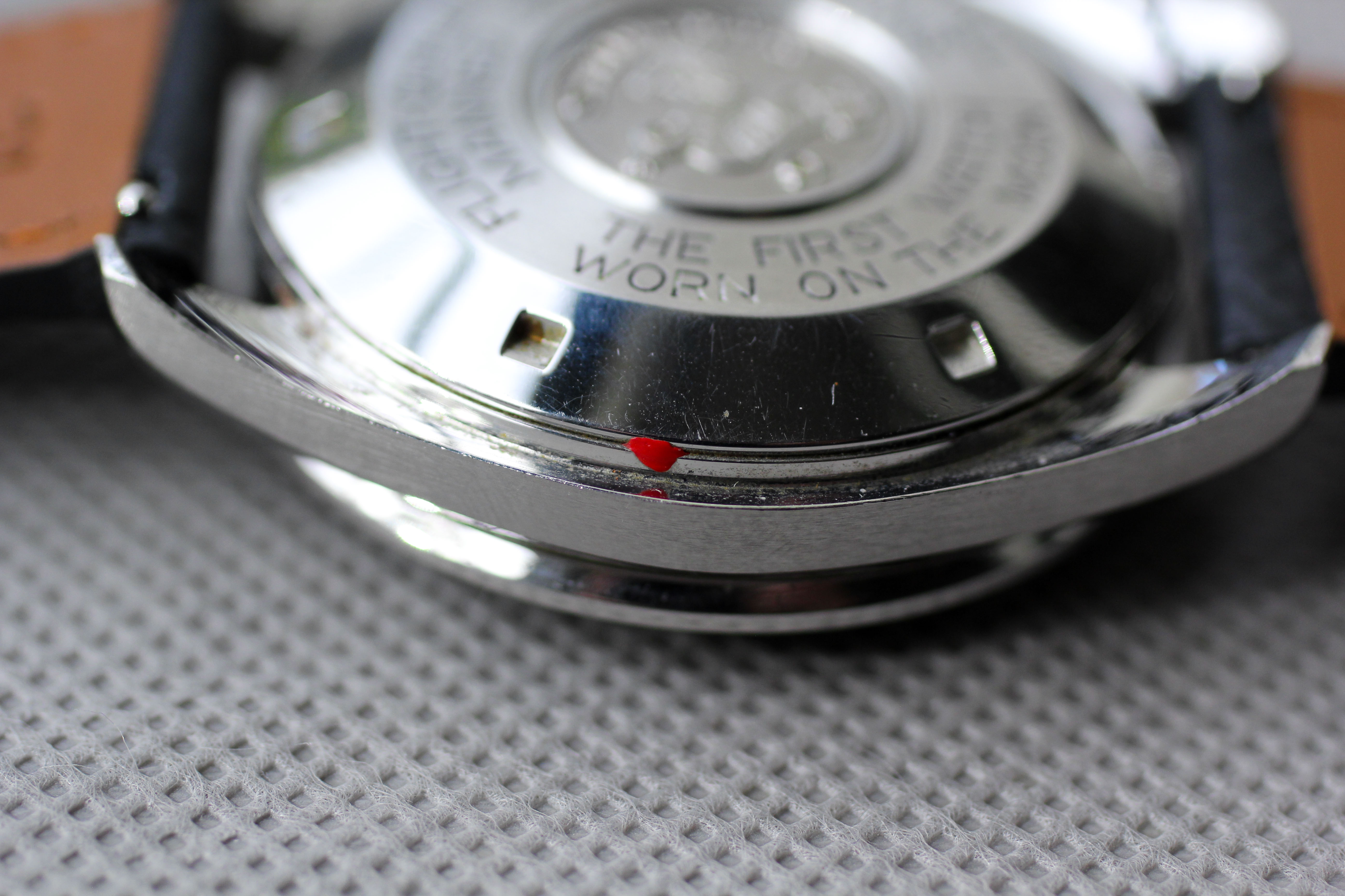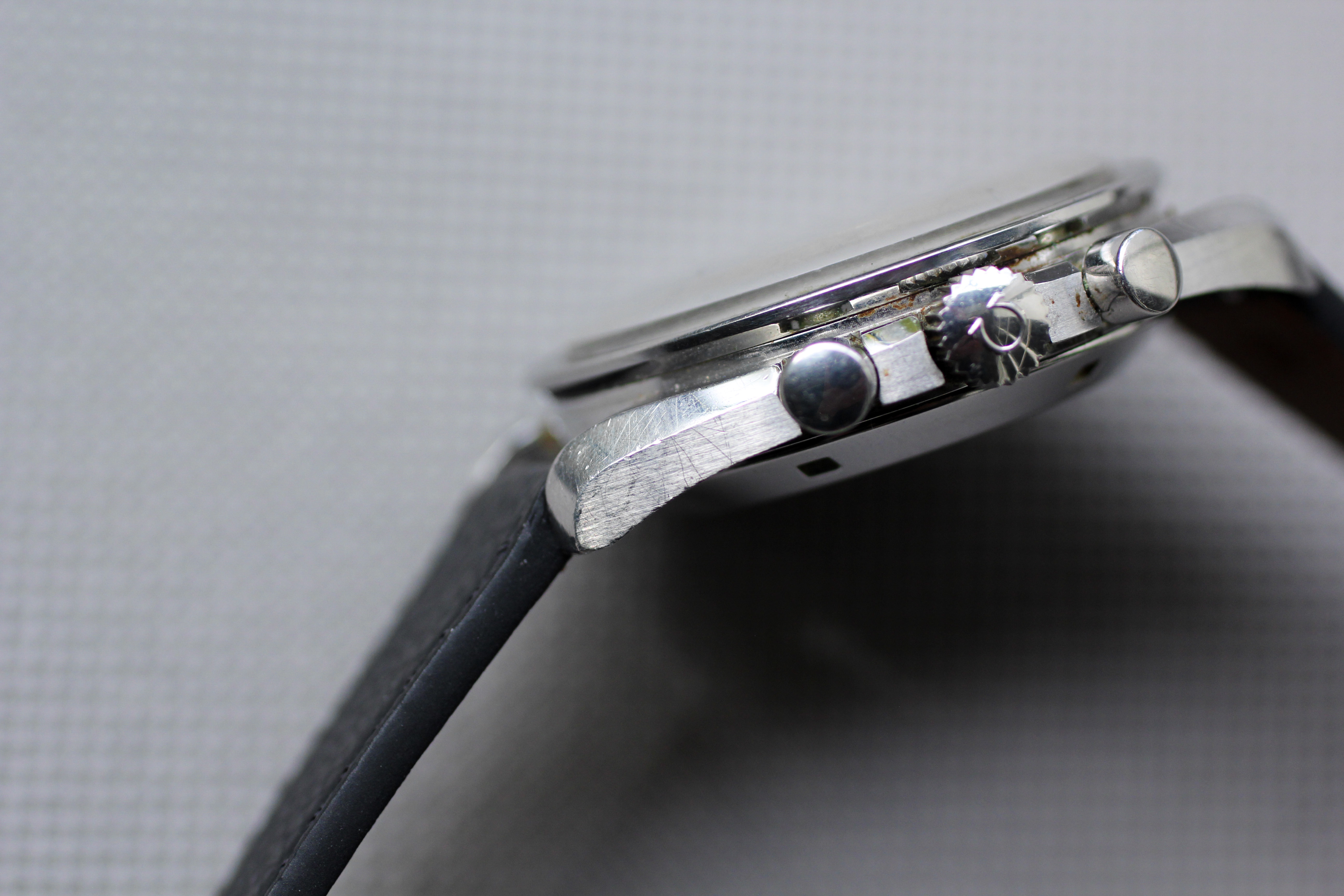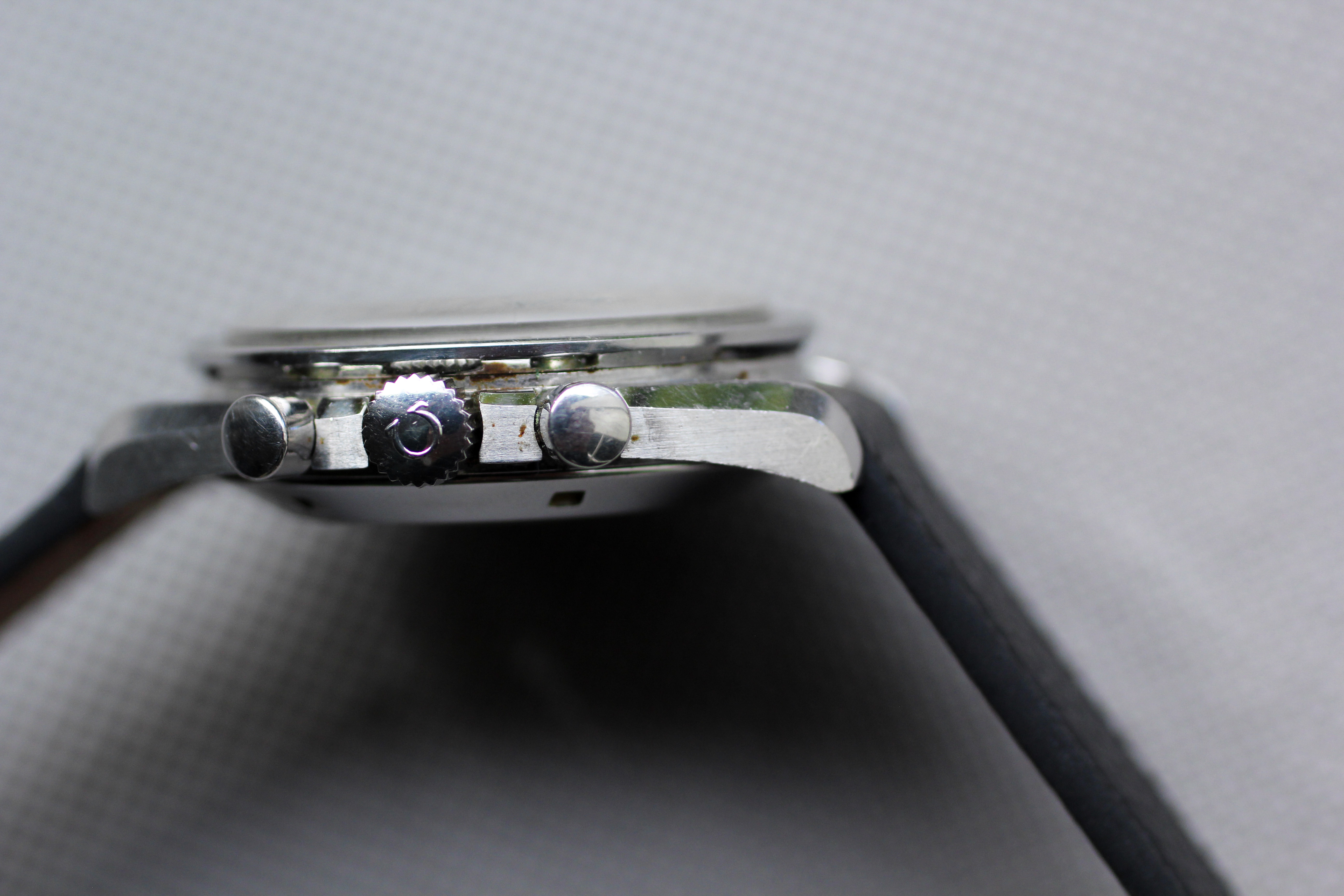 Case: The watch was a true "original owner special" in terms of detritus when I purchased it (see pictures at the end for the "before" state). I have sympathetically cleaned it up with q-tips, but there are still a few spots - obviously an ultrasonic bath would clean all of this up, should it be serviced. Professional case is unpolished and original finishing is still intact and super crisp. Caseback is nearly perfect, with only minor black paint loss in one spot (talk about rare!). The only issue with this watch is the underside of the top right and bottom right lugs. There is minor surface corrosion (no rust, the dark spots are dirt / detritus) that I have captured in macro pictures and corresponds to the areas that were caked in the most detritus (see last two pictures). The owner also lightly inscribed numbers (perhaps the last four of his SSN) on the underside of the lugs.