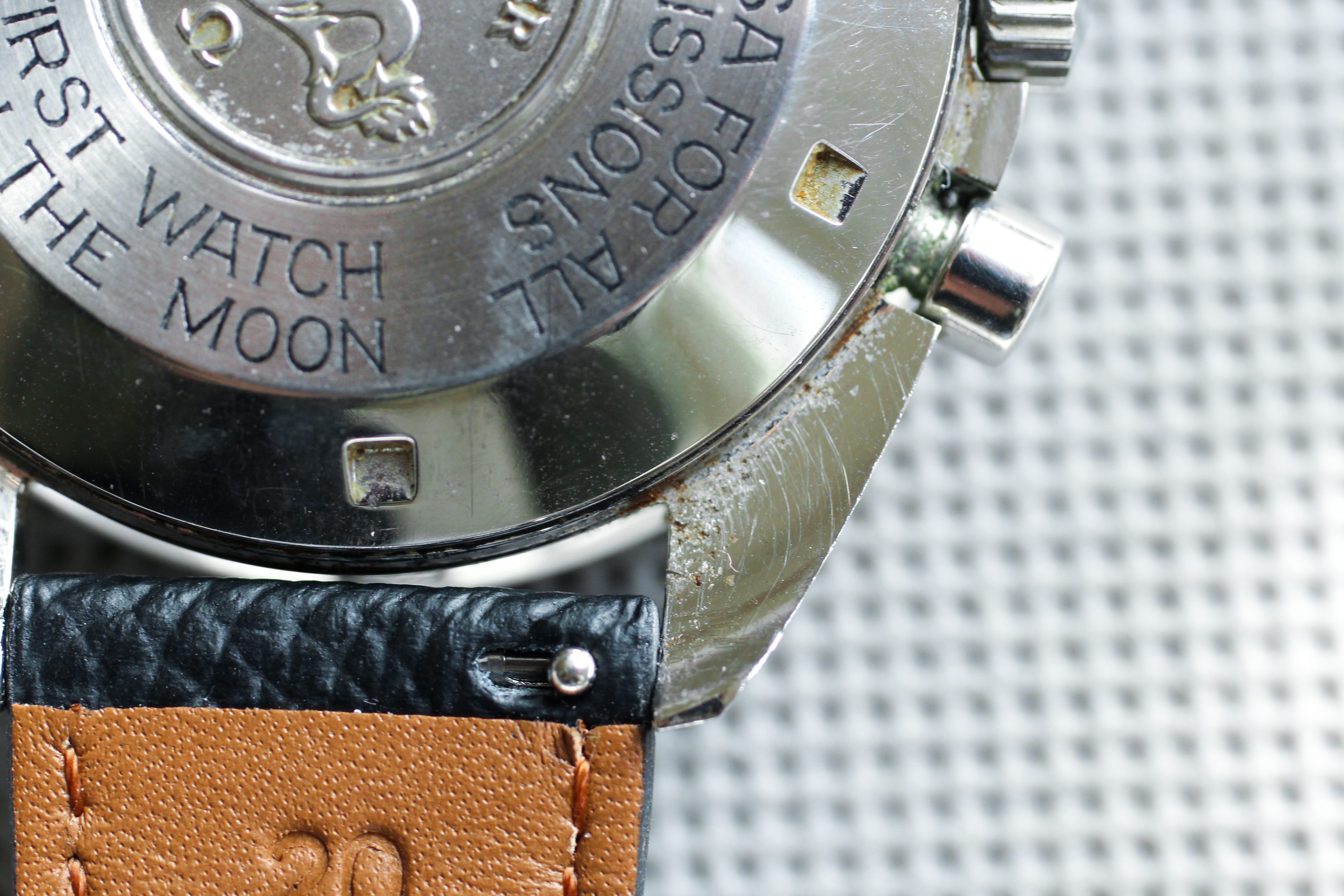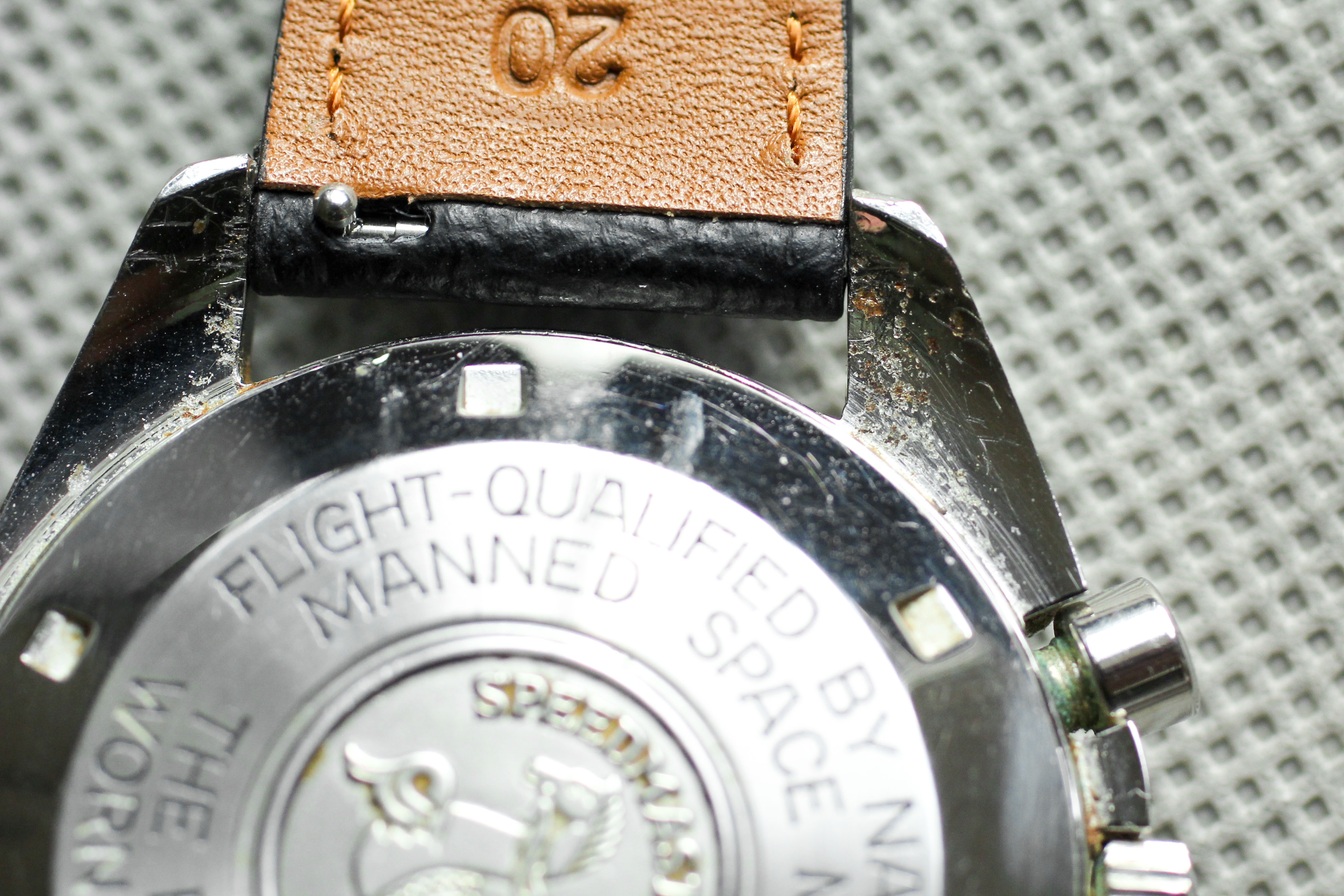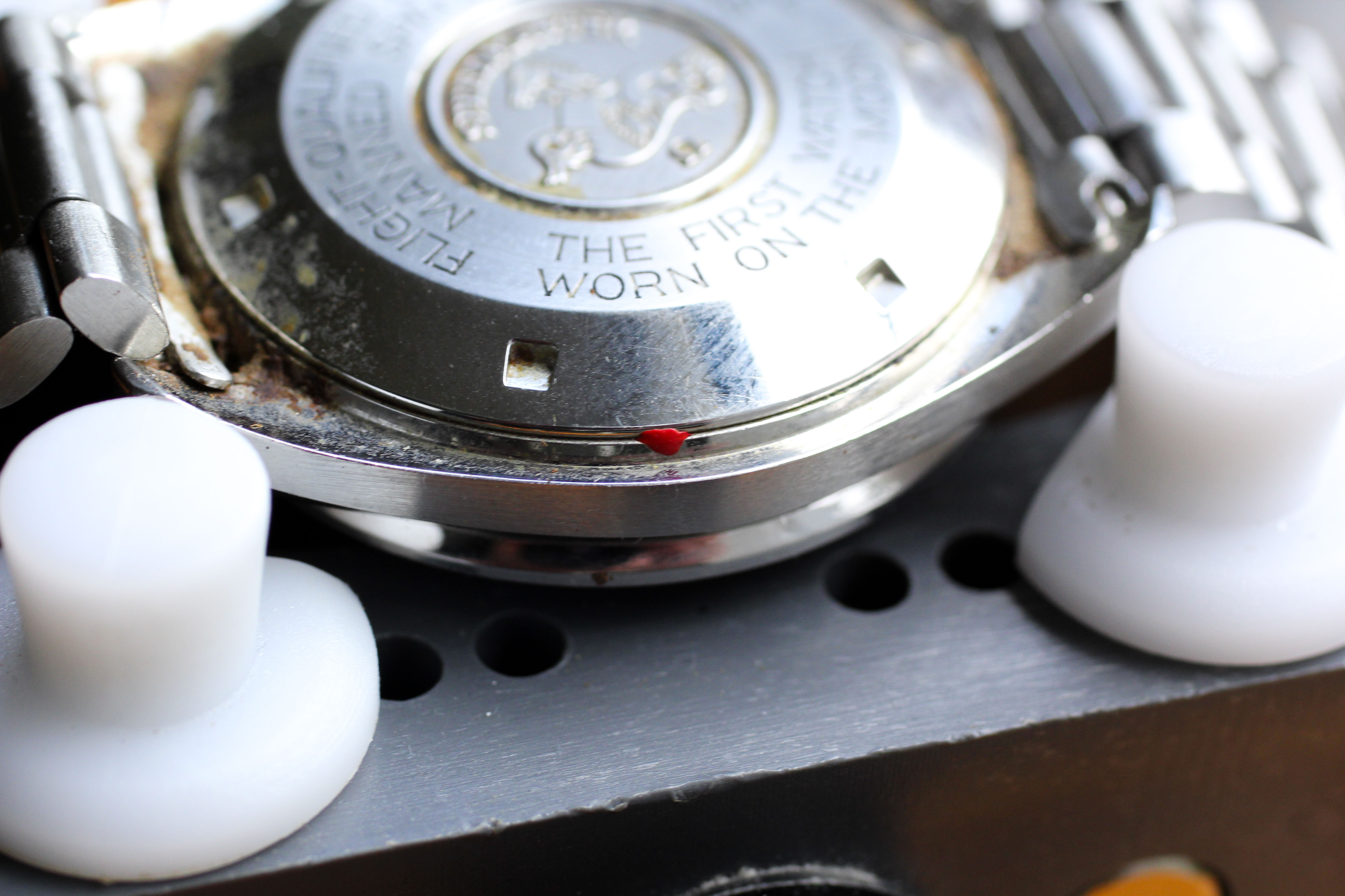 Case: The watch was a true "original owner special" in terms of detritus when I purchased it (see pictures at the end for the "before" state). I have sympathetically cleaned it up with q-tips, but there are still a few spots - obviously an ultrasonic bath would clean all of this up, should it be serviced. Professional case is unpolished and original finishing is still intact and super crisp. Caseback is nearly perfect, with only minor black paint loss in one spot (talk about rare!). The only issue with this watch is the underside of the top right and bottom right lugs. There is minor surface corrosion (no rust, the dark spots are dirt / detritus) that I have captured in macro pictures and corresponds to the areas that were caked in the most detritus (see last two pictures). The owner also lightly inscribed numbers (perhaps the last four of his SSN) on the underside of the lugs.