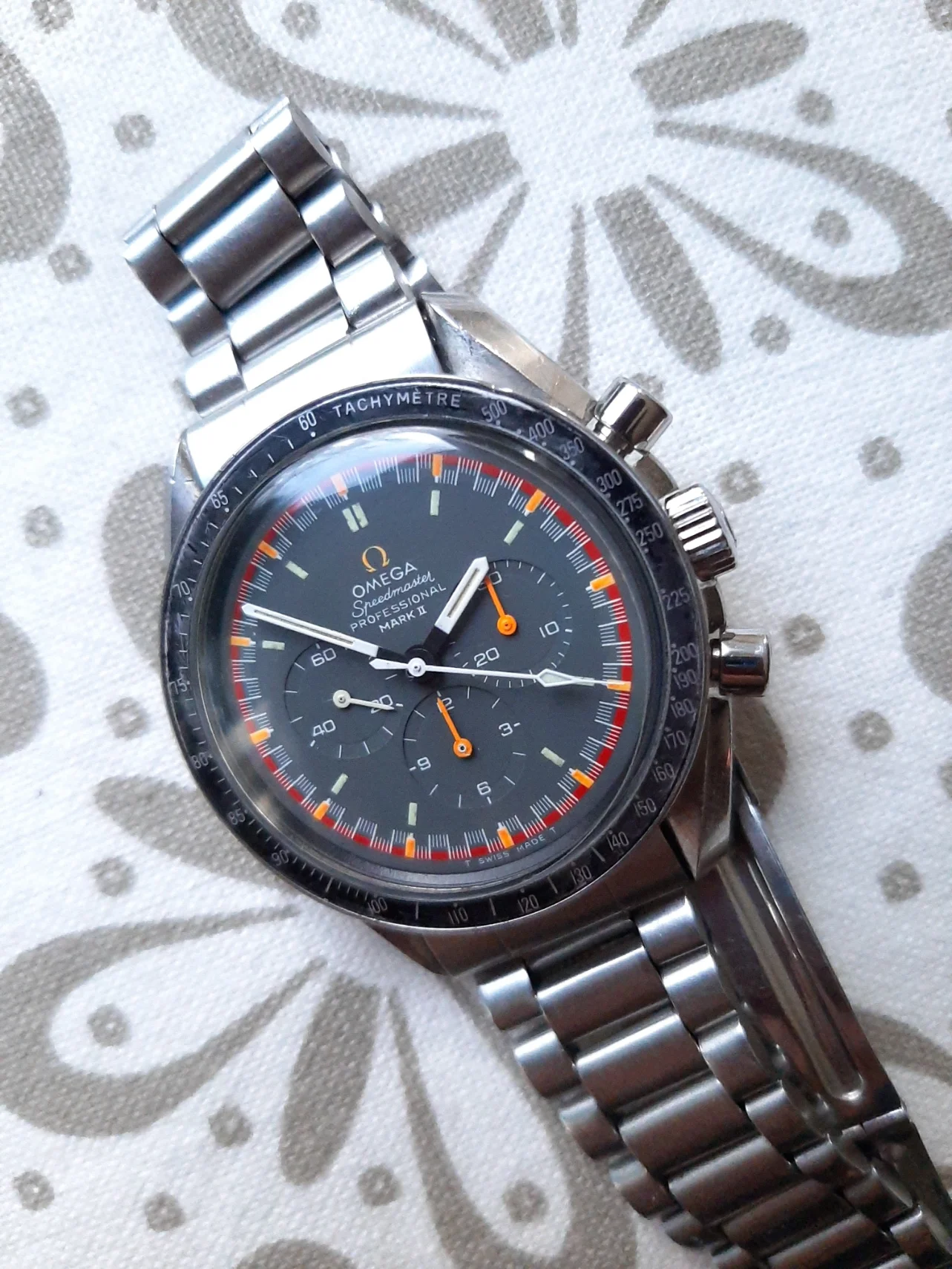The dial is in beautiful condition with bright orange and red colours, full Tritium lume on the markers, please see the UV picture, and the glow only last a few seconds. Caseback is a NON NASA style to stay with the racing theme. Movement is serviced by a certified Omega watchmaker in August 2024 ( see pictures ) so all functions are 100%, 282 amp with good PR and 3 ATM WR. Runs at +/- 5 sec p/d.