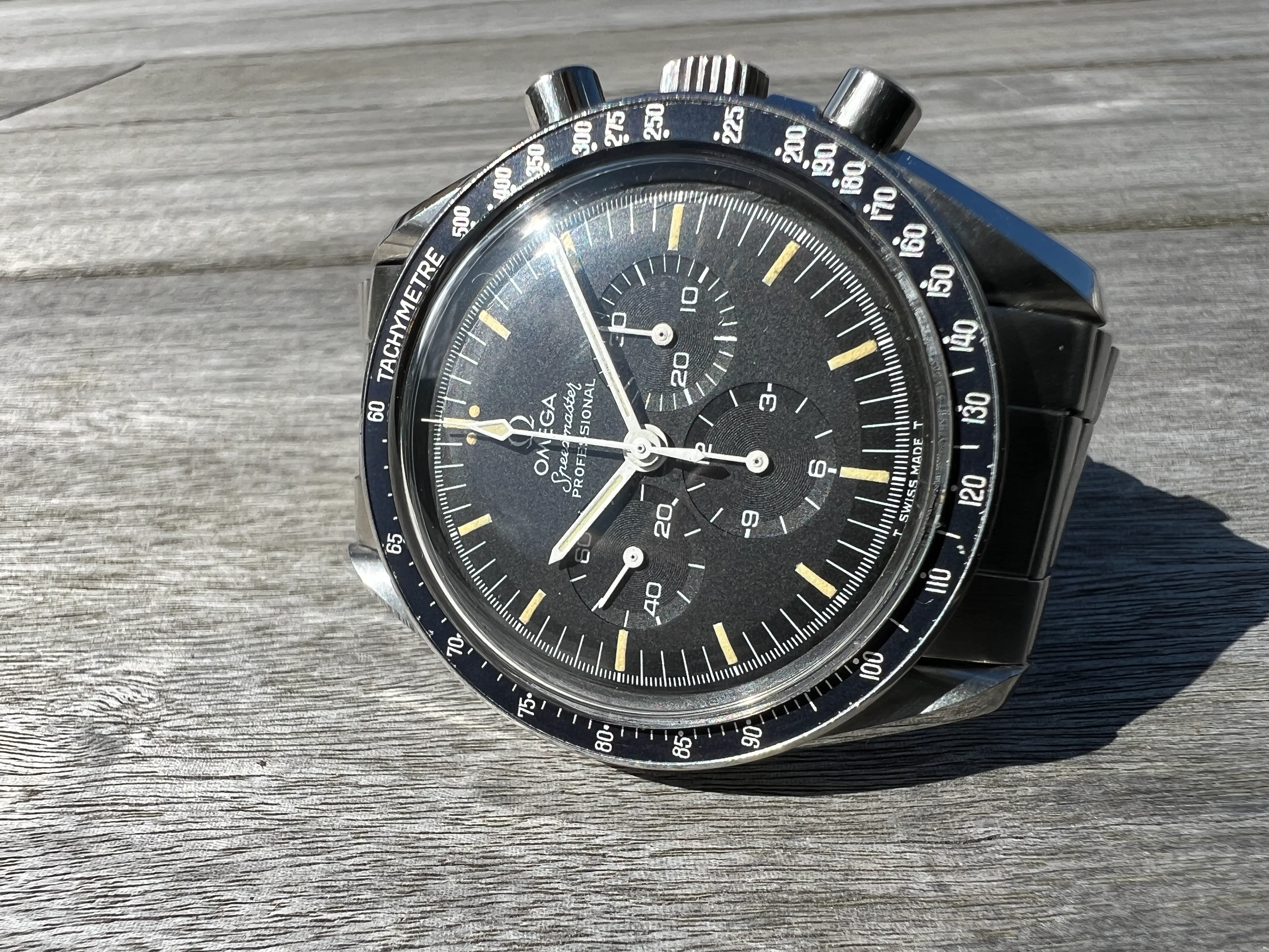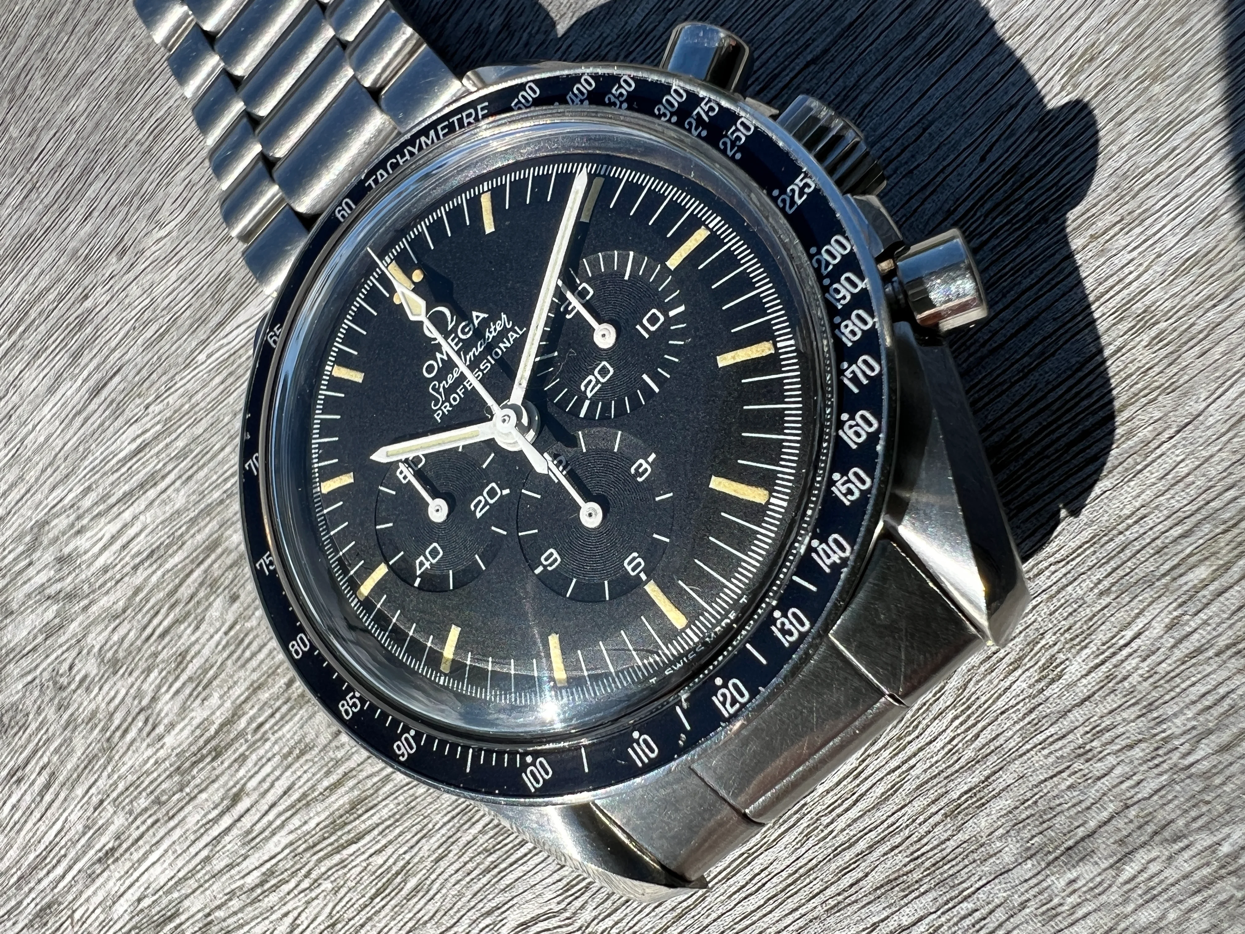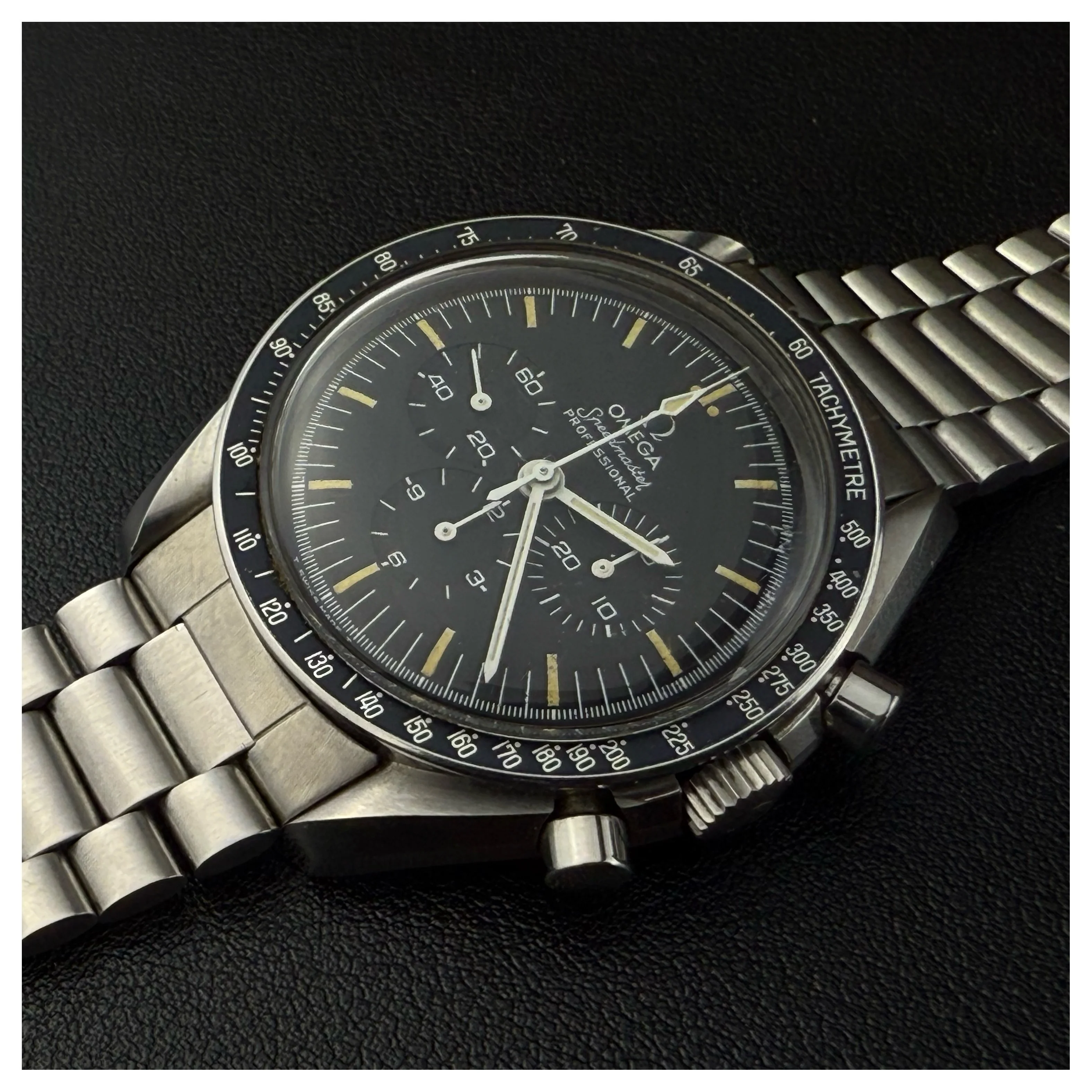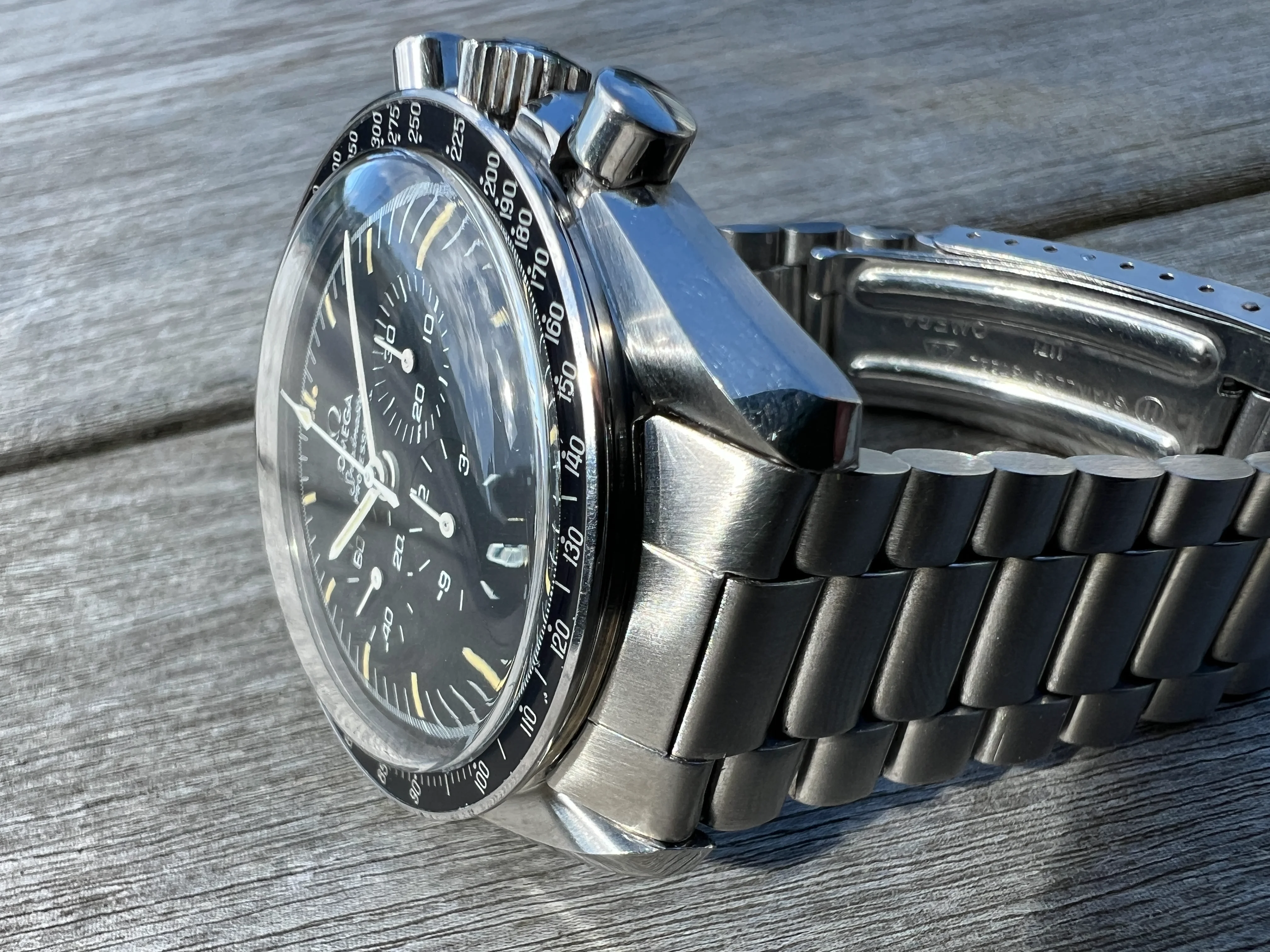 Apart from the nice dial, the case is what stands out to me and could be a giveaway regarding the reference. Given how sharp the case is and the fact that there are some points of wear, I am going to assume our quiz watch isn't polished and if it has been, it has been done very lightly. When one compares the 'feet' of the lugs (where the case lugs on the wrist) of the quiz watch case with the 145.022-78 shown above, it stands out that the surface area of the feet of the lugs is bigger (wider) on a 145.022-78. I can confirm one of my own 145.022-78's has the same, the case of a -78 seems a bit more beefy. So, I am inclined to believe this isn't a -78 but a -76. Note that it is pretty difficult to identify a 70s / 80s Speedy by its case profile with such poor side pictures.