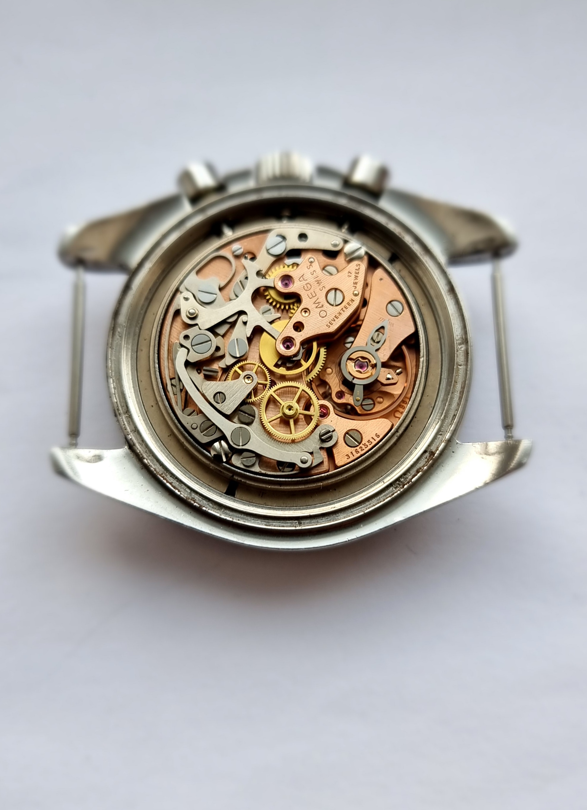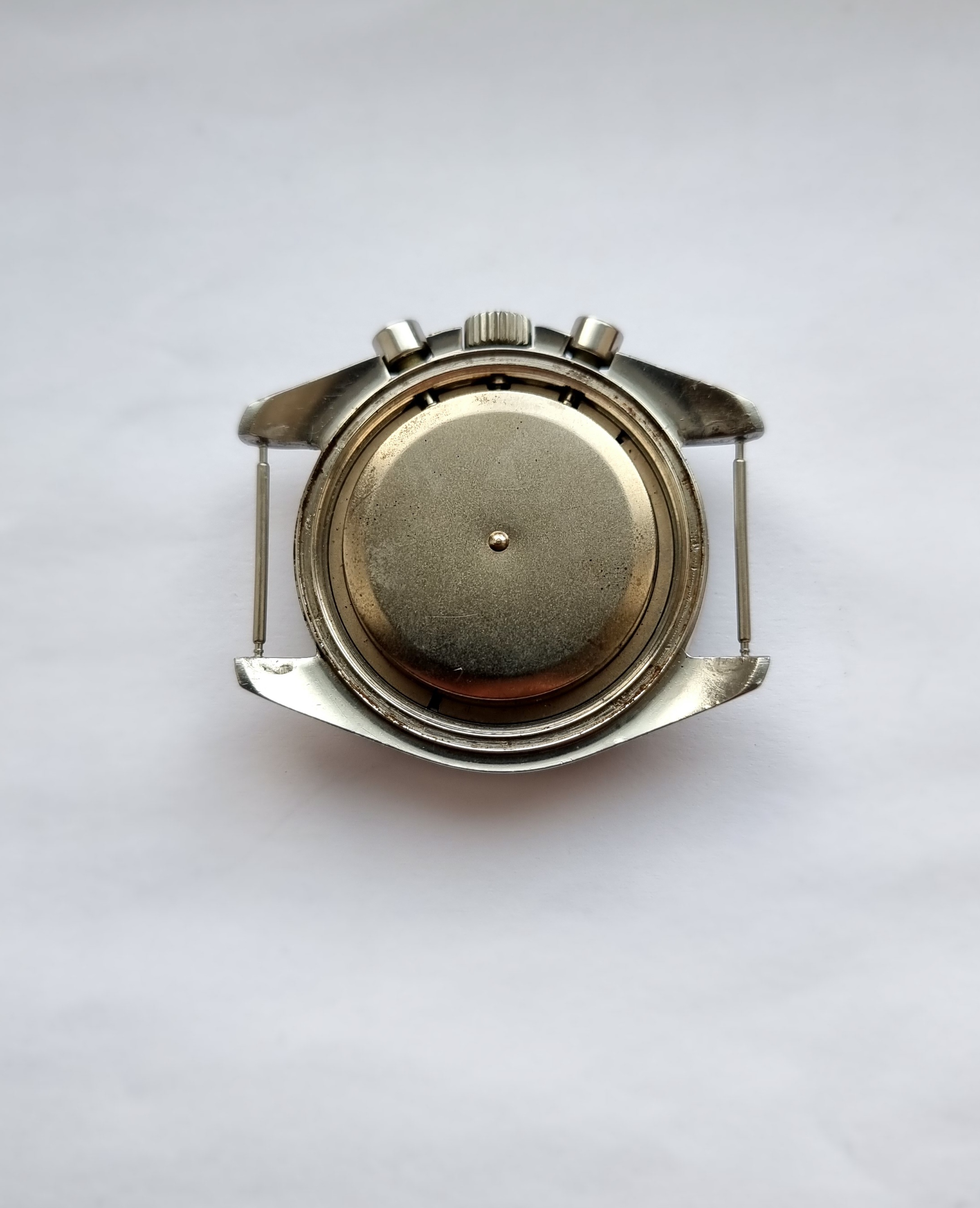 The case appears unpolished to me with only a few lights marks commensurate with age, the watch +50 years old after all. The case back still retains a sharp engraving. Original A3 wide crown and wide/tall pushers.