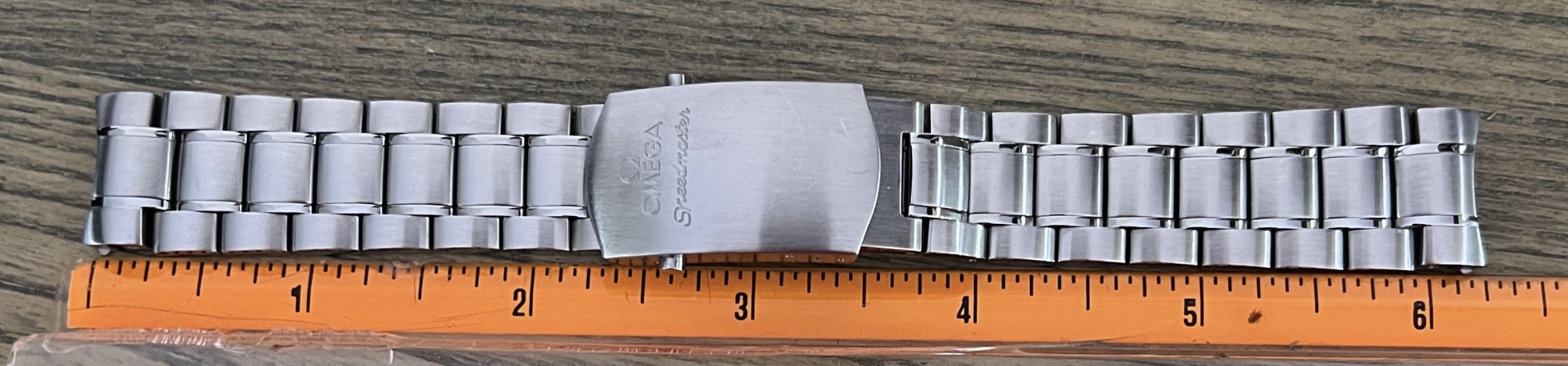 ·For sale ($360 OBRO) I have a Omega Speedmaster 1564/975 19 MM bracelet, reference 020ST1564975. The 1564/975 steel bracelet use the pins and tubes on the links (older style) and is part of the Speedmaster racing series watches, but it is also a direct fit for the Omega Speedmaster CK2998 (Reference 311.33.40.30.02.001), the Speedmaster First Omega in Space, FOIS (Reference 311.32.40.30.01.001), the CK2998 2018 Basel released Pulse Meter (311.32.40.30.02.001) as well as the older 40 MM Speedmaster Racing, Date and Day-Date models. I tried the bracelet on a 36 MM Omega Railmaster 2504.52 and fitted as well, so also possible to be used on the 36 MM Railmaster and Aqua Terra series of watches.
