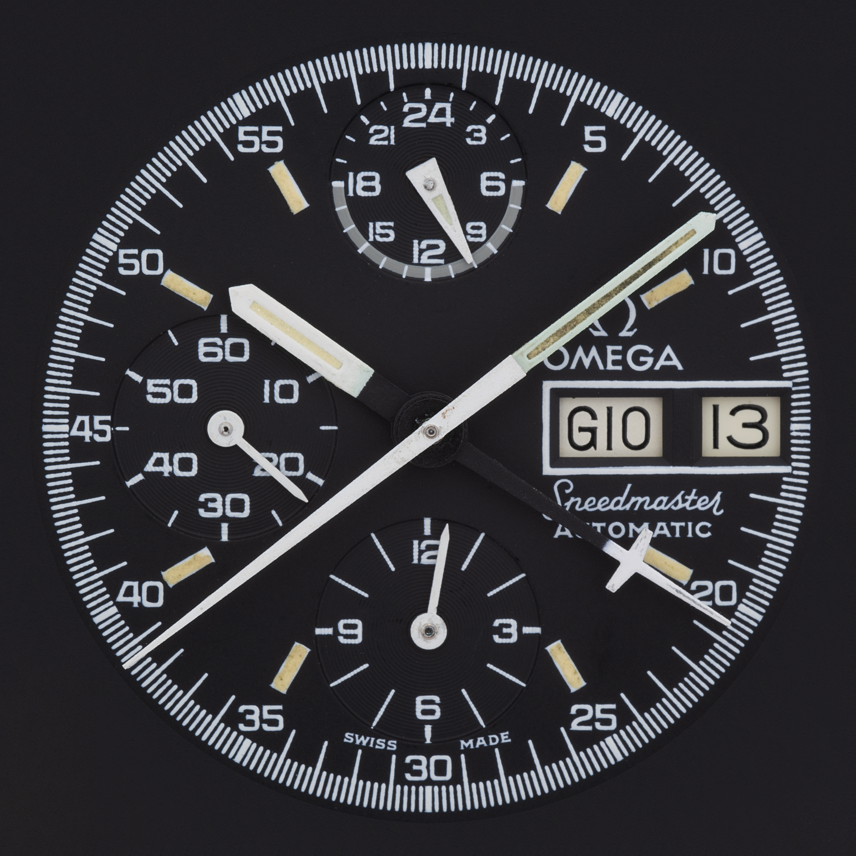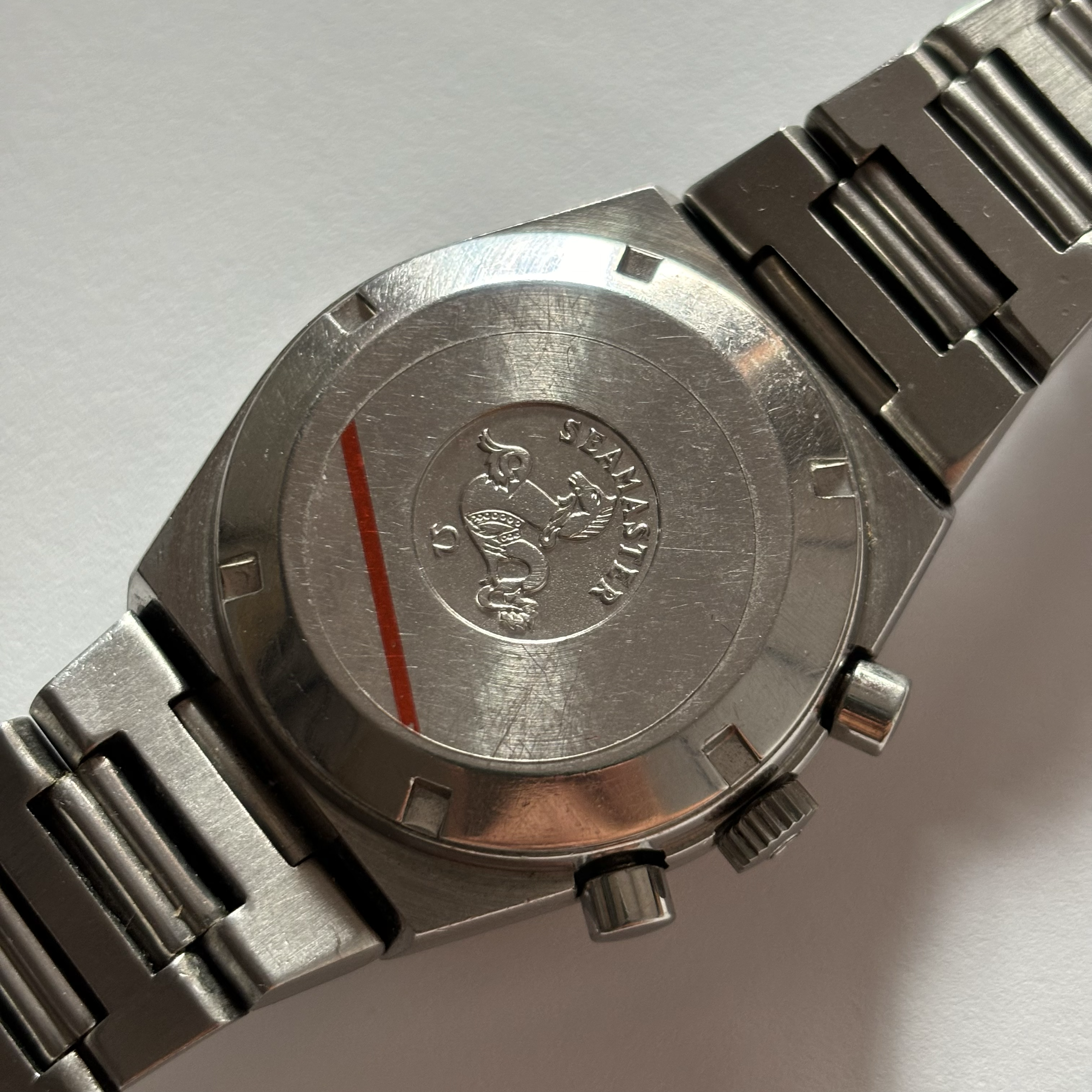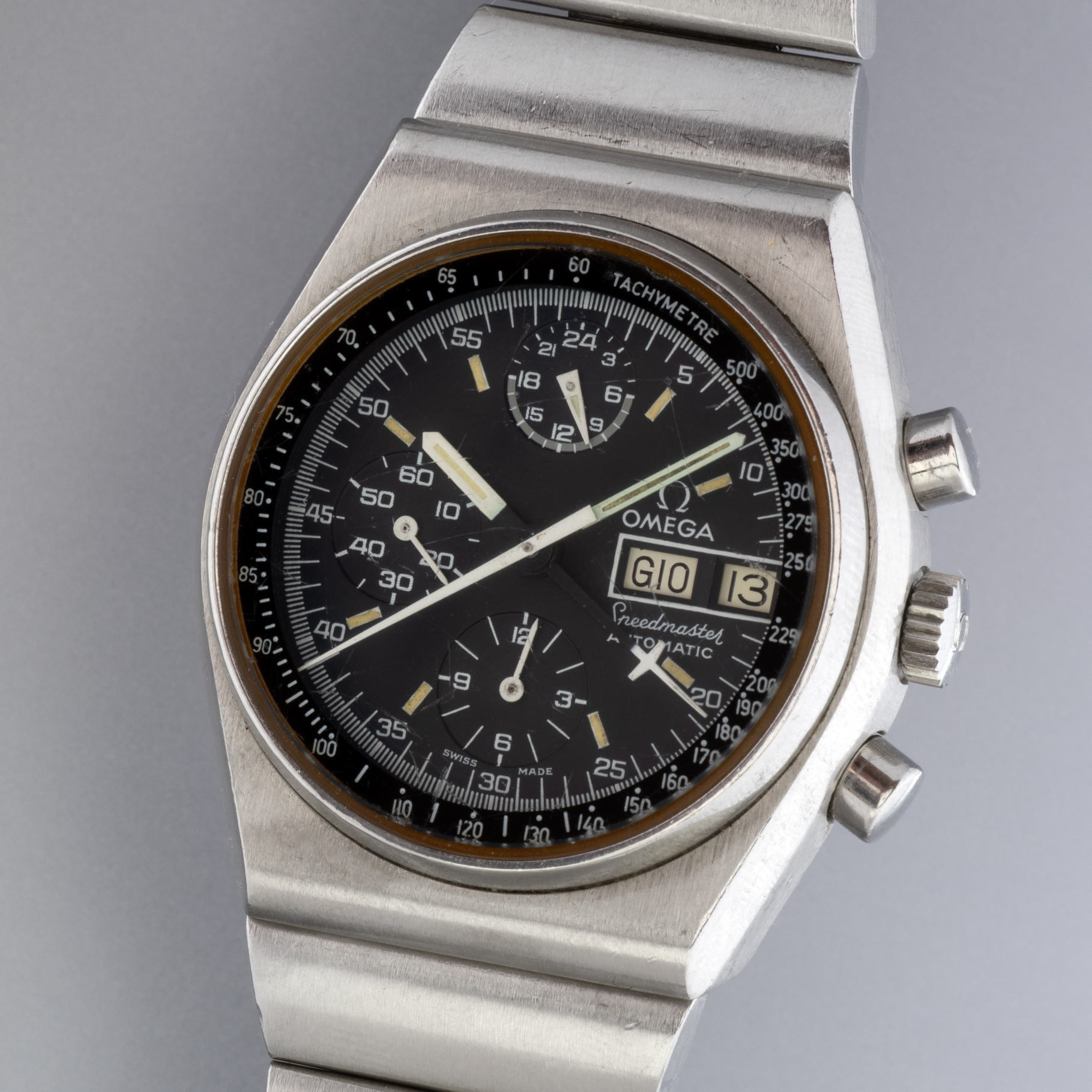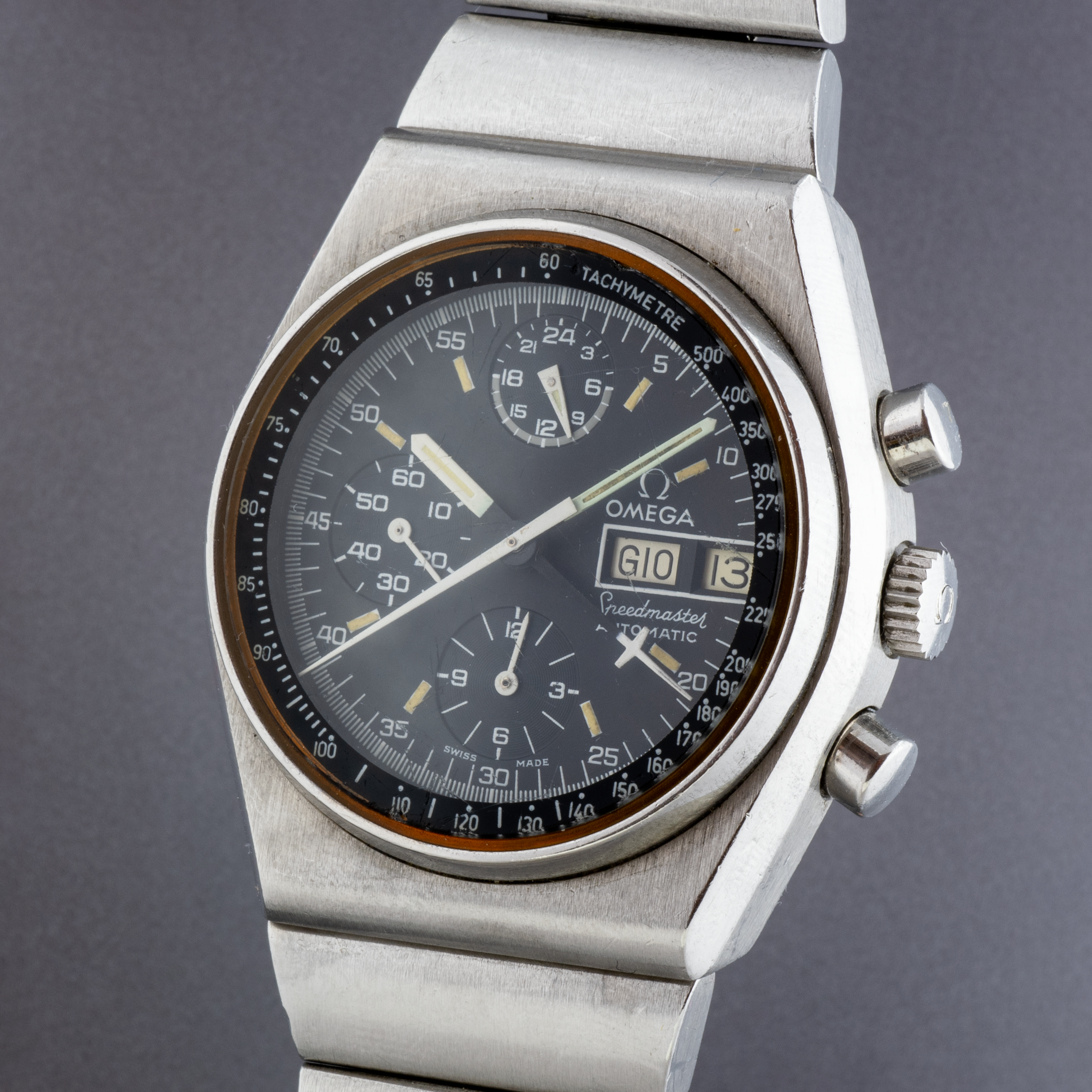 The dial is perfect keeping the tritium indices. The glass is the original one, presenting some scratch. The case is not polished and the integrated bracelet bracelet is very tight. The watch works fine, keeps the time and the chronology functions as it should.