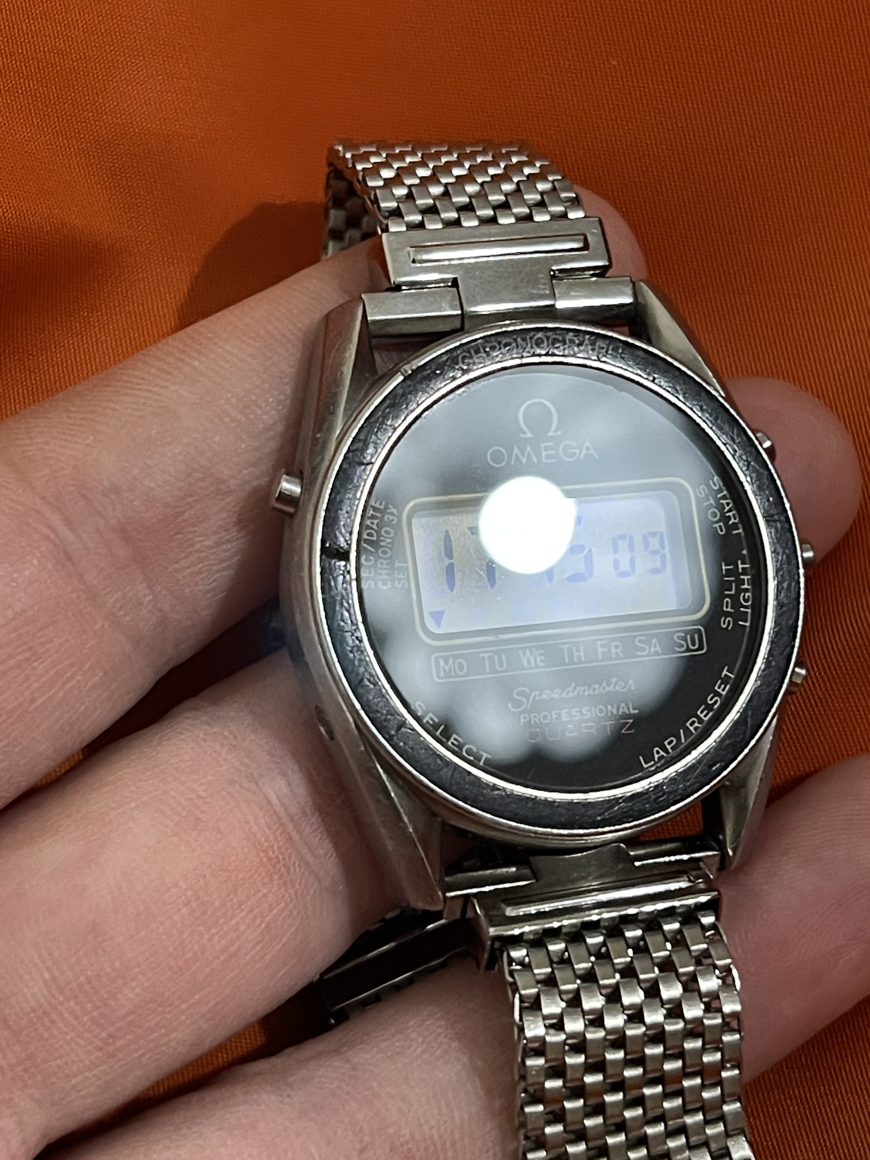 There is a crack in the bezel at 10. This piece is not available in Omega and difficult to find second hand, so I left it as it was and the price is taking it into account. I own the watch since few years and the Bezel didn't change, but it is possible to fill the crack with an epoxy solution to stabilize and cover it. Once again I choose to maintain originality.