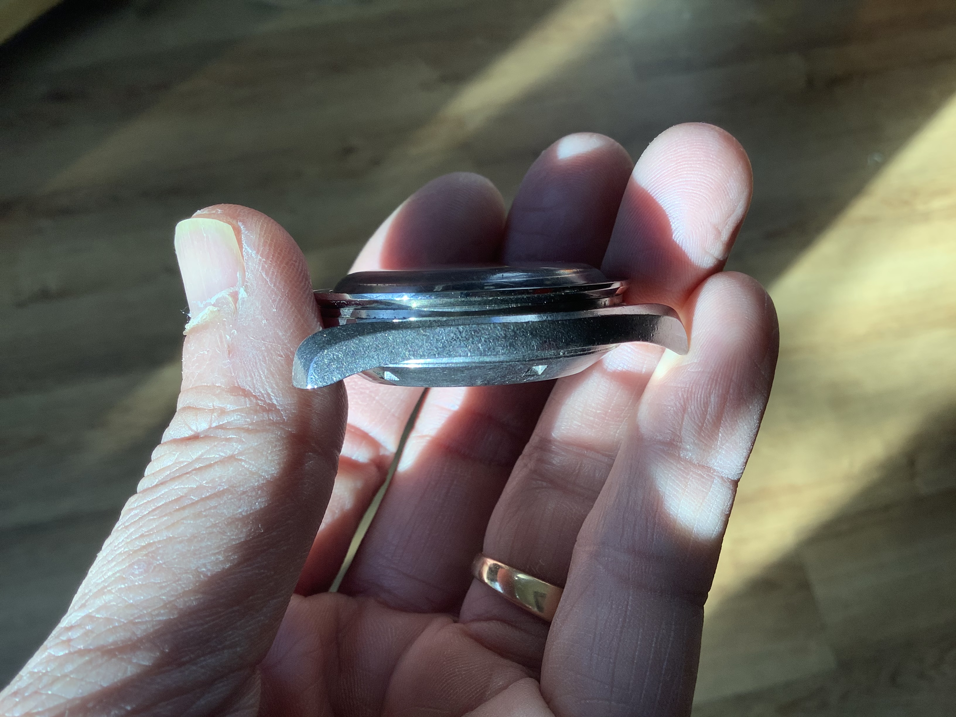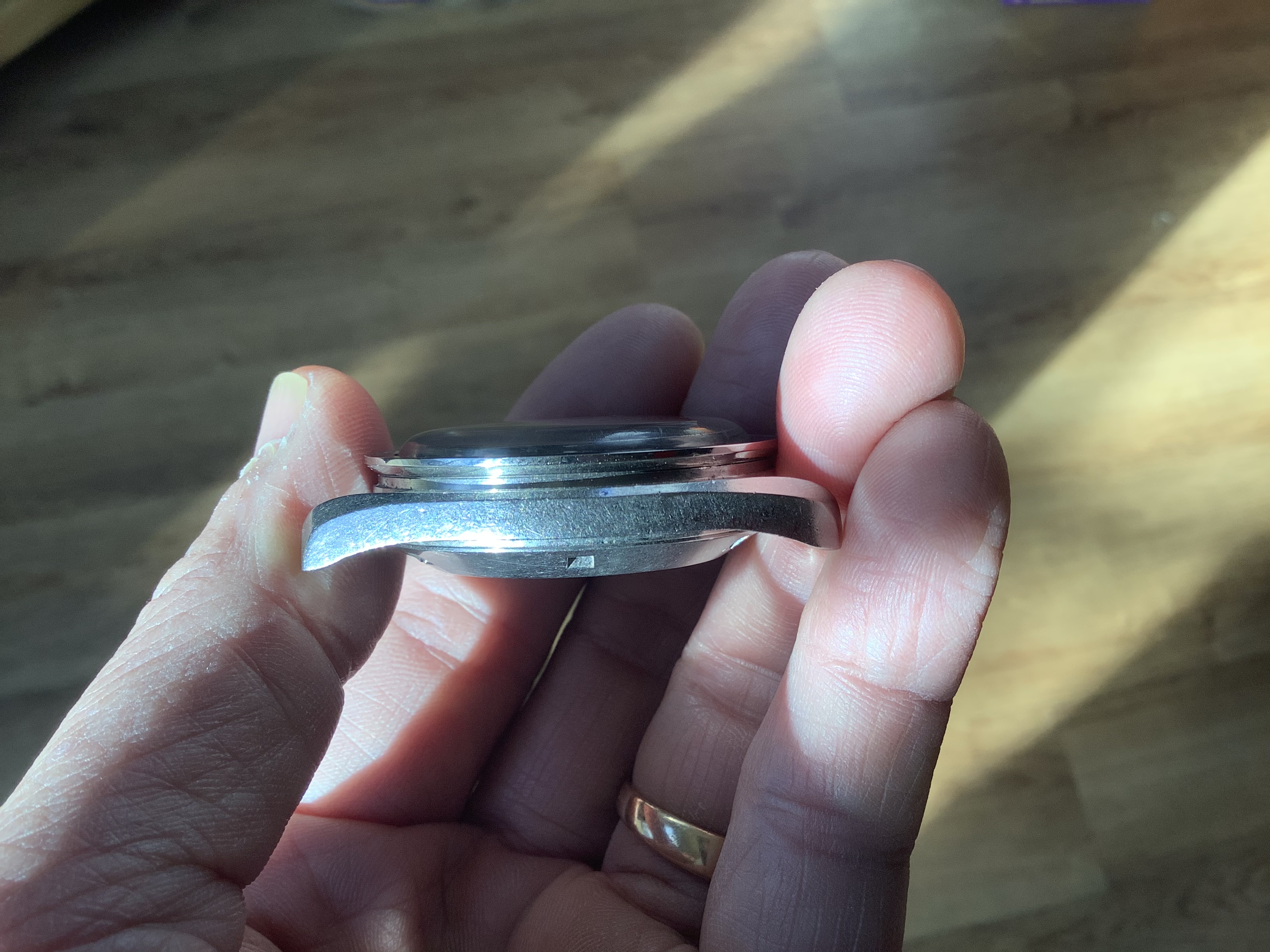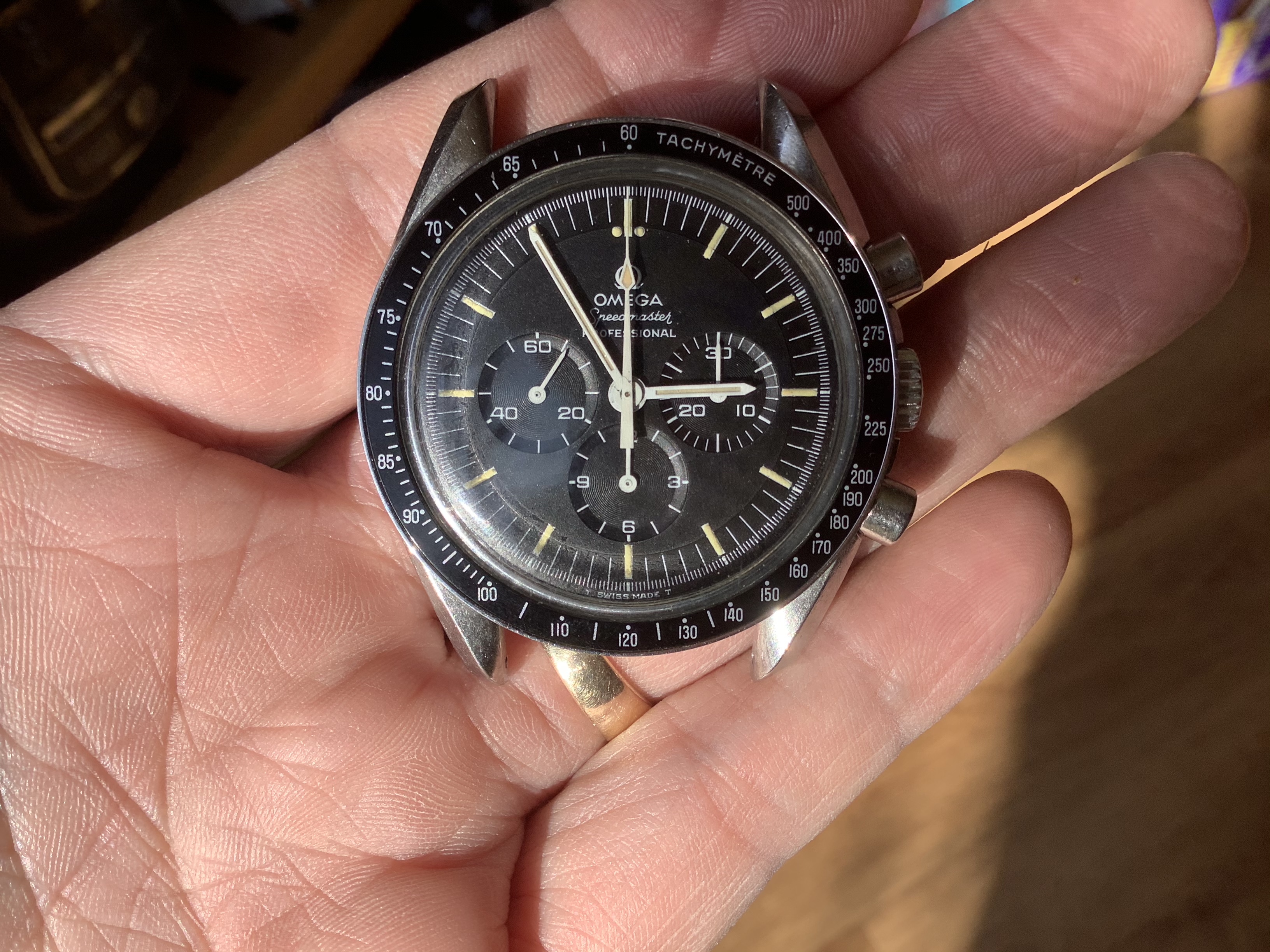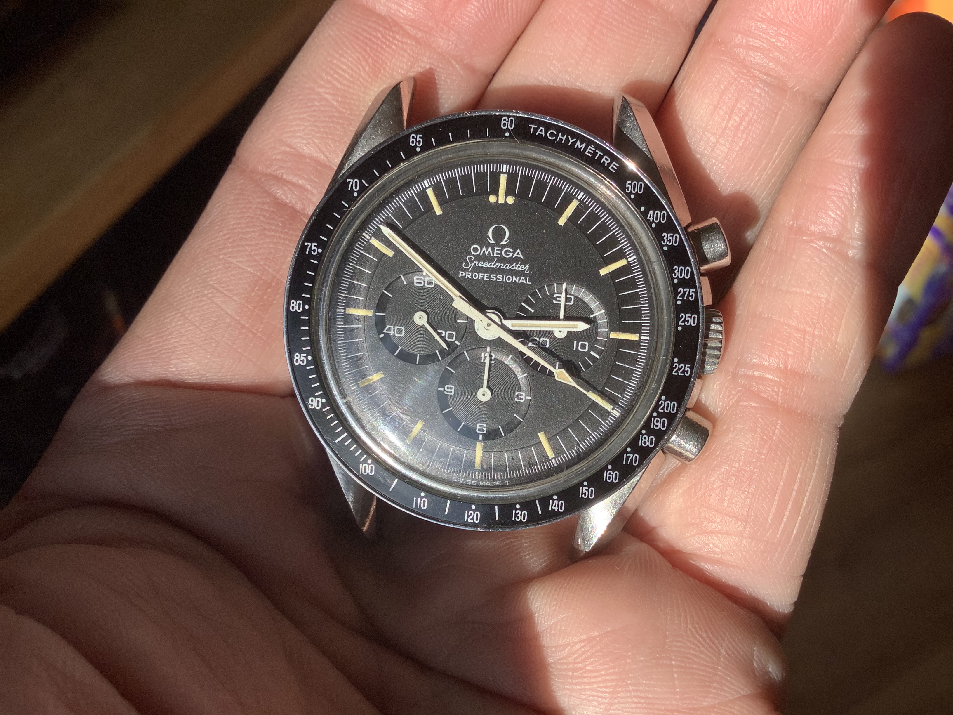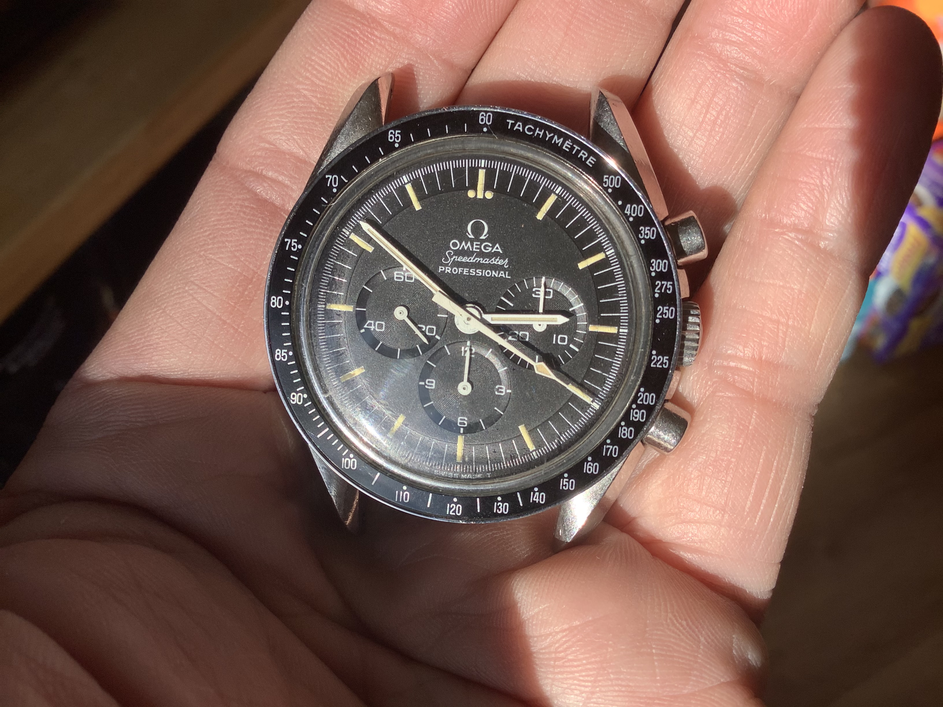 ·Up for sale is an Omega Speedmaster 1969. Looks unpolished to me. Case, caseback, crystal, crown, bezel have scratches and nicks from use. The movement looks very clean and could have never been serviced as the screw heads look untouched to me. 29xxxxxx serial. It does have a newer genuine omega bezel. 20mm lug width. Case is approximately 40mm without the crown. Caseback is worn and has a light engraving but it’s very hard to see with the naked eye. Dial is beautiful with wonderful patina. No missing lume.