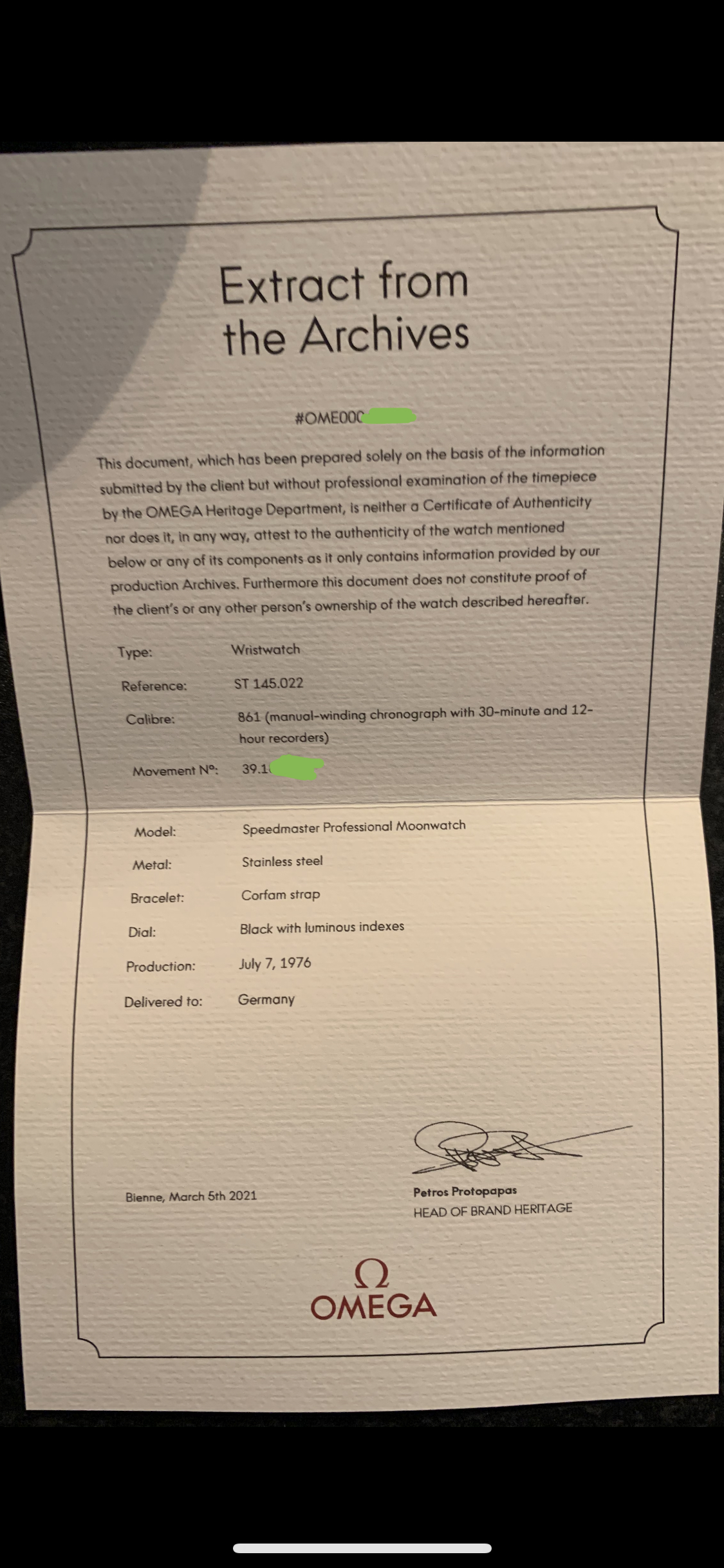 My 1976 1450.022 watch came with this box and papers stamped 2011 which is the country code for USA. I ordered an EOA which states the watch was delivered to Germany in 1976. The guy were I bought the watch from told me he bought the watch at a US base in Germany during the 70’s. Does this all make sense to say Germany on the EOA?